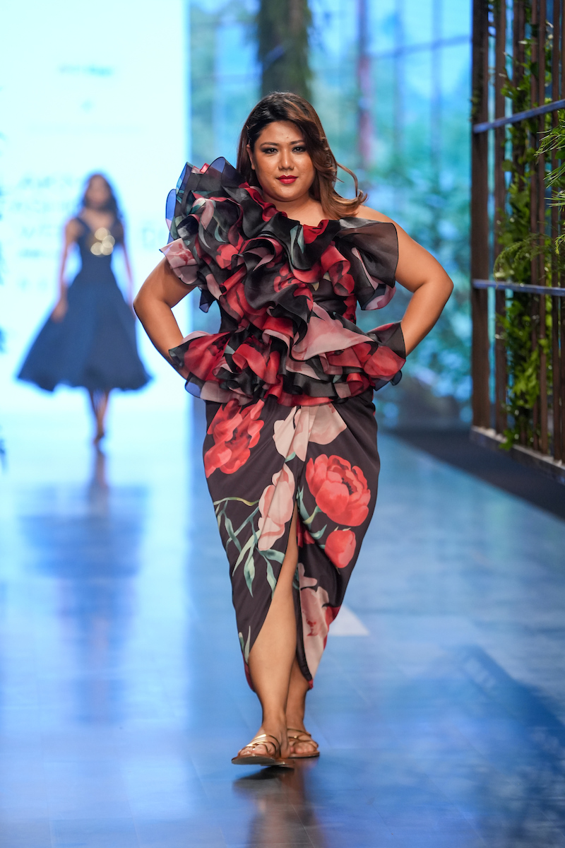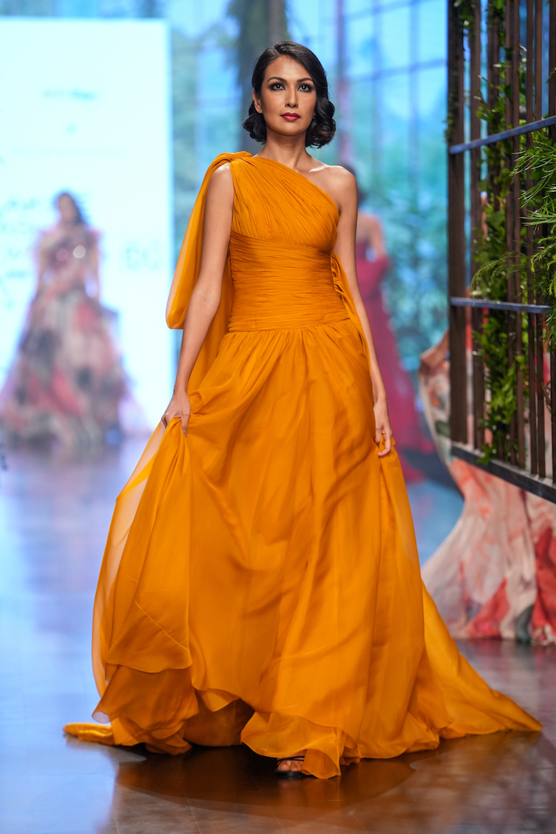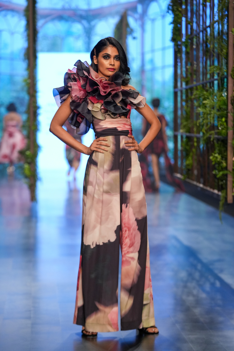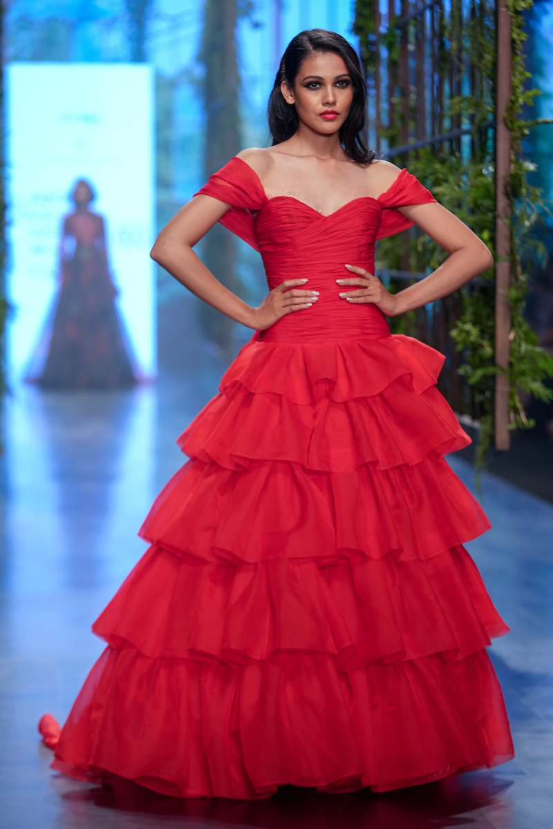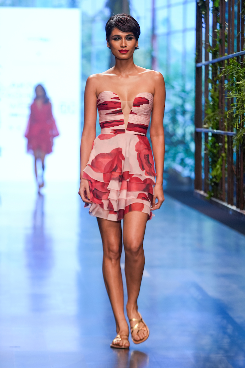 This year’s spring-summer line has a richly dark and dreamy tone to it, inspired by the starkly contrasting colours of night time botanical illustrations. The styles are fluid and breezy, depicting glamour at its peak, although with a certain laid back elegance. Light airy dresses and flowing gowns have been fashioned in a rich colour palette using featherweight fabrics such as chiffons, crepes and organzas. Easy to wear dresses and jumpsuits in signature floral prints along with red carpet worthy Grecian silhouettes have been designed in vintage ivory and standout lipstick-red amongst other deep jewel tones.