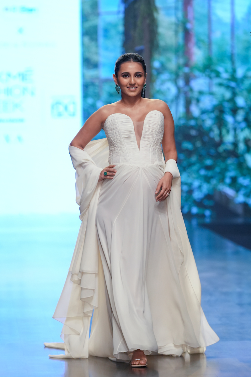 Though florals have always been a mainstay of the brand, Gauri & Nainika’s love for botanicals was further intensified by a pandemic driven work-from-home stint during which time the sisters became passionate about gardening. Among other motifs, the brand pays tribute to the classic rose, adding intense romanticism and femininity to the line. With classic corsetry, Greco-Roman inspired fluted bodices and flowing drapes, the R|Elan X Gauri & Nainika collection covers a spectrum of silhouettes that flatter diverse body types.