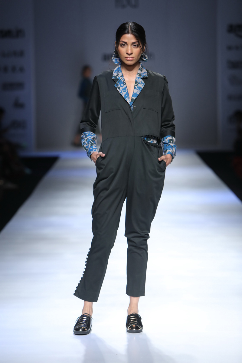 The colours are inspired by the military uniform. Different shades of green are used. The print is derived from the camouflage patterns and is created by using floral motifs.