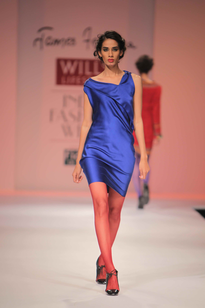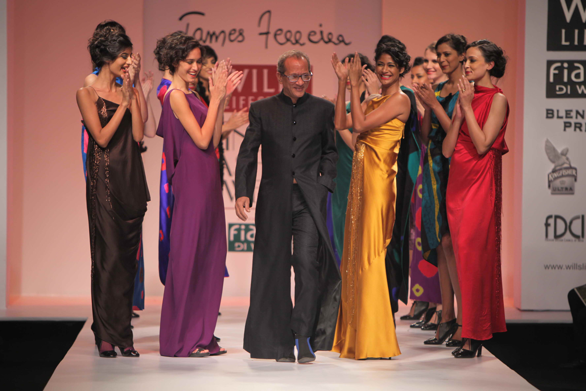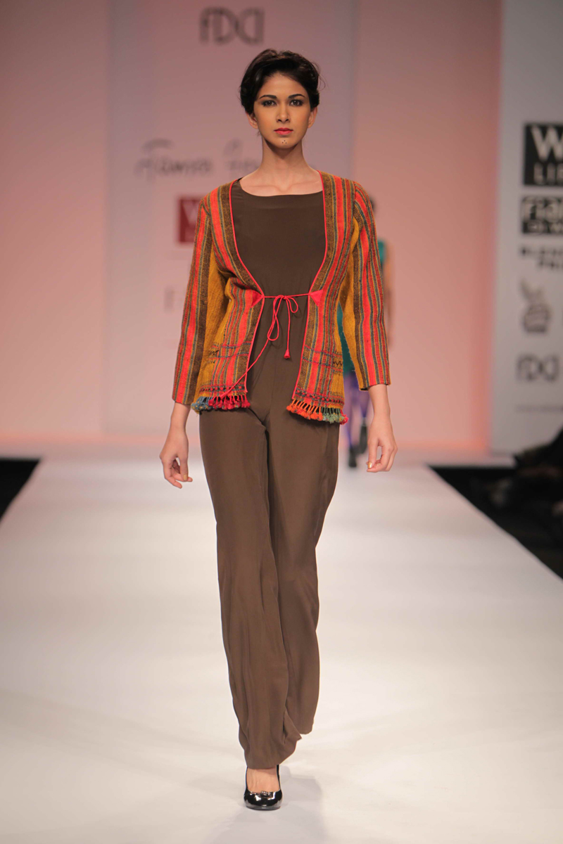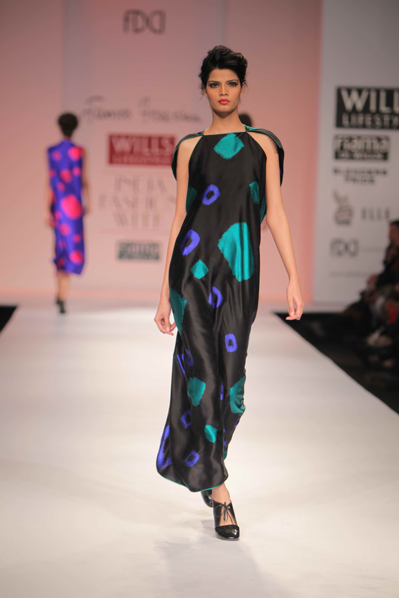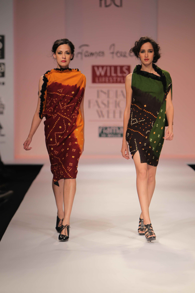 For Autumn/Winter 2012/13, James Ferreria carries forwardnhis love affair with Khadi. Woolen shawls of Gujrat, oversizednbandhani shirt dresses and trousers are paired with vibrantnhand dyed, hand woven woolen khadi shawls. Their rich colorsninspire a line of winter batiks on wool crepe and draped andnsculpted satin cocktail dresses and gowns.