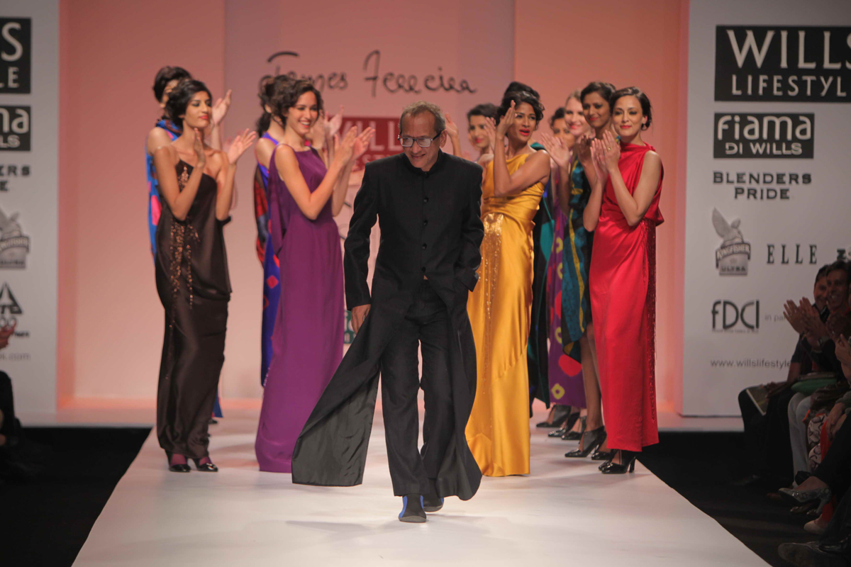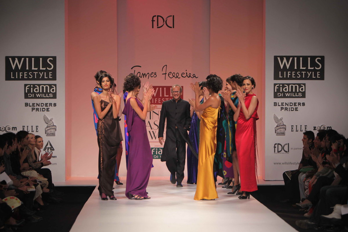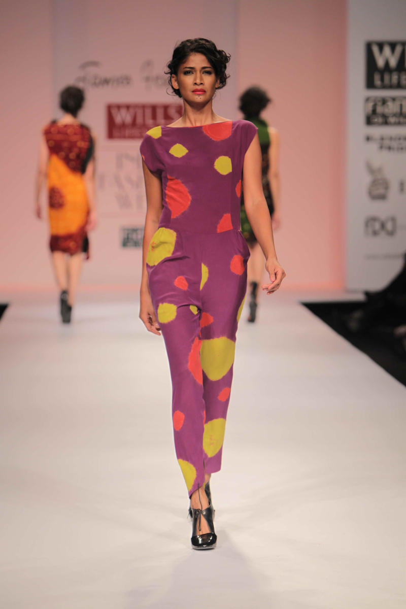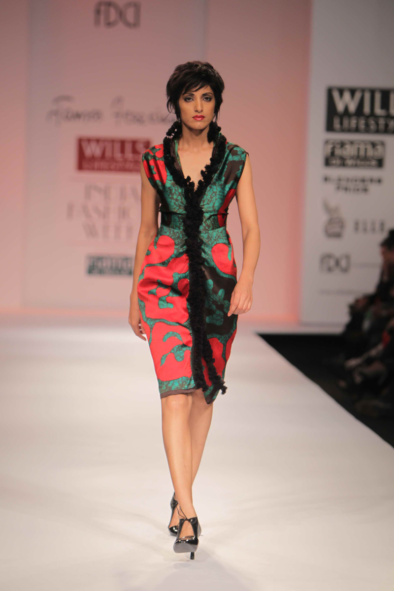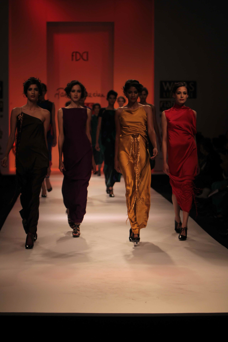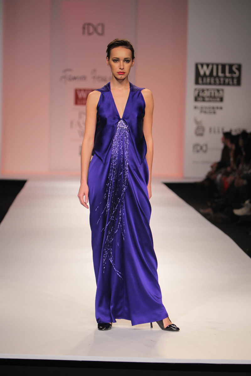 For Autumn/Winter 2012/13, James Ferreria carries forwardnhis love affair with Khadi. Woolen shawls of Gujrat, oversizednbandhani shirt dresses and trousers are paired with vibrantnhand dyed, hand woven woolen khadi shawls. Their rich colorsninspire a line of winter batiks on wool crepe and draped andnsculpted satin cocktail dresses and gowns.