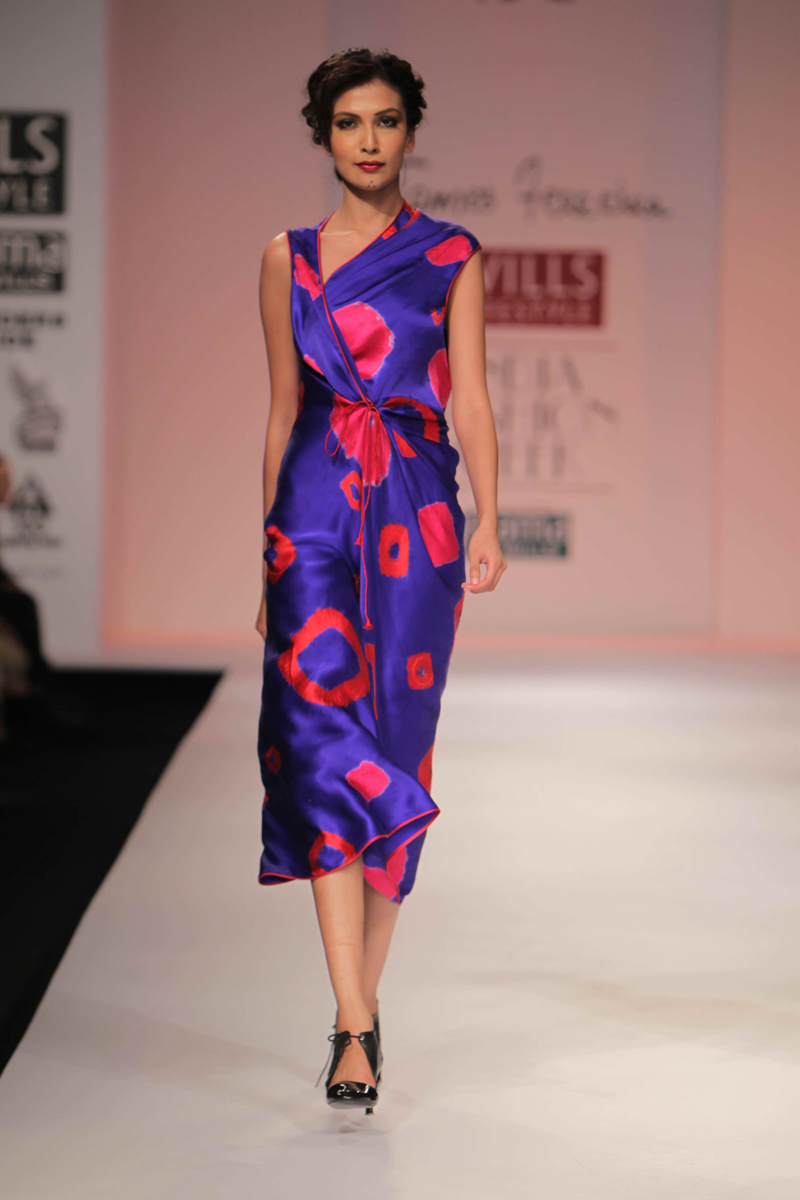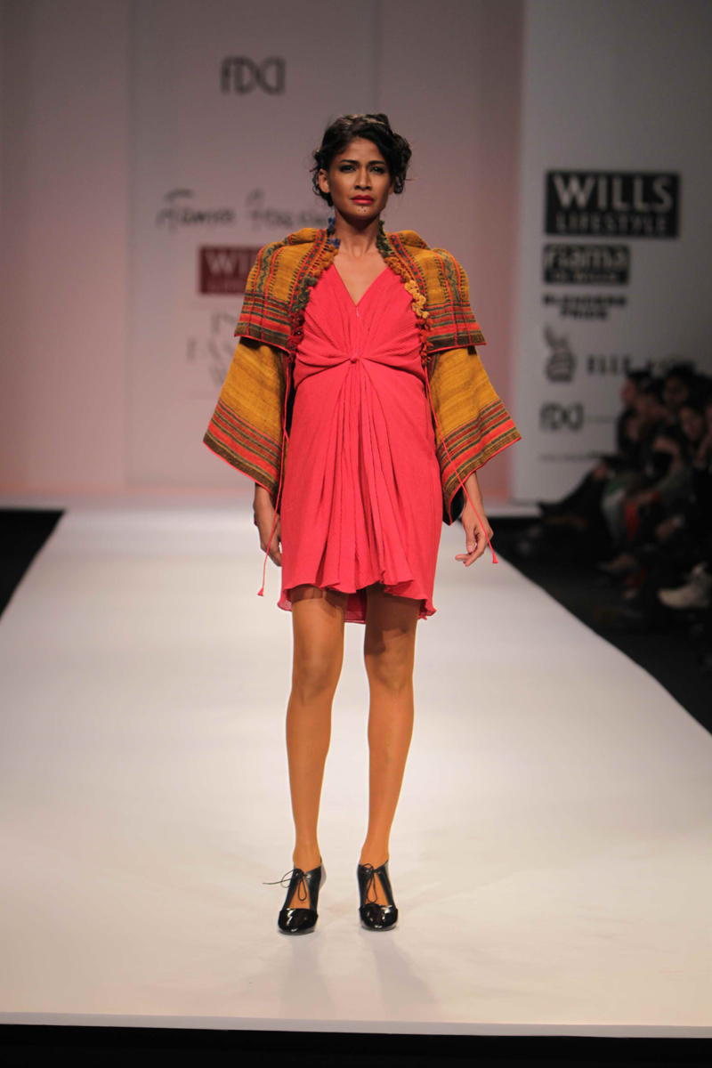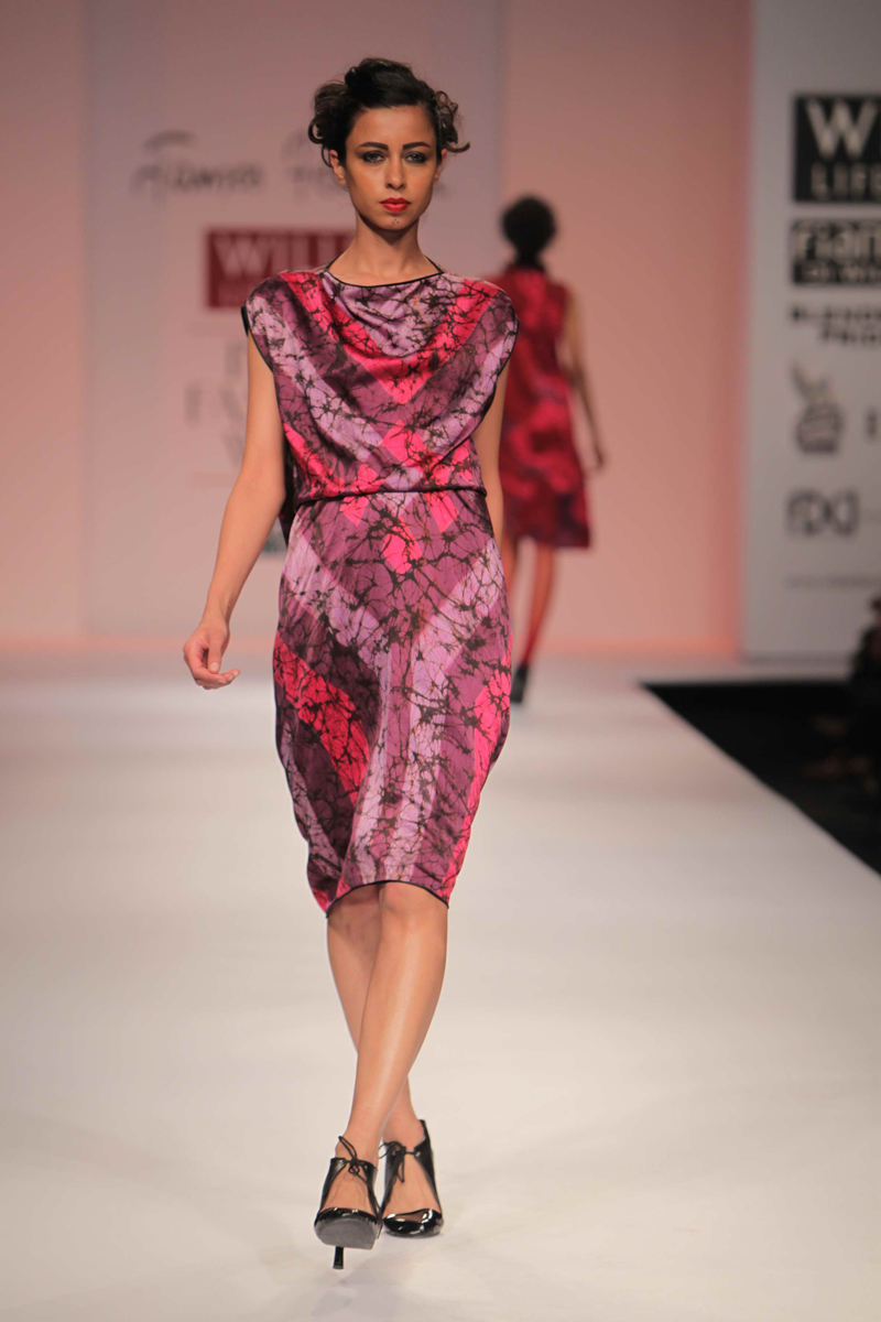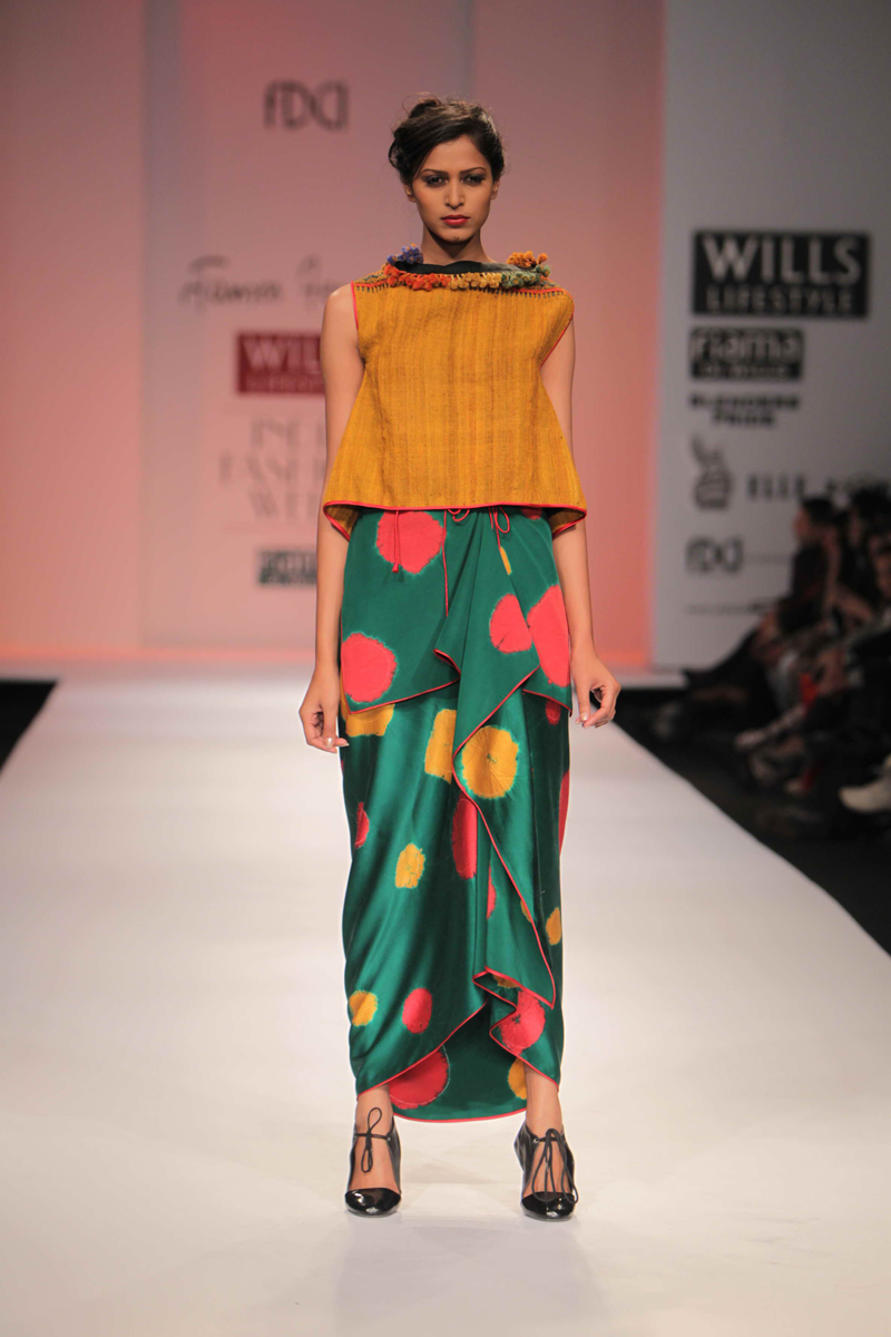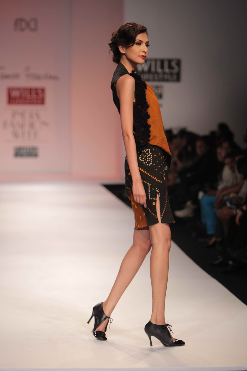 For Autumn/Winter 2012/13, James Ferreria carries forwardnhis love affair with Khadi. Woolen shawls of Gujrat, oversizednbandhani shirt dresses and trousers are paired with vibrantnhand dyed, hand woven woolen khadi shawls. Their rich colorsninspire a line of winter batiks on wool crepe and draped andnsculpted satin cocktail dresses and gowns.