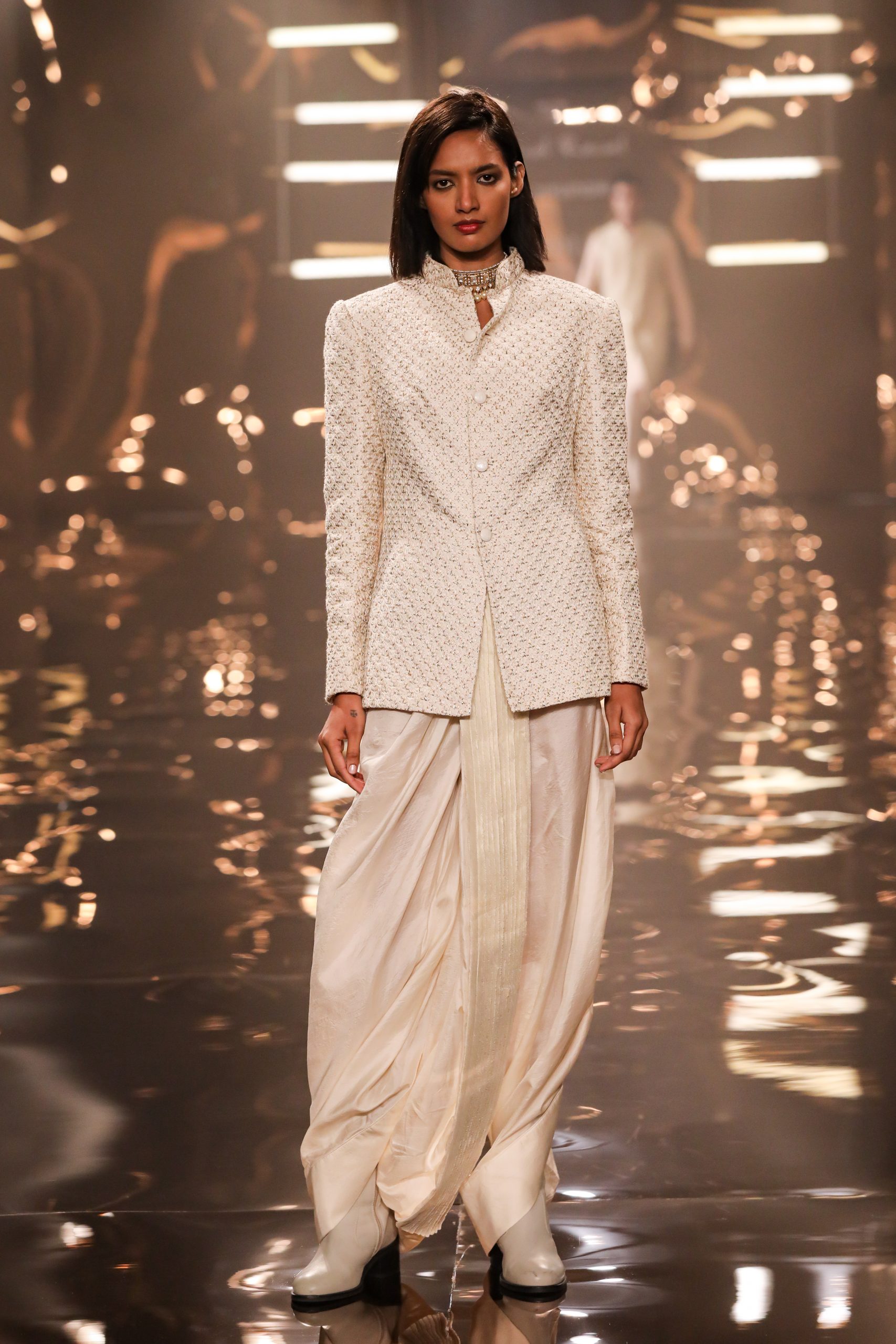 The pieces in the collection are subtle, yet statements in their own right. They are urban, nostalgic and relevant, while being consistently rooted in luxury. Each signature silhouette is reimagined in innovative architectural shapes, and textures play a significant role throughout. From intricate thread dipped pieces and embroidery to surface embellishments in the form of 3-dimensional motifs and the creation of their own signature fabrics – the garments are thoughtfully crafted to create an immersive tactile experience.