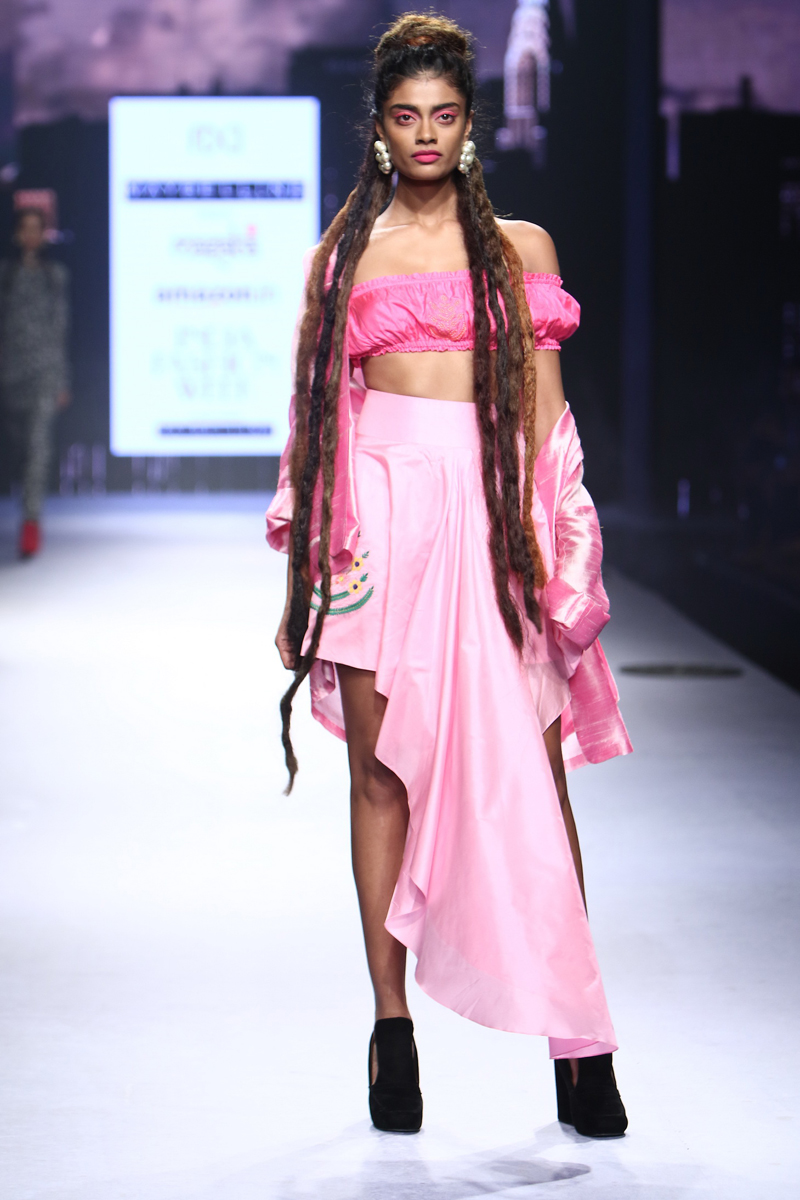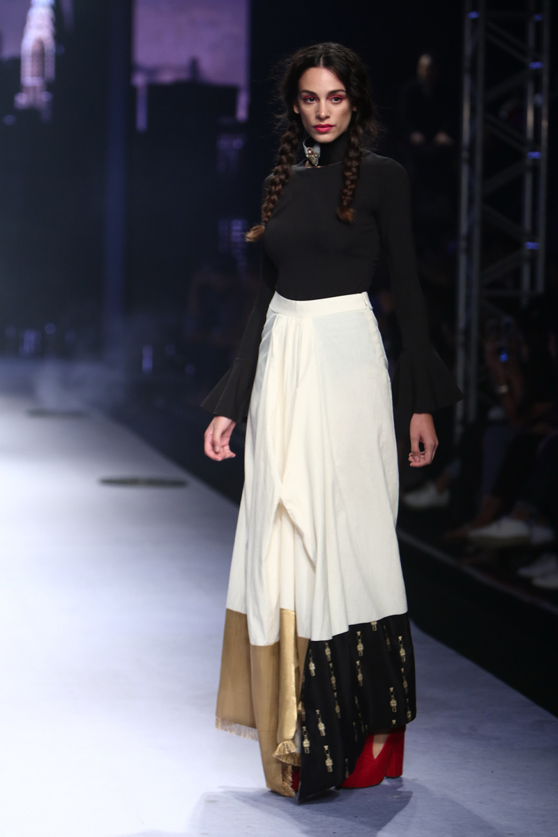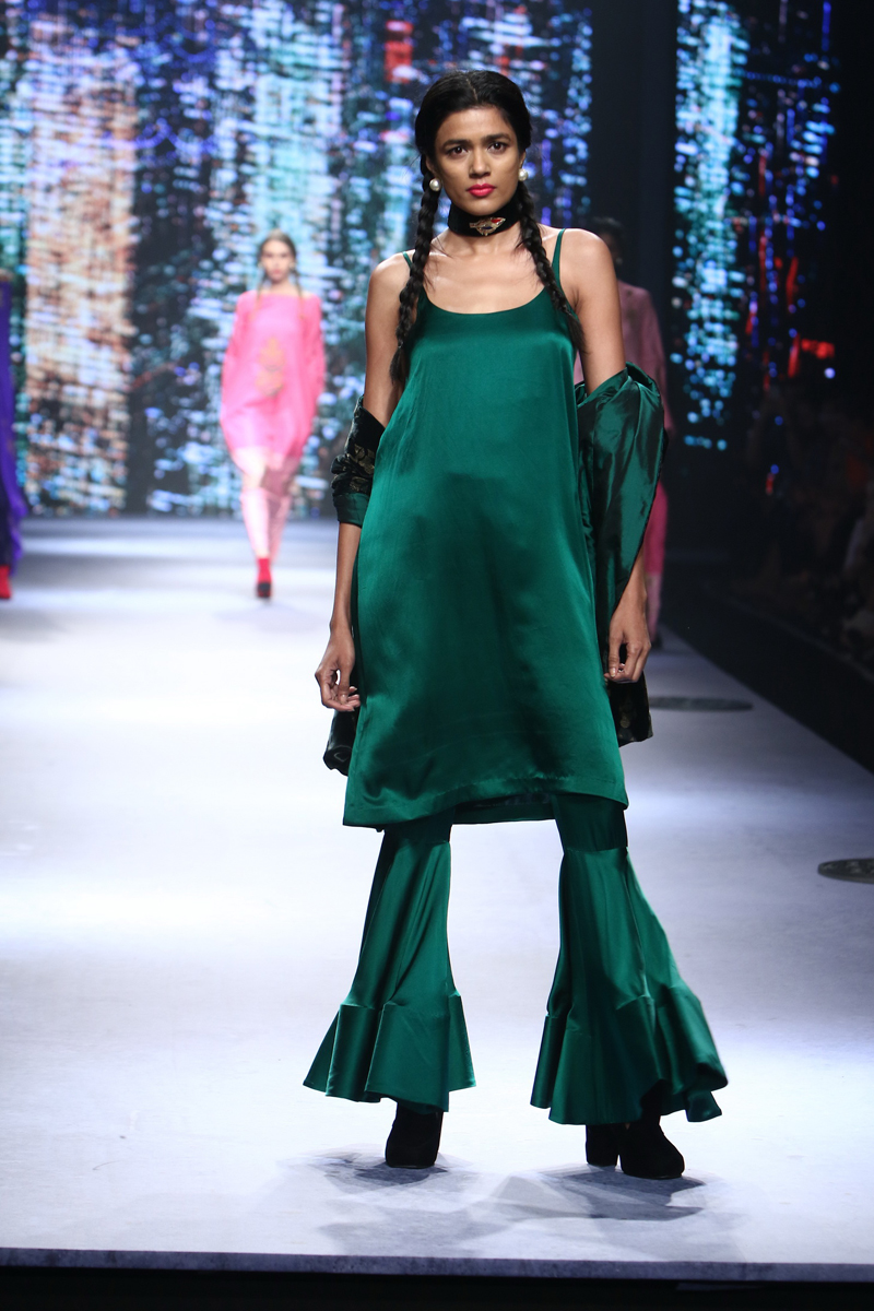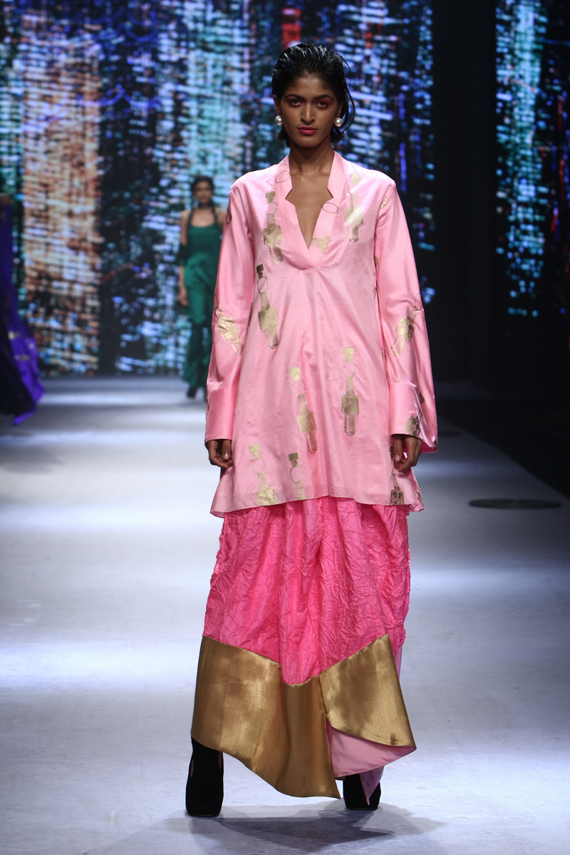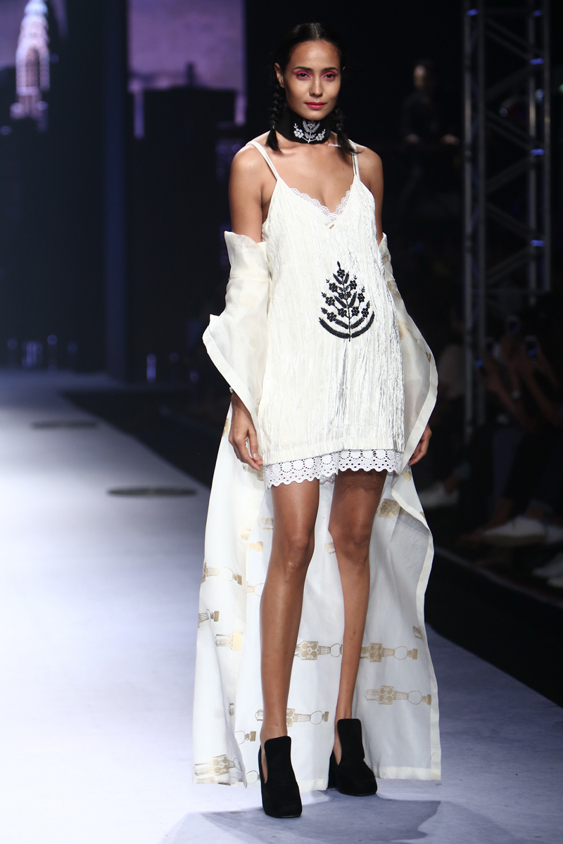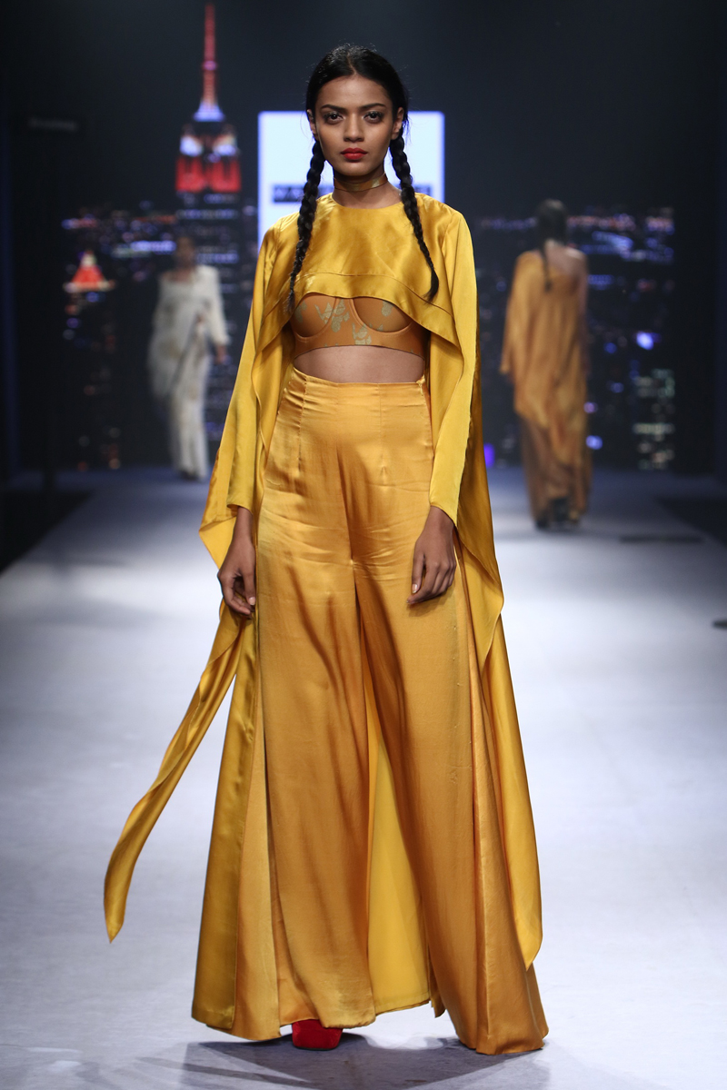 The Spring/Summer 2017 collection at Amazon India Fashion Week captures the mood of the perfect cocktail hour on a New York sidewalk. The collection brings out the diversity in dressing in the cultural melting pot that is New York. Chic, classic, yet folksy the separates in the line are a perfect marriage between delicate & power dressing for any young women. A monochrome palette dominates with bursts of tone-on-tone ensembles in shades of cherry, pink, green & a luxe electric blue. The silhouettes are an embodiment of progressive Indian wear, featuring capes with peek-a-boo bustiers, bell bottoms with slinky slips, sensuous drapes with oversized shirts baring the décolletage in rich charmeuse satin, block printed velvet & fine plush silks. Alongside prêt looks that effortlessly convert into night- time pieces, the line also consists of shift dresses with constructed jackets , oversized silk shirts ,cropped hakoba shirts with thigh-high slit skirts , boudoir- dressing inspired suit-sets, cool knit tops highlighted with pearls , sequins and vintage Indian motifs which are perfect for the quintessential Boss Woman.