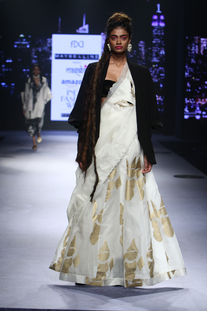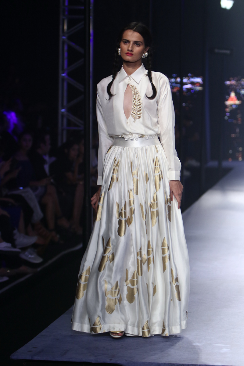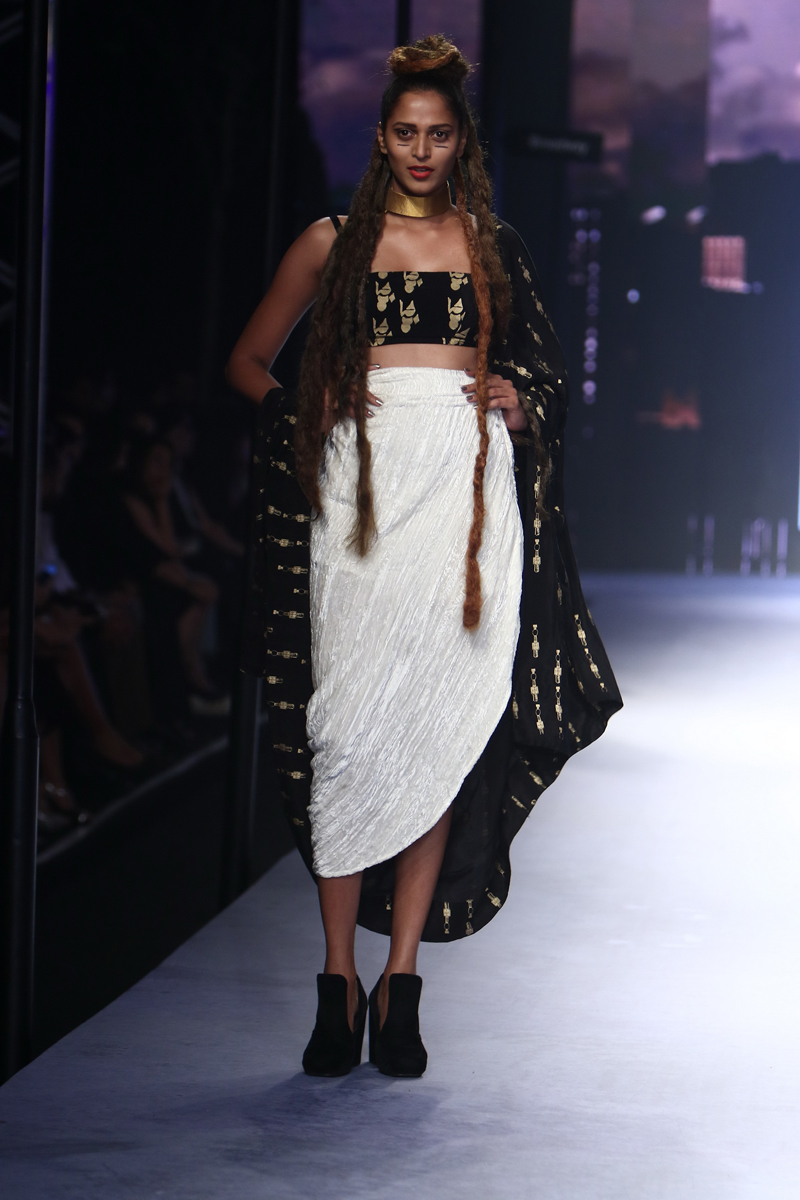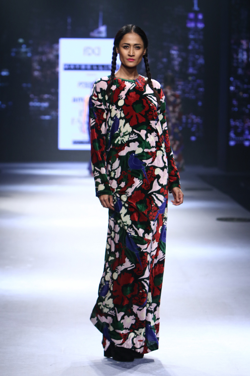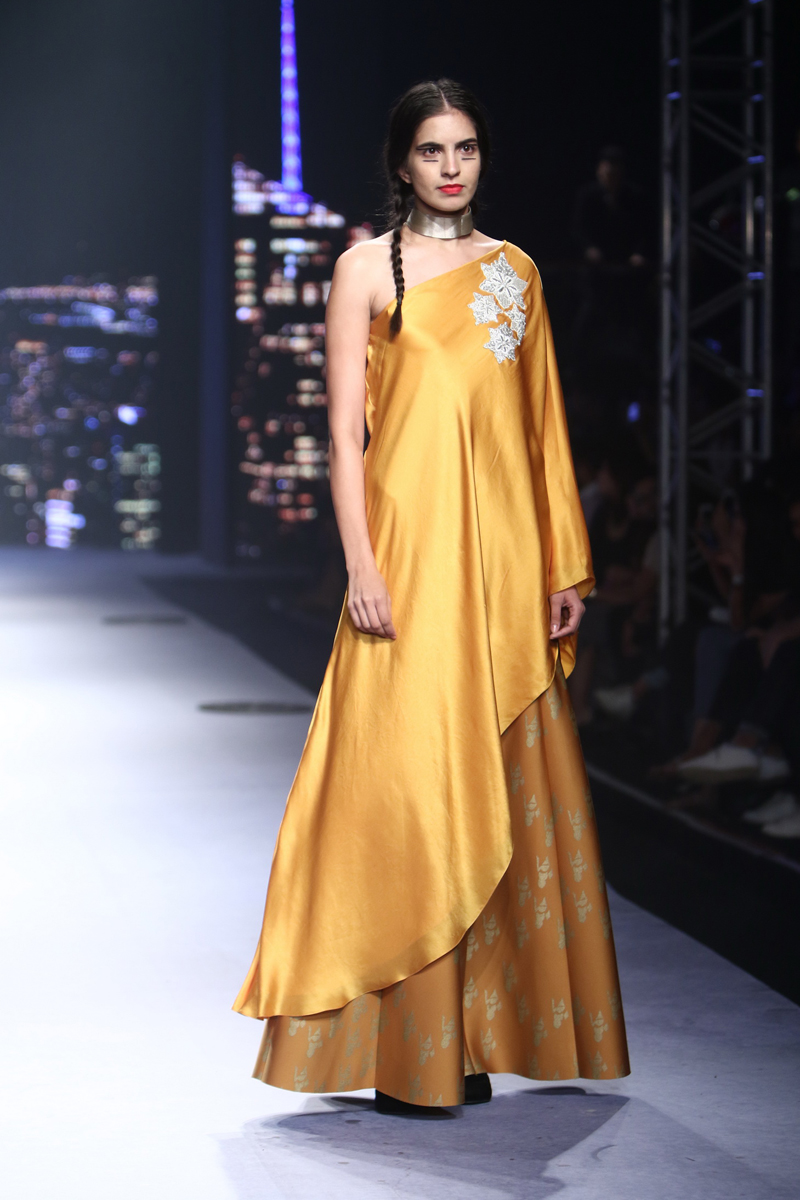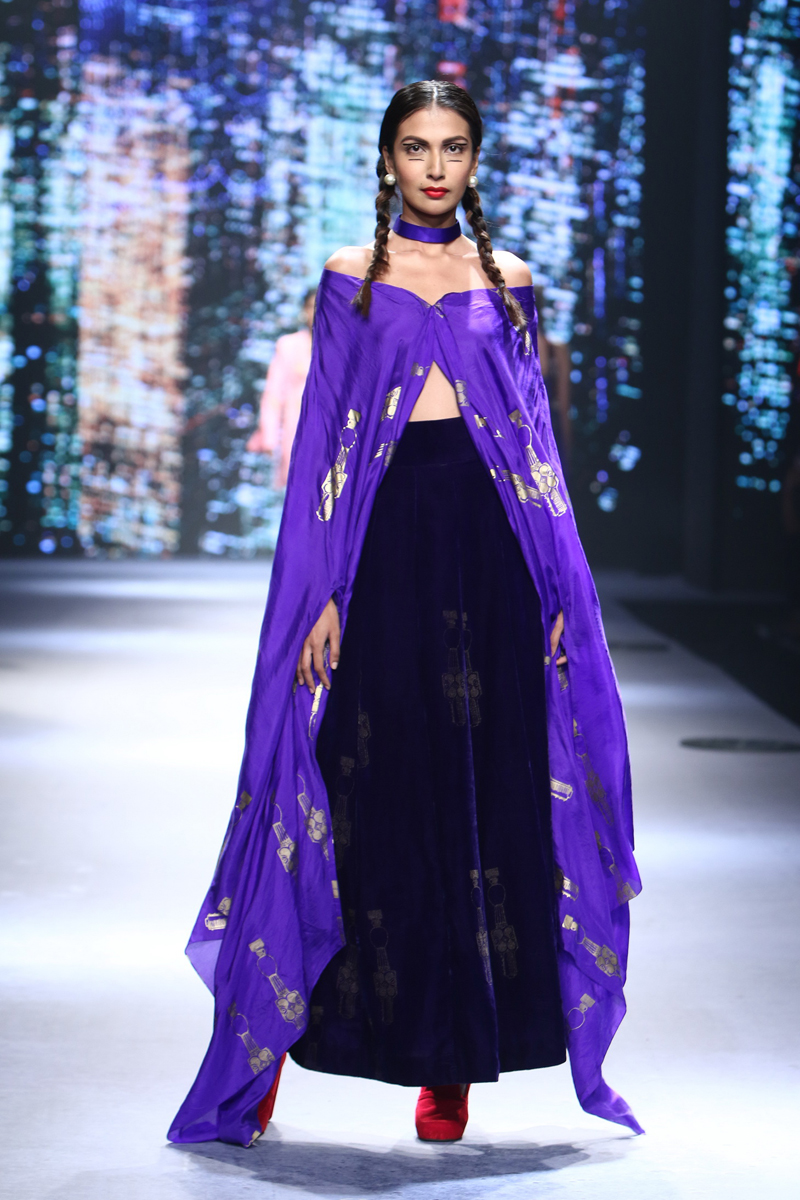 The Spring/Summer 2017 collection at Amazon India Fashion Week captures the mood of the perfect cocktail hour on a New York sidewalk. The collection brings out the diversity in dressing in the cultural melting pot that is New York. Chic, classic, yet folksy the separates in the line are a perfect marriage between delicate & power dressing for any young women. A monochrome palette dominates with bursts of tone-on-tone ensembles in shades of cherry, pink, green & a luxe electric blue. The silhouettes are an embodiment of progressive Indian wear, featuring capes with peek-a-boo bustiers, bell bottoms with slinky slips, sensuous drapes with oversized shirts baring the décolletage in rich charmeuse satin, block printed velvet & fine plush silks. Alongside prêt looks that effortlessly convert into night- time pieces, the line also consists of shift dresses with constructed jackets , oversized silk shirts ,cropped hakoba shirts with thigh-high slit skirts , boudoir- dressing inspired suit-sets, cool knit tops highlighted with pearls , sequins and vintage Indian motifs which are perfect for the quintessential Boss Woman.