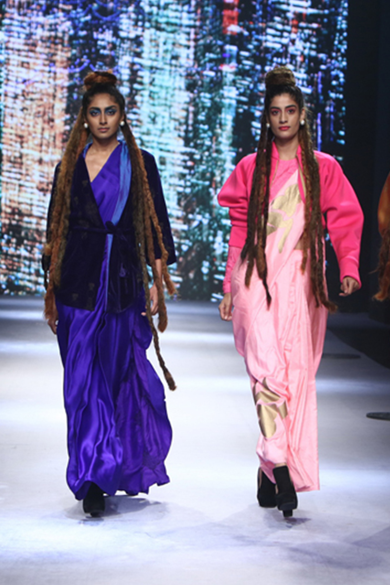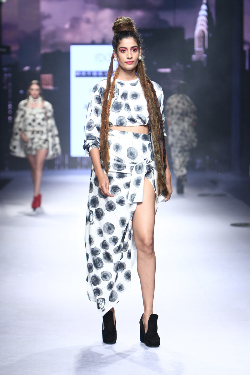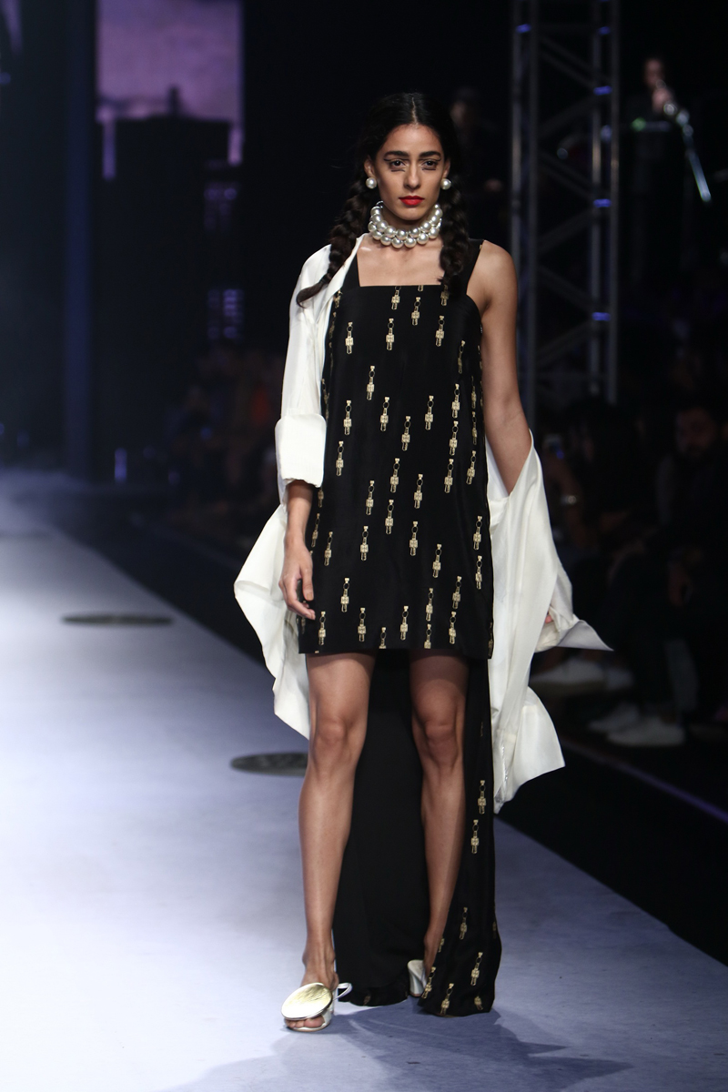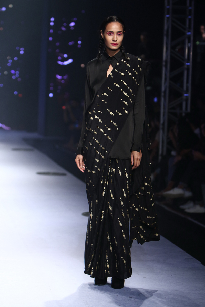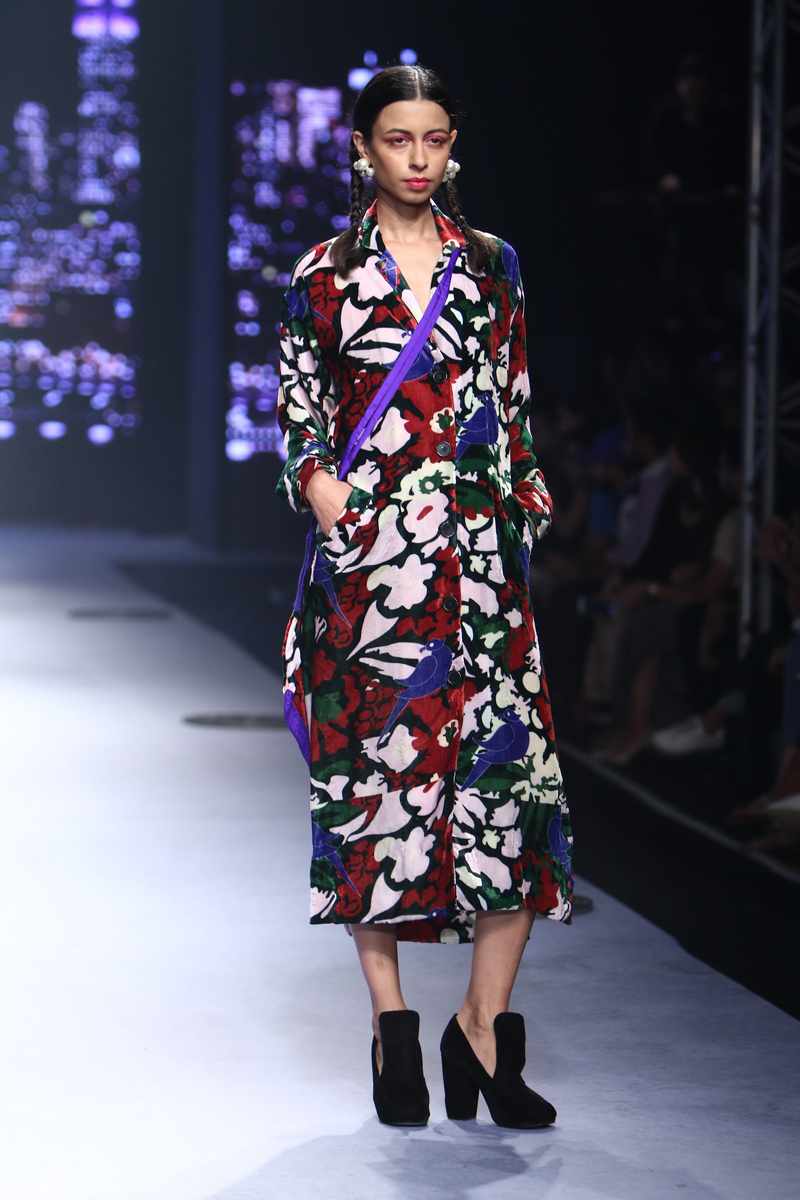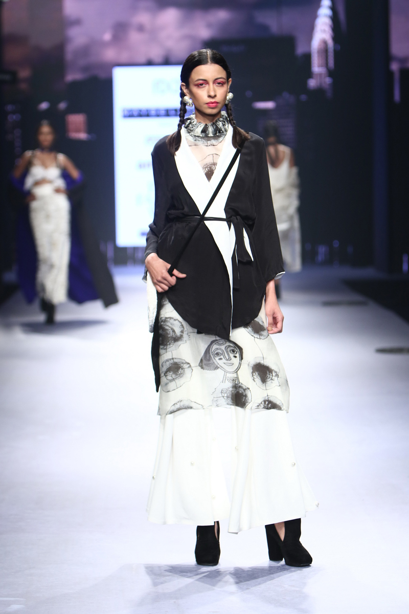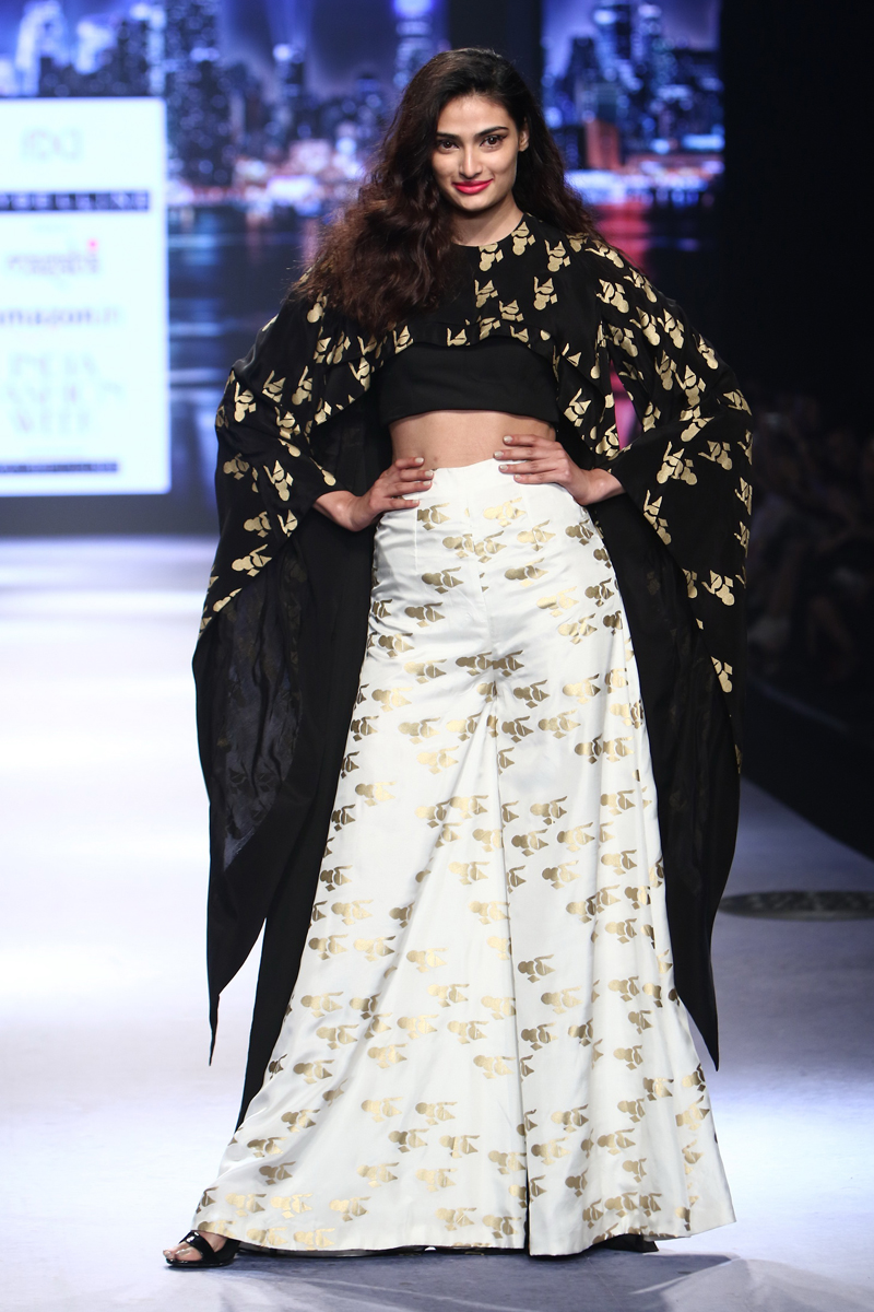 The Spring/Summer 2017 collection at Amazon India Fashion Week captures the mood of the perfect cocktail hour on a New York sidewalk. The collection brings out the diversity in dressing in the cultural melting pot that is New York. Chic, classic, yet folksy the separates in the line are a perfect marriage between delicate & power dressing for any young women. A monochrome palette dominates with bursts of tone-on-tone ensembles in shades of cherry, pink, green & a luxe electric blue. The silhouettes are an embodiment of progressive Indian wear, featuring capes with peek-a-boo bustiers, bell bottoms with slinky slips, sensuous drapes with oversized shirts baring the décolletage in rich charmeuse satin, block printed velvet & fine plush silks. Alongside prêt looks that effortlessly convert into night- time pieces, the line also consists of shift dresses with constructed jackets , oversized silk shirts ,cropped hakoba shirts with thigh-high slit skirts , boudoir- dressing inspired suit-sets, cool knit tops highlighted with pearls , sequins and vintage Indian motifs which are perfect for the quintessential Boss Woman.