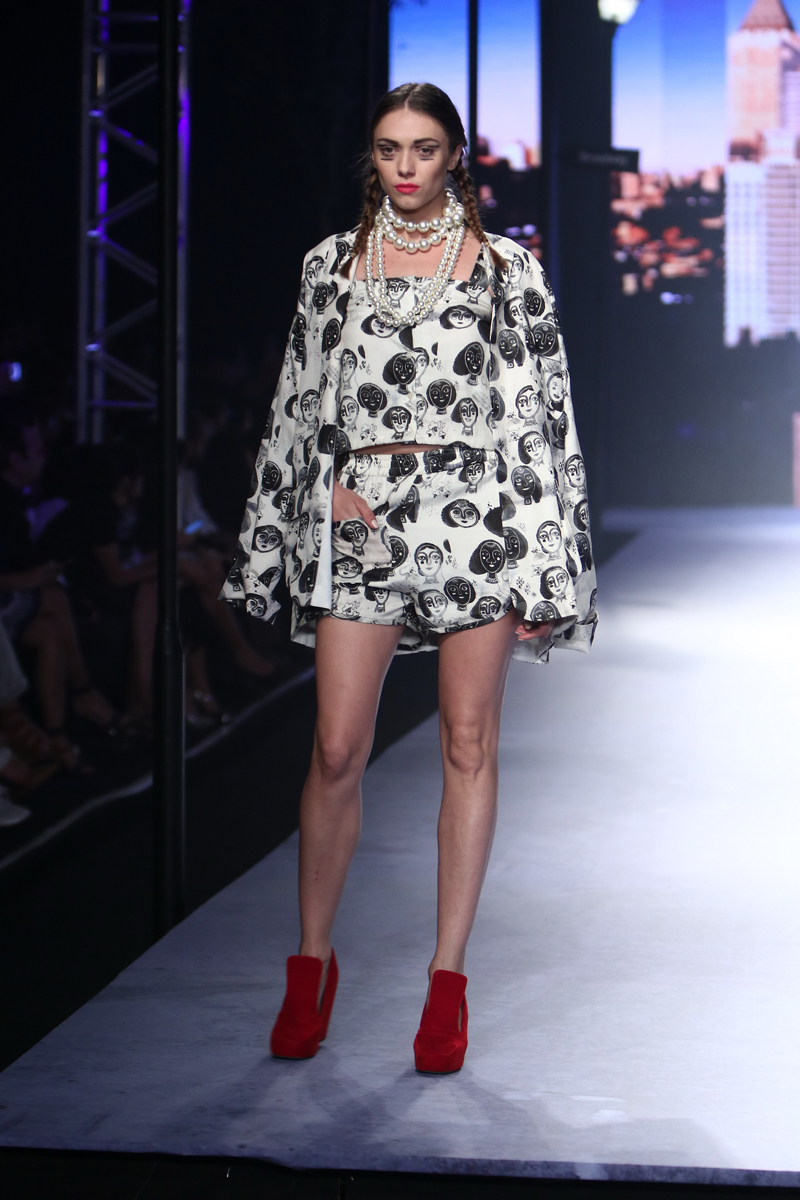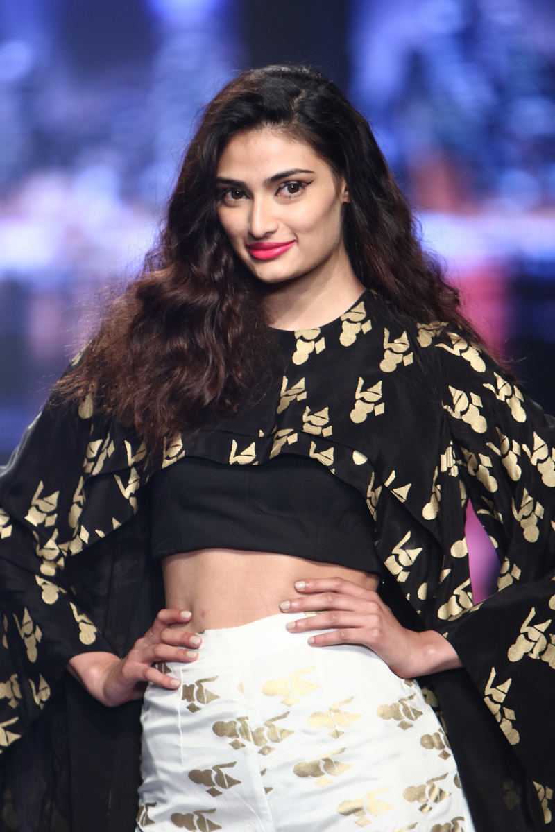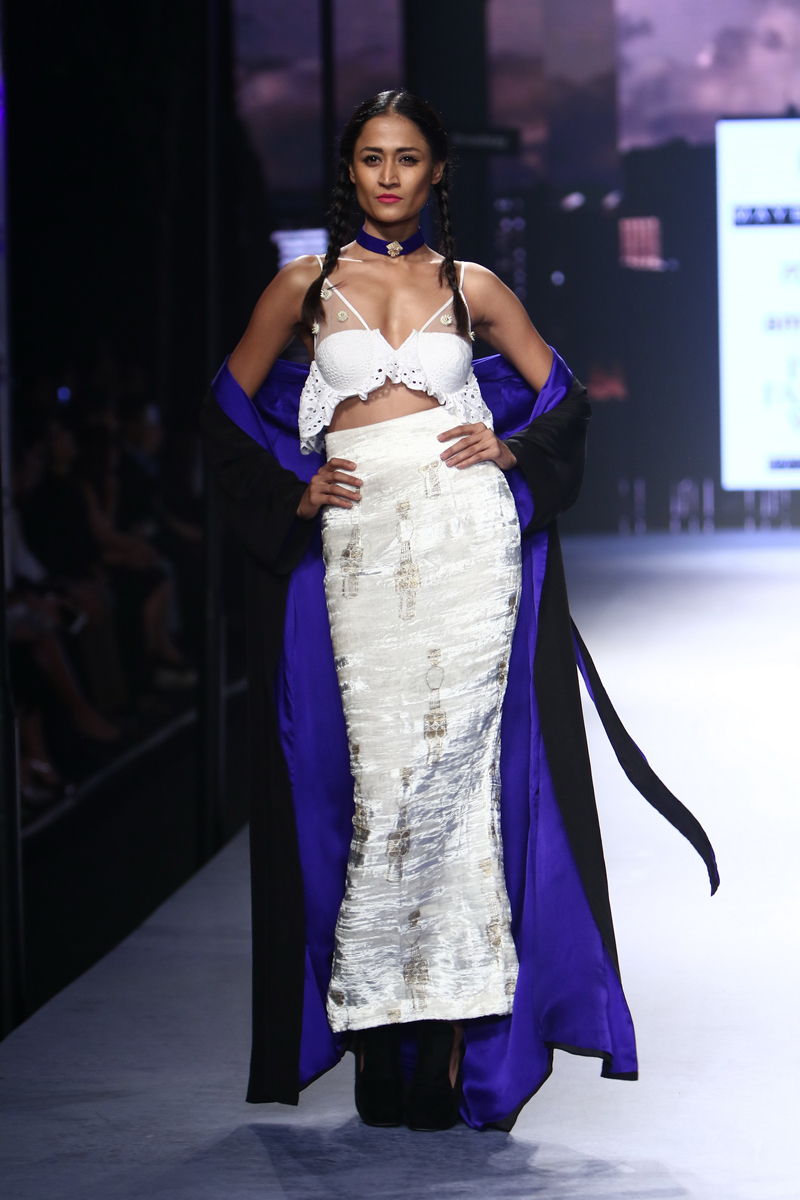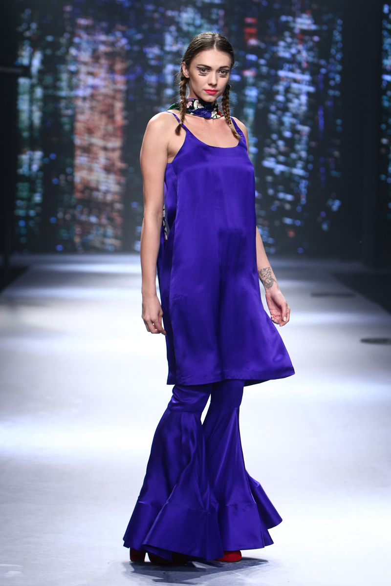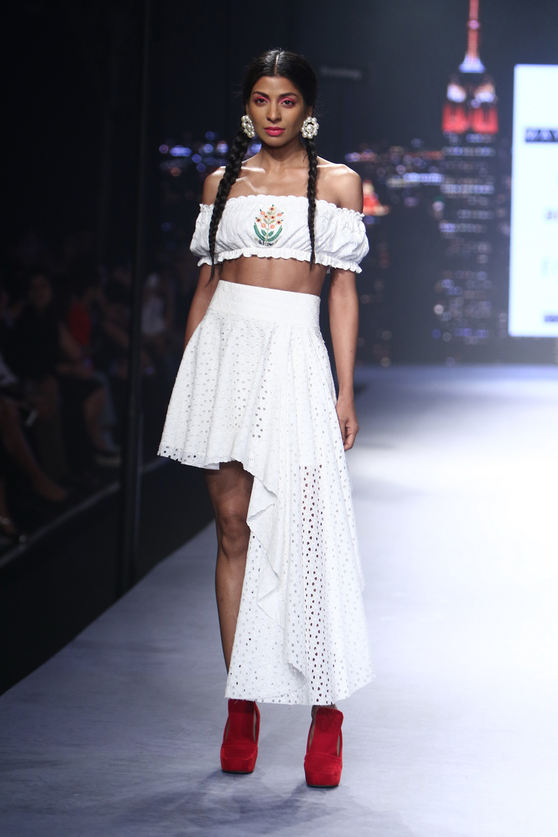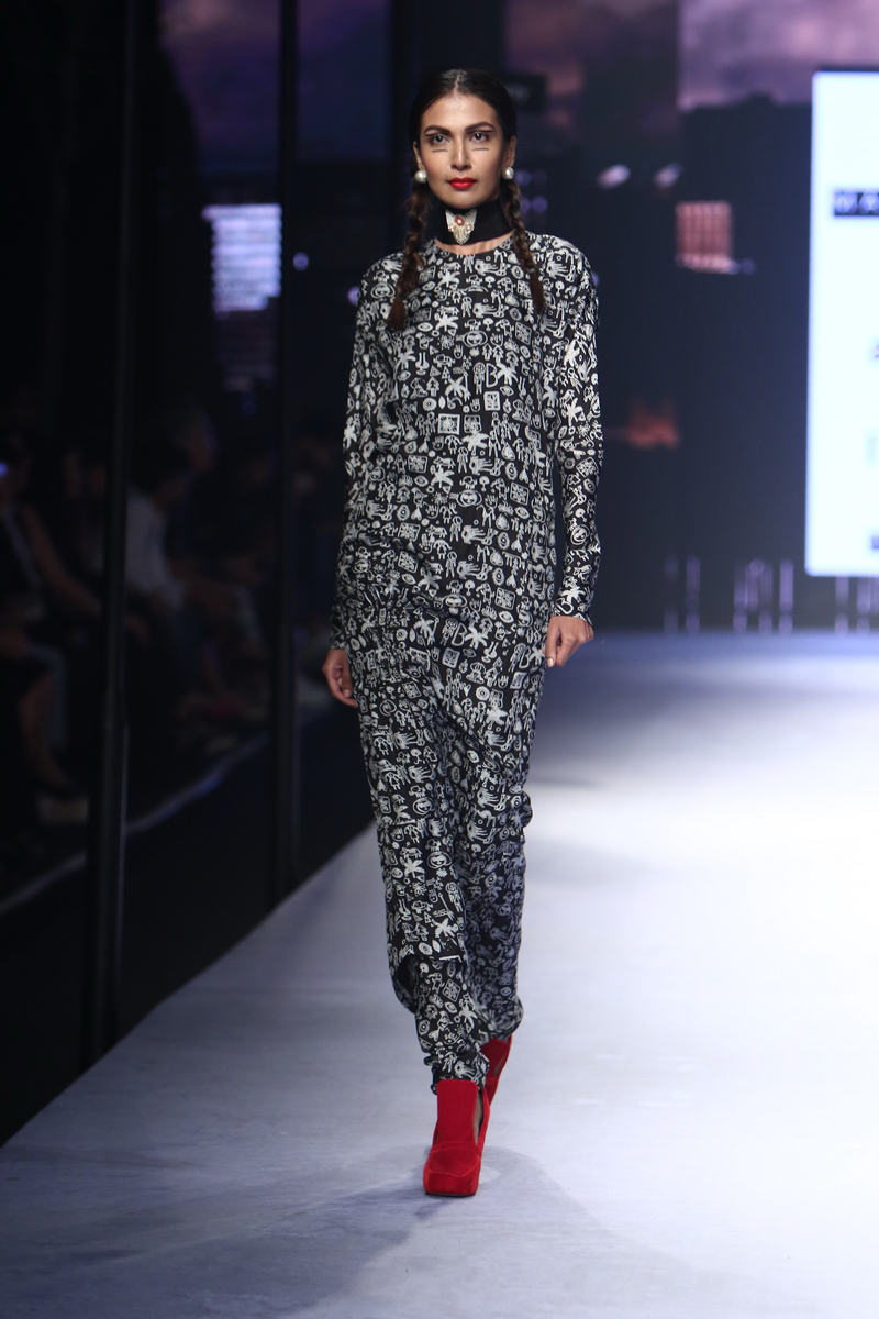 The Spring/Summer 2017 collection at Amazon India Fashion Week captures the mood of the perfect cocktail hour on a New York sidewalk. The collection brings out the diversity in dressing in the cultural melting pot that is New York. Chic, classic, yet folksy the separates in the line are a perfect marriage between delicate & power dressing for any young women. A monochrome palette dominates with bursts of tone-on-tone ensembles in shades of cherry, pink, green & a luxe electric blue. The silhouettes are an embodiment of progressive Indian wear, featuring capes with peek-a-boo bustiers, bell bottoms with slinky slips, sensuous drapes with oversized shirts baring the décolletage in rich charmeuse satin, block printed velvet & fine plush silks. Alongside prêt looks that effortlessly convert into night- time pieces, the line also consists of shift dresses with constructed jackets , oversized silk shirts ,cropped hakoba shirts with thigh-high slit skirts , boudoir- dressing inspired suit-sets, cool knit tops highlighted with pearls , sequins and vintage Indian motifs which are perfect for the quintessential Boss Woman.