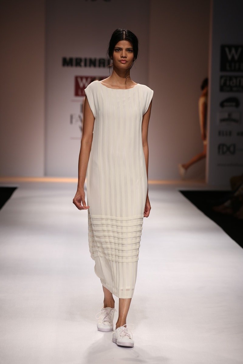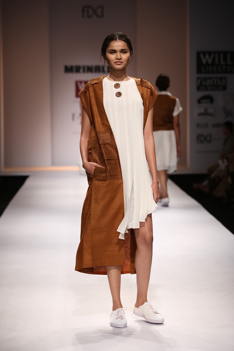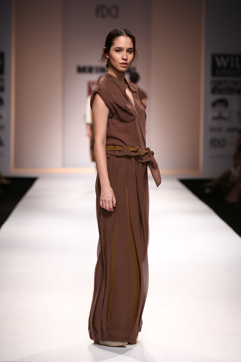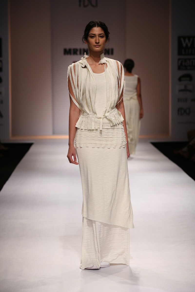 An eponymous label, Mrinalini was launched in 2008. Following a linear momentum, Mrinalini aims to filter fashion down to design, distill tradition and counter influences to create a line for people who don’t like just ‘lines’ without designs.n nMrinalini launched in India in 2007, a philosophy seeking to merge left with right, to power into a universal culture with the cable connecting to India. The brand currently retail across India, the Middle East and NYC.n nThis SS-14 collection plays on “De-saturate”, where the saturate aims to peel of layers of artificial varnish to reveal the natural tones underneath. Lounge dresses, wedge hemlines, wood block jackets, and windowpane shirts in a palette of Wood, white sand, tan, stone and gravel. The Spring Summer 14 collection is an escape line n nBuyer’s Contact:nMrinalini Gupta nMobile: 91 9999010769nTel (with area code): 0120 2536696n nMedia Contact:nNandini Vaish/Mrinalini GuptanMobile: 919873243428/919810912332nTel (with area code): 0120-2536696