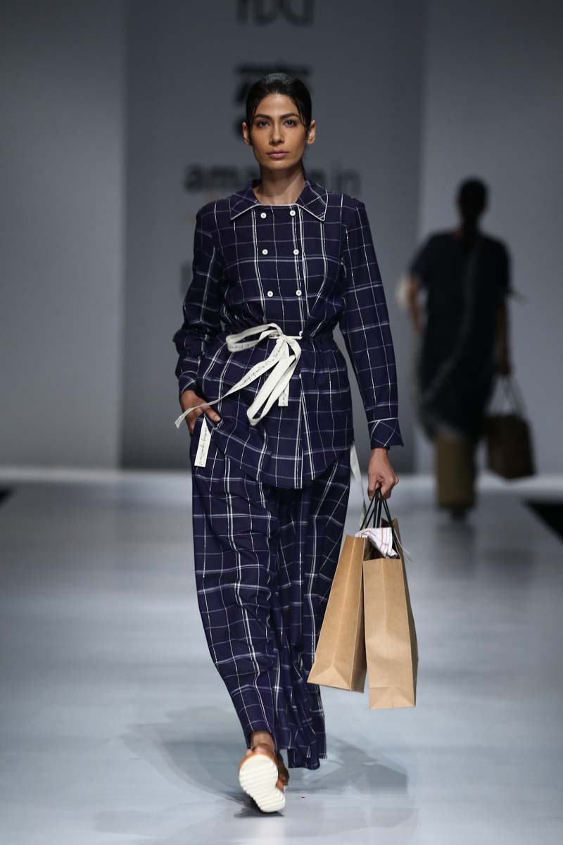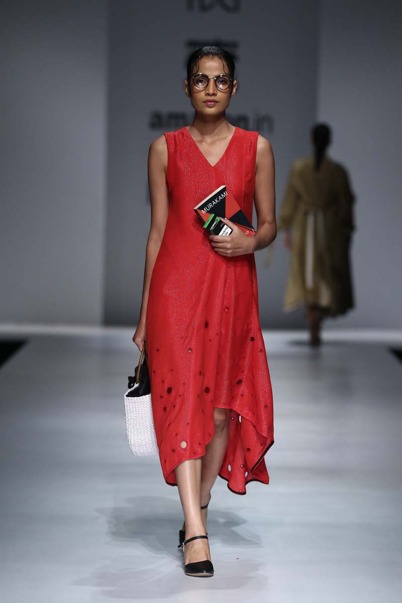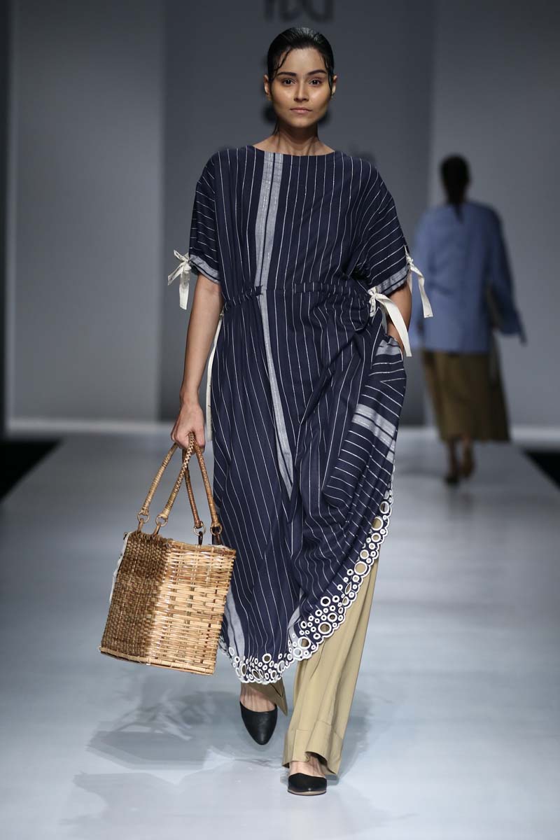 nSS?18 is about nostalgia in the most basic of forms ? reminiscing about past love affairs. We went back to basics in terms of graphics too ? the checks, the stripes, the polkas. The only difference is that we?ve tweaked them all. The checks and stripes have been woven in irregular patterns ? the widths of the lines vary in the stripes and wider checks are woven on top of graph checks. The polkas have been given the cutout and applique treatment. These graphics are done in handloom cottons and viscose in shades of red, navy, sky blue, black, khaki and white.n