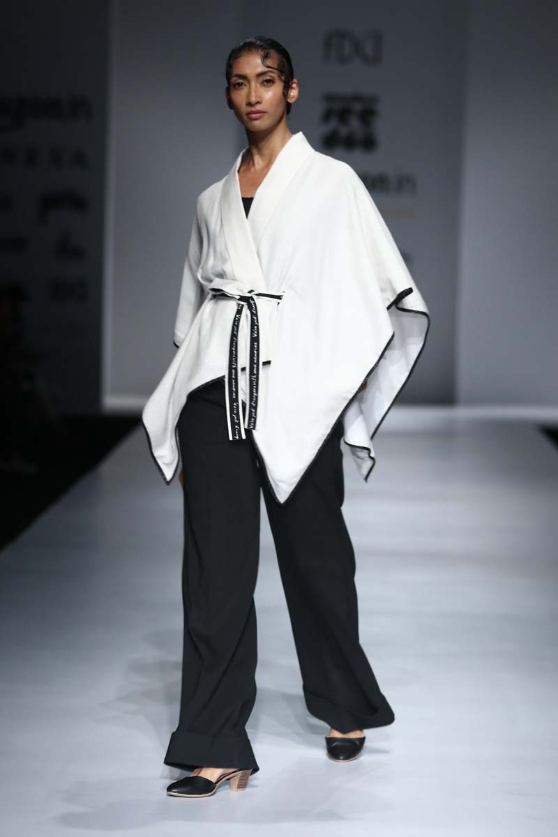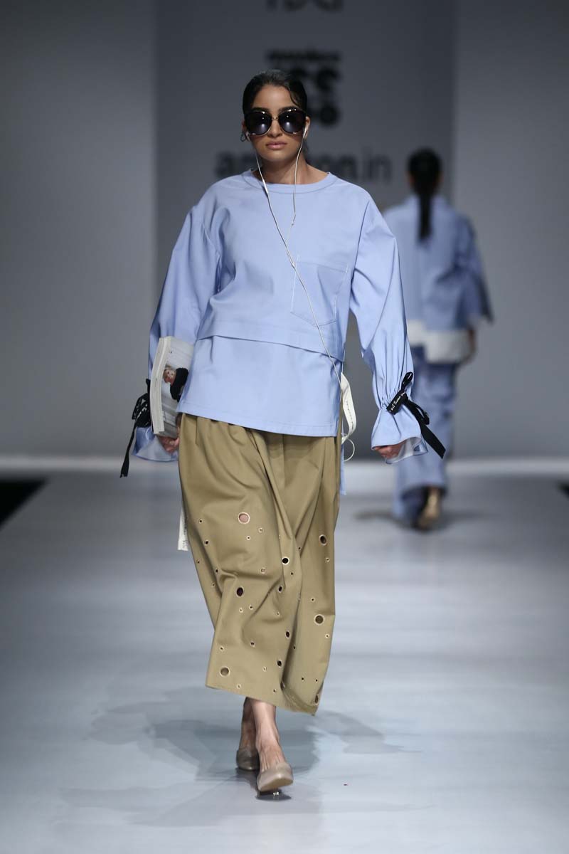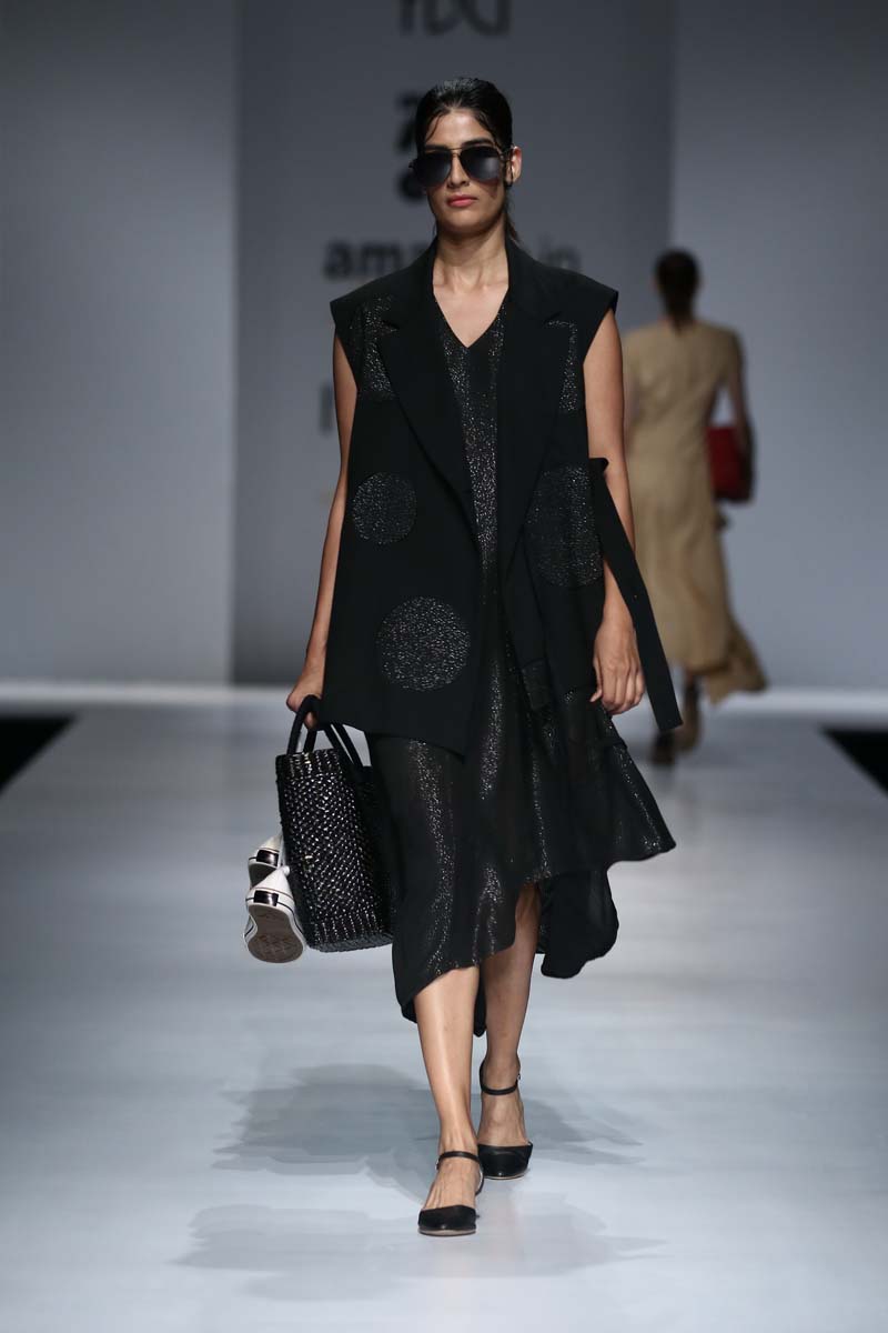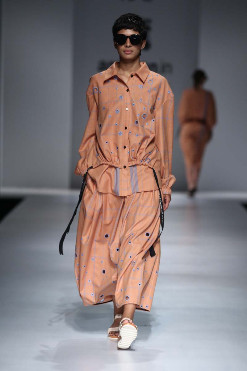 nSS?18 is about nostalgia in the most basic of forms ? reminiscing about past love affairs. We went back to basics in terms of graphics too ? the checks, the stripes, the polkas. The only difference is that we?ve tweaked them all. The checks and stripes have been woven in irregular patterns ? the widths of the lines vary in the stripes and wider checks are woven on top of graph checks. The polkas have been given the cutout and applique treatment. These graphics are done in handloom cottons and viscose in shades of red, navy, sky blue, black, khaki and white.n