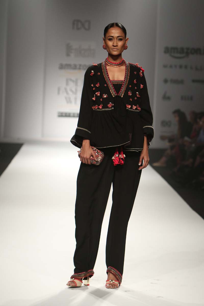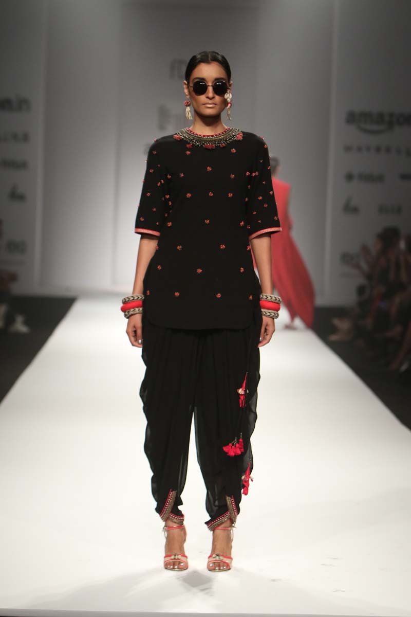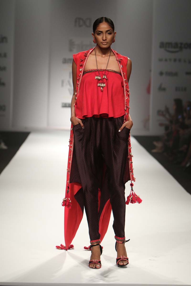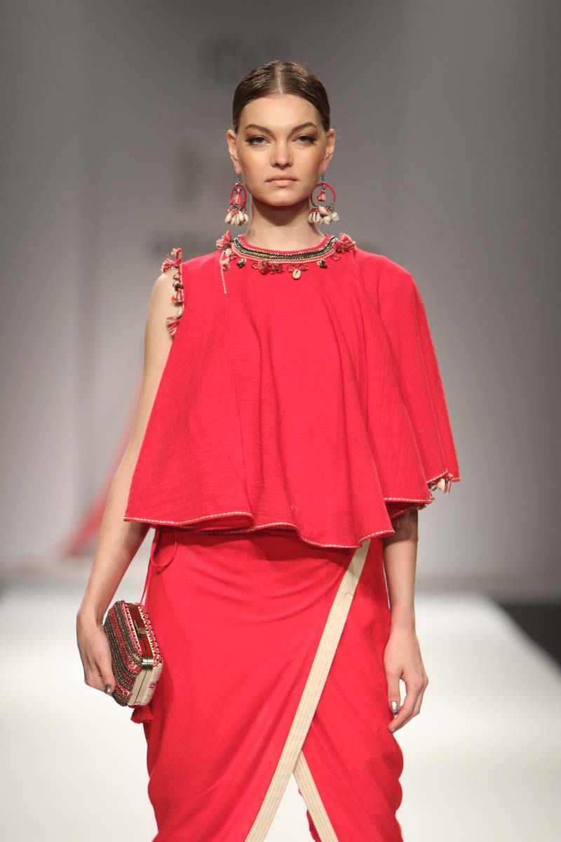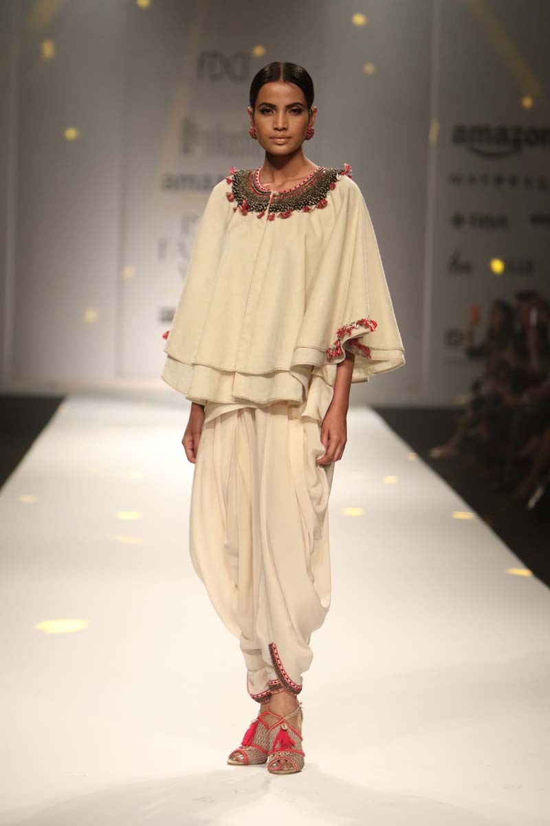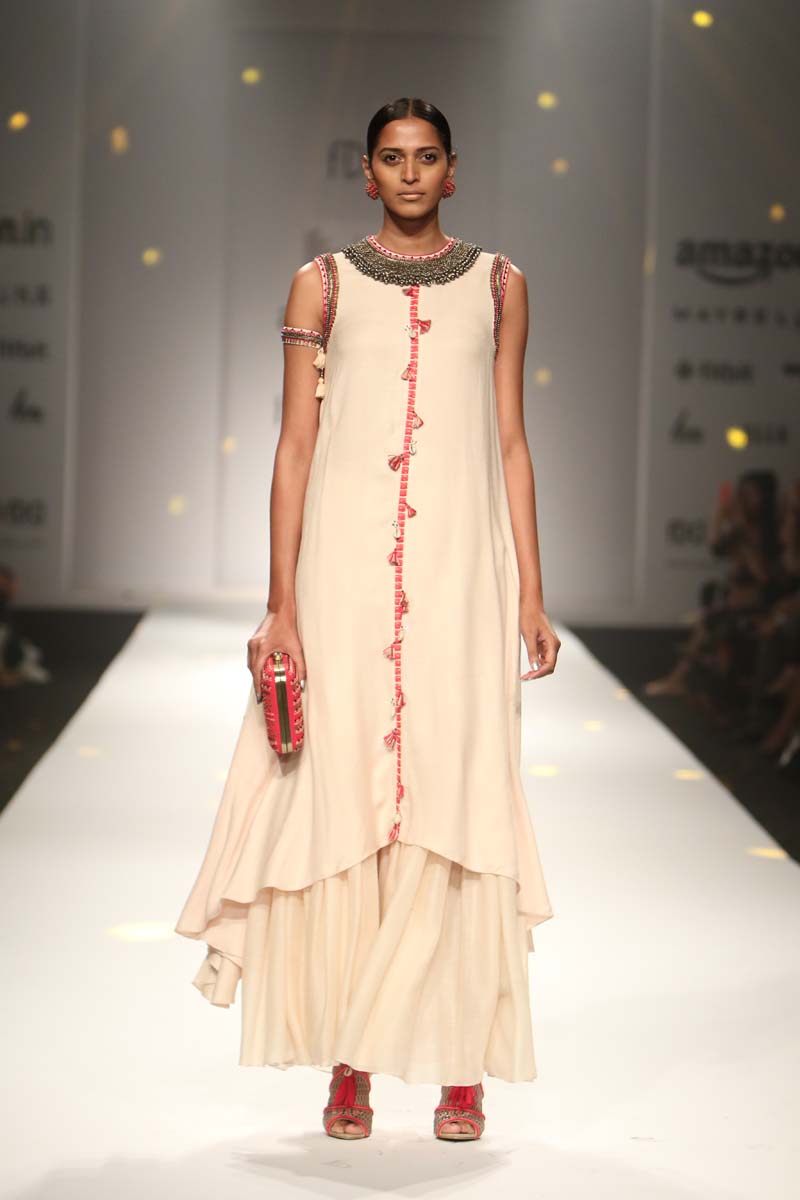 The use of khadi for almost the entire collection antique beads, cowry shells, katha embroidery, mother of pearl buttons, coral beads and traditional hand block print reflect a unique merge of mystical boundaries. In hues of Kasum red, Thar black and Chaas khadi, this collection enables revolutionizing simple art as a detail form-from the brand’s trademark hand crafted tassels to archive printed linings.