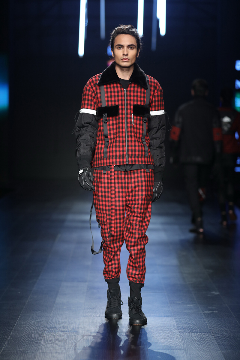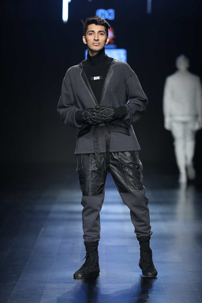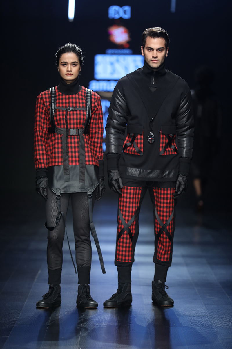 nThe Nought One AW 18′ line is an attempt to present a global street style collection, drawing references from various street sub cultures and binding them together through Nought One’s aesthetic. The collection takes reference from a post-apocalyptic world where work and lifestyle clothing for the rehabilitated human race would be constructed out of the left over natural and man-made fabrics. The collection involves combining conventional fabrics like tweed and flannel in herringbone and plaid patterns with modern fabrics like parachute and nylon for durability and longevity. Traditional silhouettes like kurta and shawl are re-interpreted and reinforced with heavy duty tapes, rivets and D rings for extreme climatic conditions and utility.