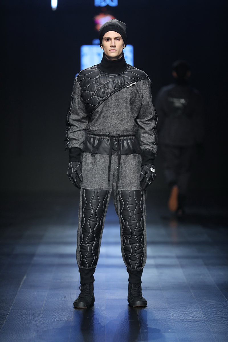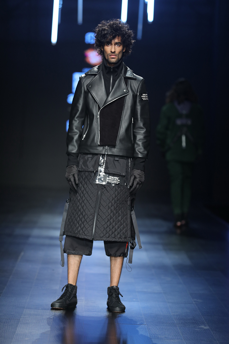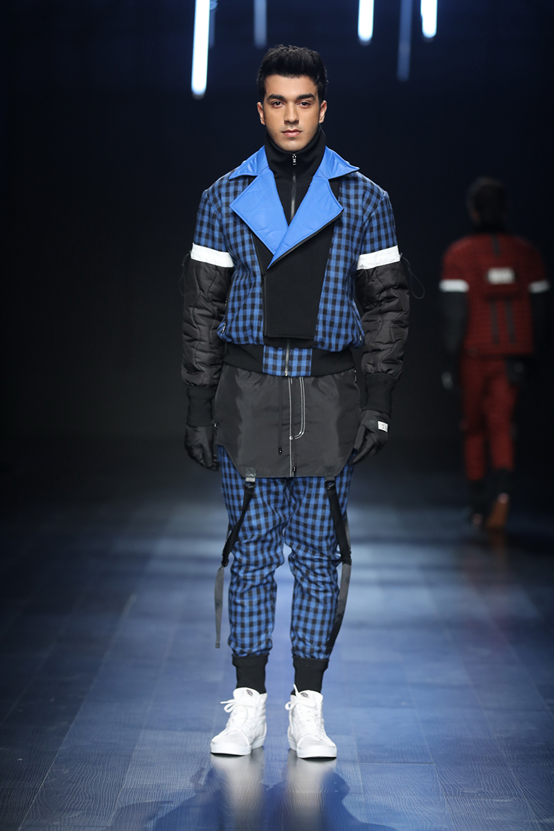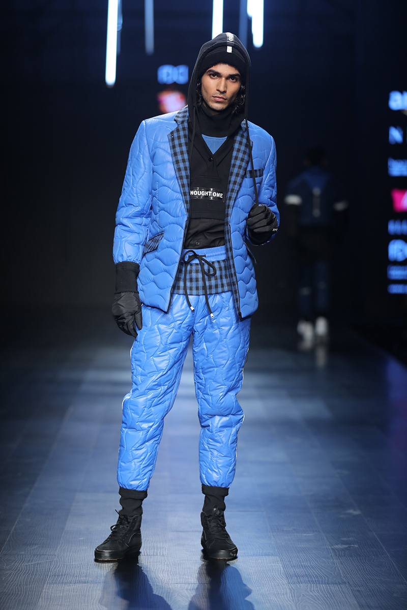 nThe Nought One AW 18′ line is an attempt to present a global street style collection, drawing references from various street sub cultures and binding them together through Nought One’s aesthetic. The collection takes reference from a post-apocalyptic world where work and lifestyle clothing for the rehabilitated human race would be constructed out of the left over natural and man-made fabrics. The collection involves combining conventional fabrics like tweed and flannel in herringbone and plaid patterns with modern fabrics like parachute and nylon for durability and longevity. Traditional silhouettes like kurta and shawl are re-interpreted and reinforced with heavy duty tapes, rivets and D rings for extreme climatic conditions and utility.
