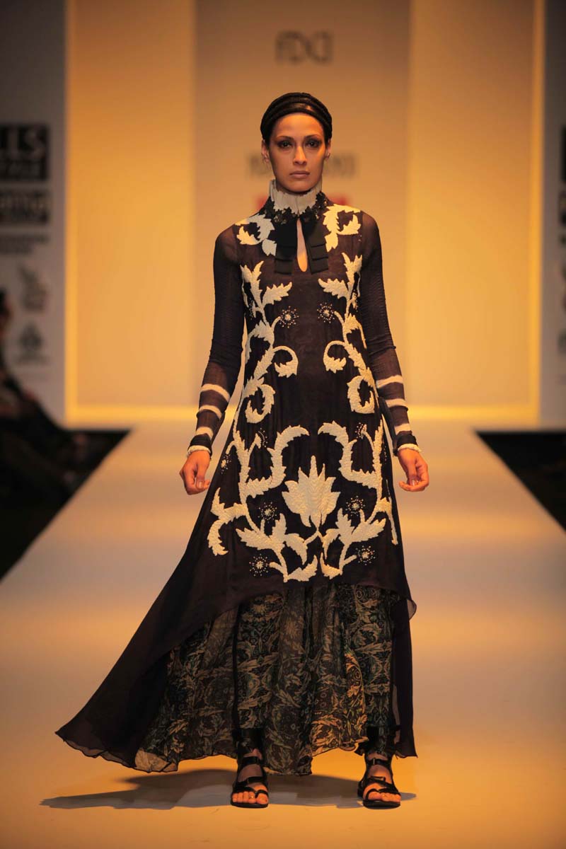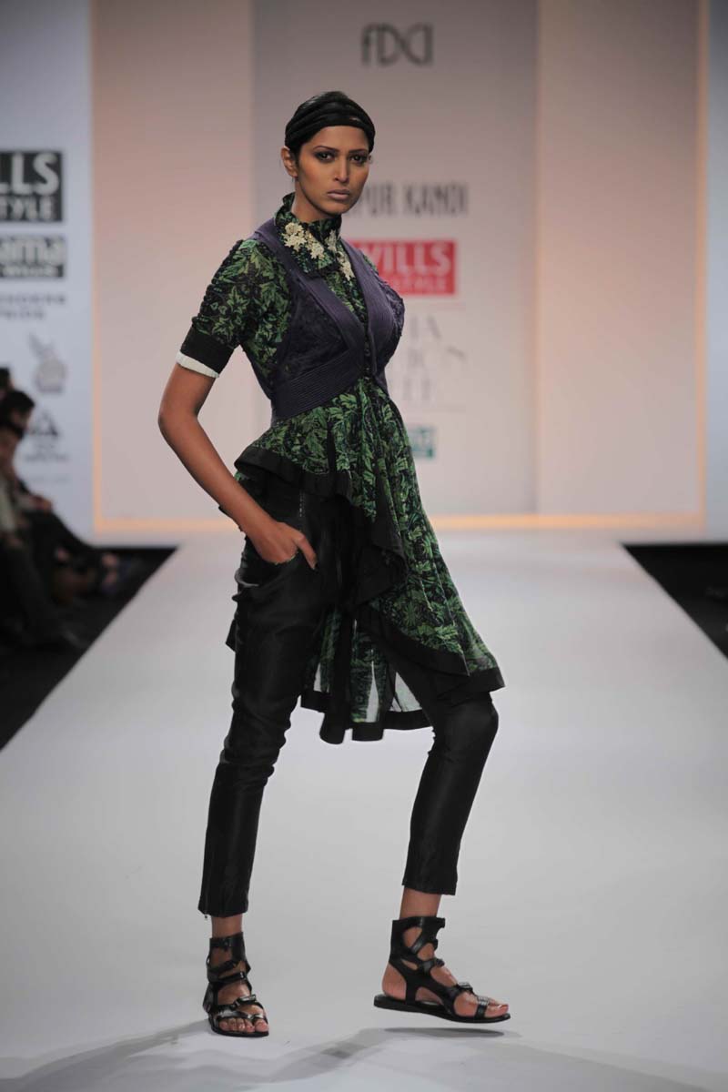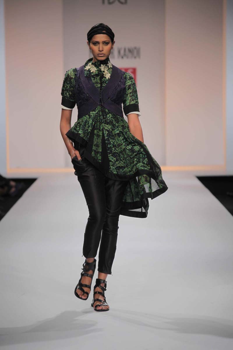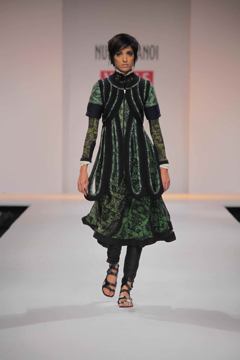 A NIFT Alumni, former stylist and a fashion writer for VervenMagazine, Nupur Kanoi launched her womens wear label in 2006.nThe label reflects a rich use of global craft, colour, embroideriesnand surface texturing, always with a bit of artistic disarray.nA/W 2012-13, THE TR OY STORY : Influenced by the Trojan era,nits costumes and the striking contrast of structure and flowing,nSpartan and luxury. Bold armour like androgynous doubletnjackets romance feminine maxis. The collection imbibes elementsnfrom greaves and shoulder plates all merging with intensencording, quilting, pleating and threadwork.
