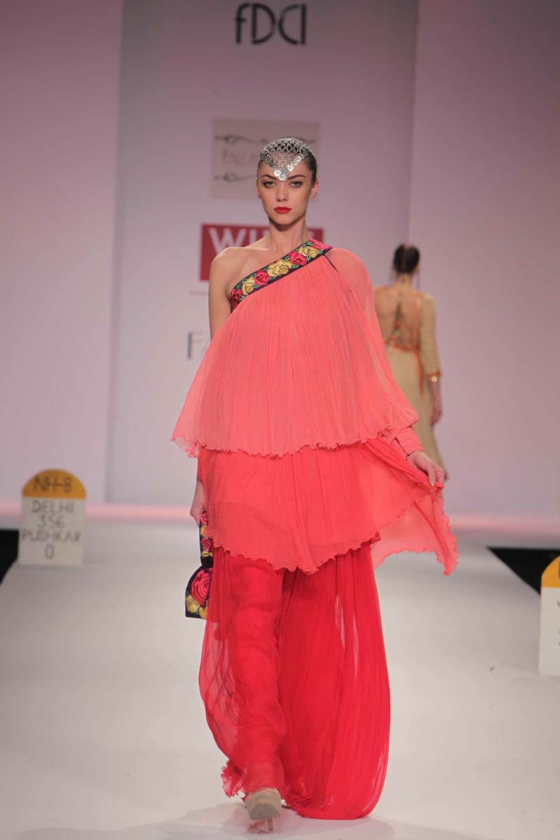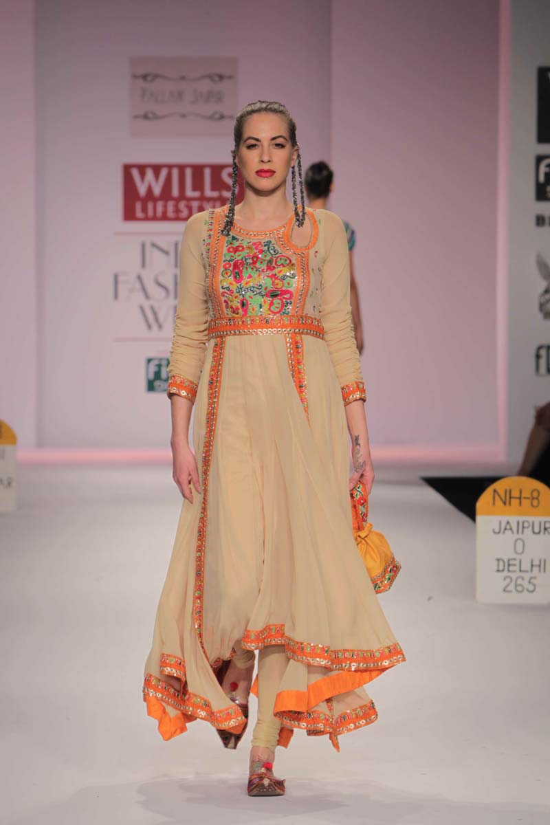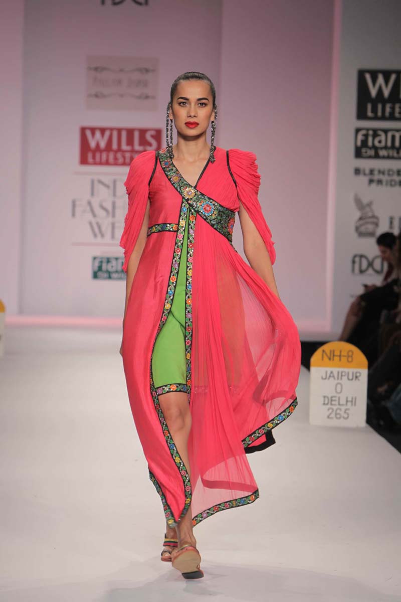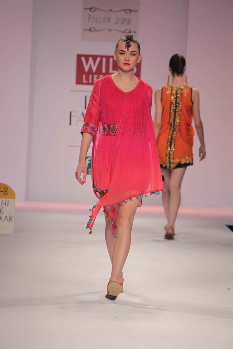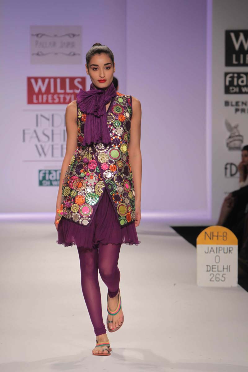 Pallavi’s A/W 2012 collection is truly inspired through her deepnunderstanding of Rajasthani local culture garnered through herntravels in the remotest parts which are often a divine inspiration.nPallavi observed how artists trade their goods and exchangenideas in noisy bazaars, she almost got a rush of adrenalinenwith a sense of renewed buzz compelling her to depict thesenobservations into her collection. However, she has carefullyninterspersed this kitschy art form in her urban collection whichnhas the expected finesse of fabrics like silks and chiffons that arenregal, stylish and embellished with traditional village feel full ofncolours, patchwork and such like.nA testimony to the rich heritage she is surrounded in.