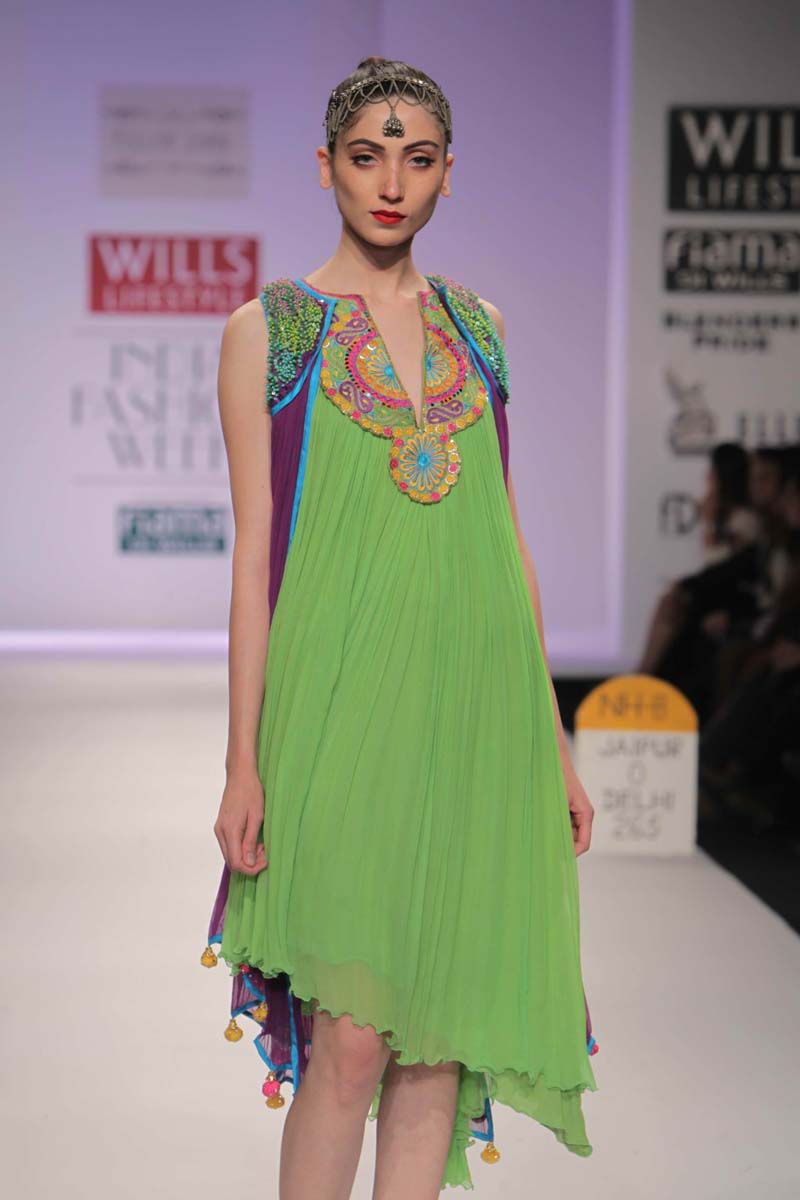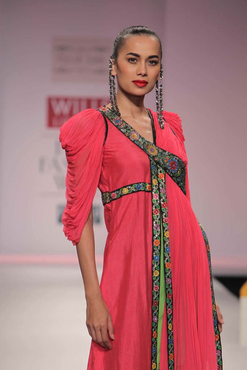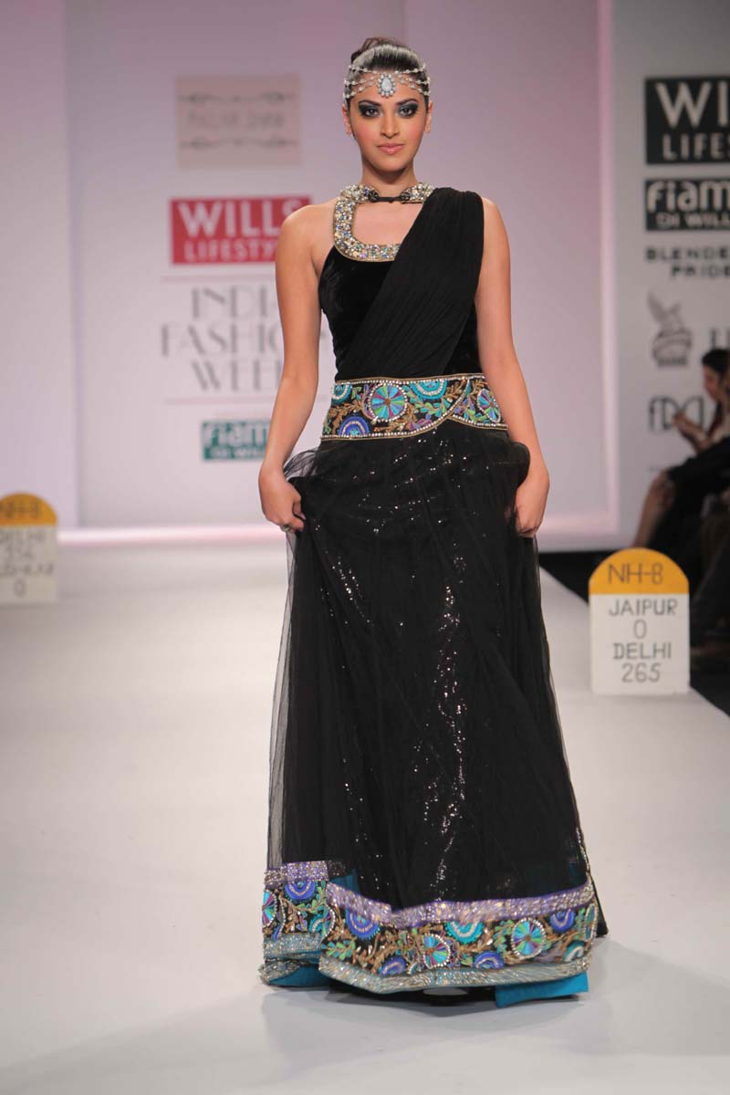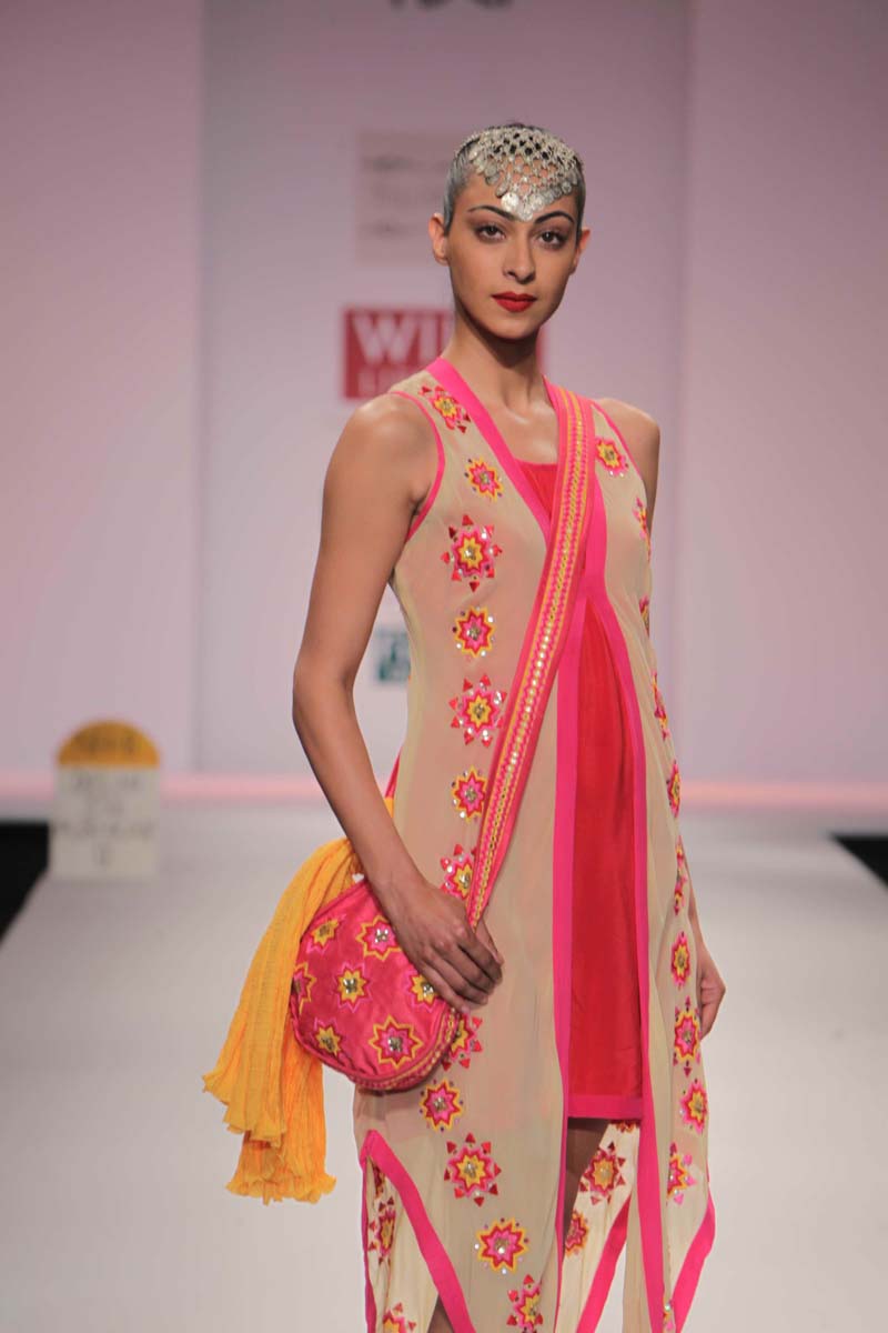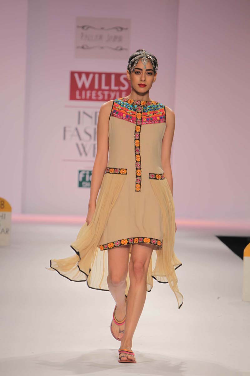 Pallavi’s A/W 2012 collection is truly inspired through her deepnunderstanding of Rajasthani local culture garnered through herntravels in the remotest parts which are often a divine inspiration.nPallavi observed how artists trade their goods and exchangenideas in noisy bazaars, she almost got a rush of adrenalinenwith a sense of renewed buzz compelling her to depict thesenobservations into her collection. However, she has carefullyninterspersed this kitschy art form in her urban collection whichnhas the expected finesse of fabrics like silks and chiffons that arenregal, stylish and embellished with traditional village feel full ofncolours, patchwork and such like.nA testimony to the rich heritage she is surrounded in.