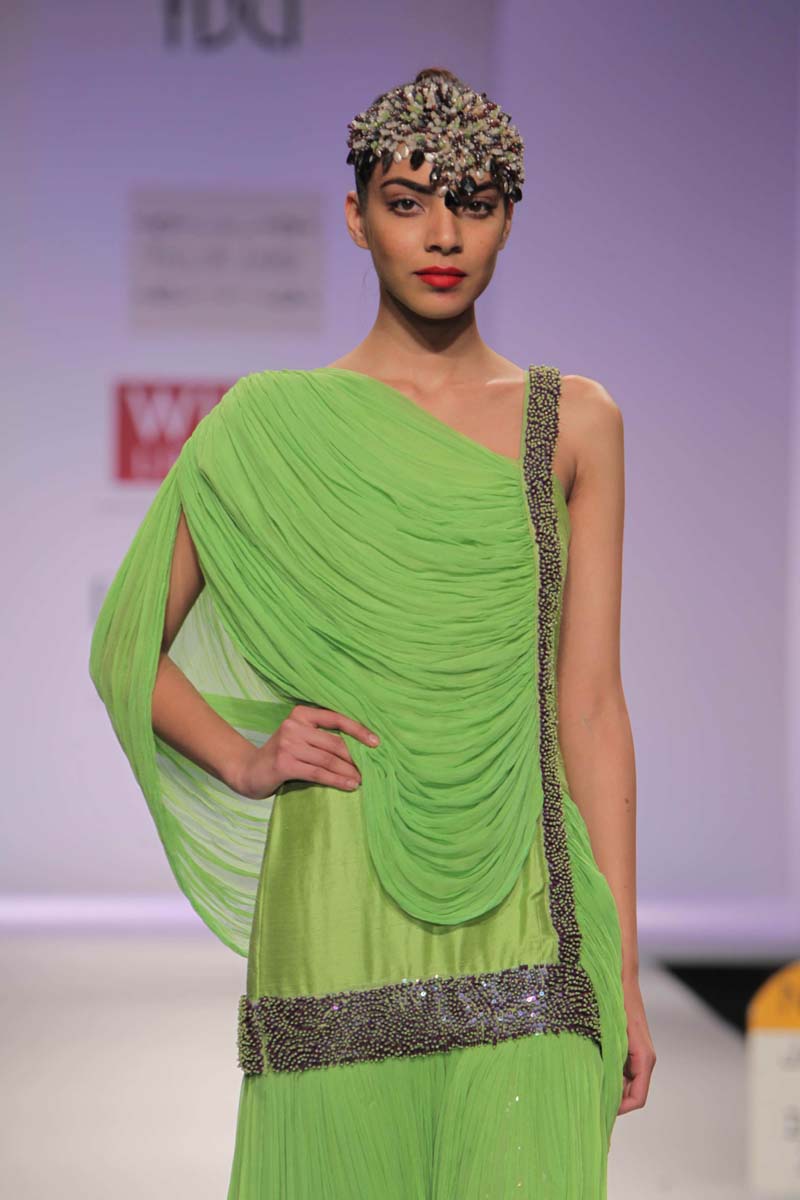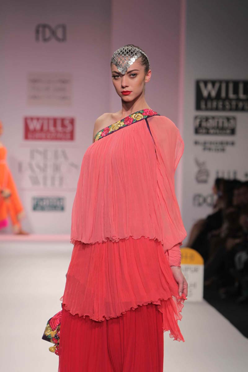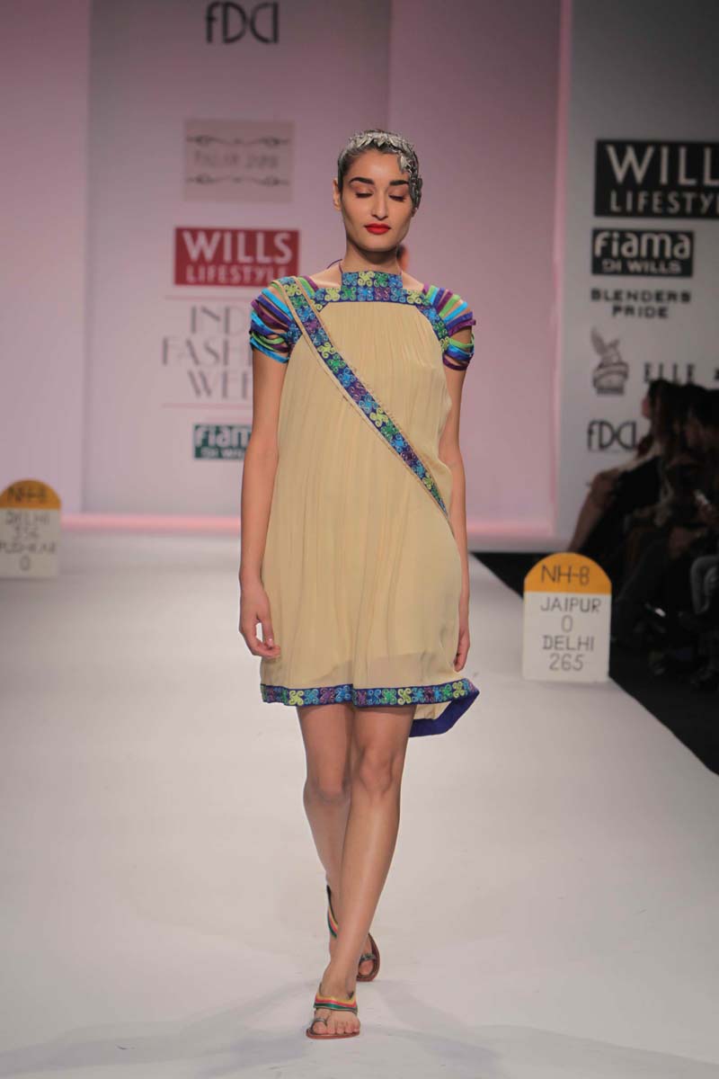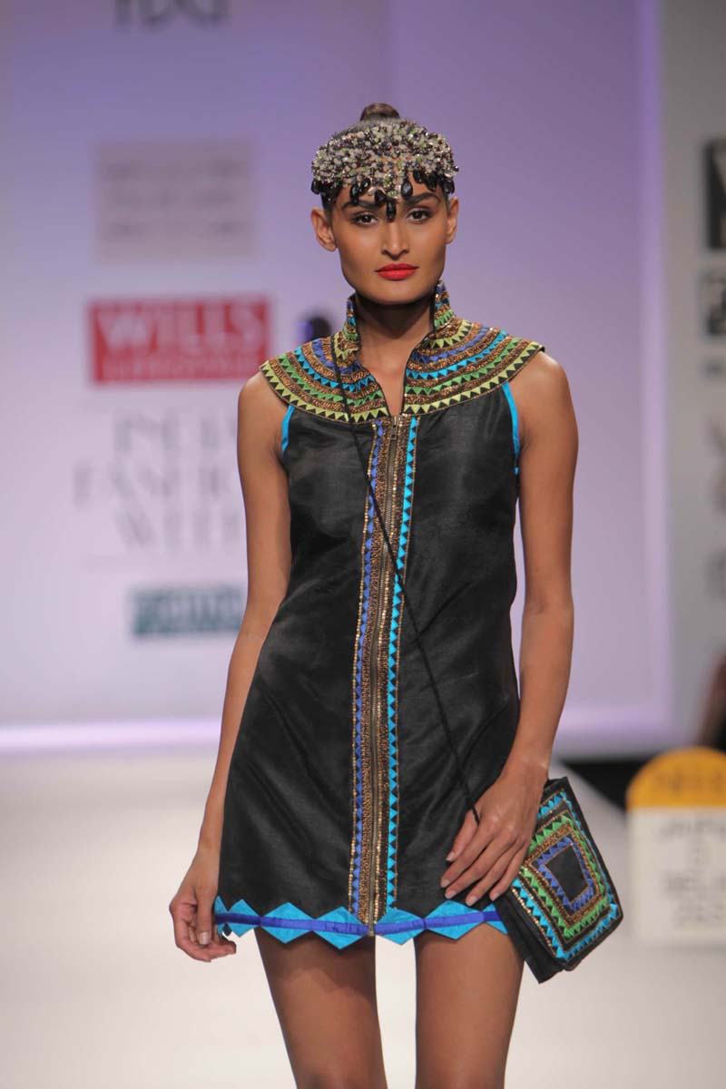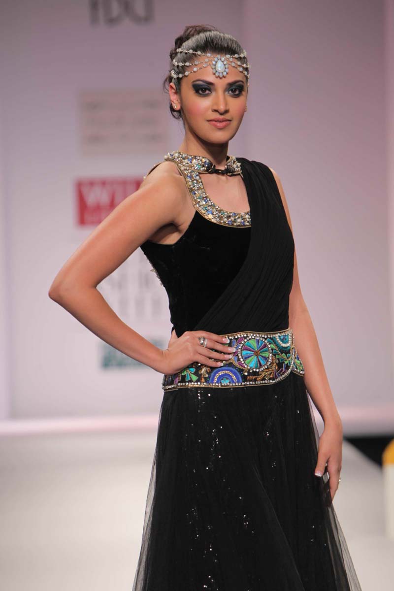 Pallavi’s A/W 2012 collection is truly inspired through her deepnunderstanding of Rajasthani local culture garnered through herntravels in the remotest parts which are often a divine inspiration.nPallavi observed how artists trade their goods and exchangenideas in noisy bazaars, she almost got a rush of adrenalinenwith a sense of renewed buzz compelling her to depict thesenobservations into her collection. However, she has carefullyninterspersed this kitschy art form in her urban collection whichnhas the expected finesse of fabrics like silks and chiffons that arenregal, stylish and embellished with traditional village feel full ofncolours, patchwork and such like.nA testimony to the rich heritage she is surrounded in.