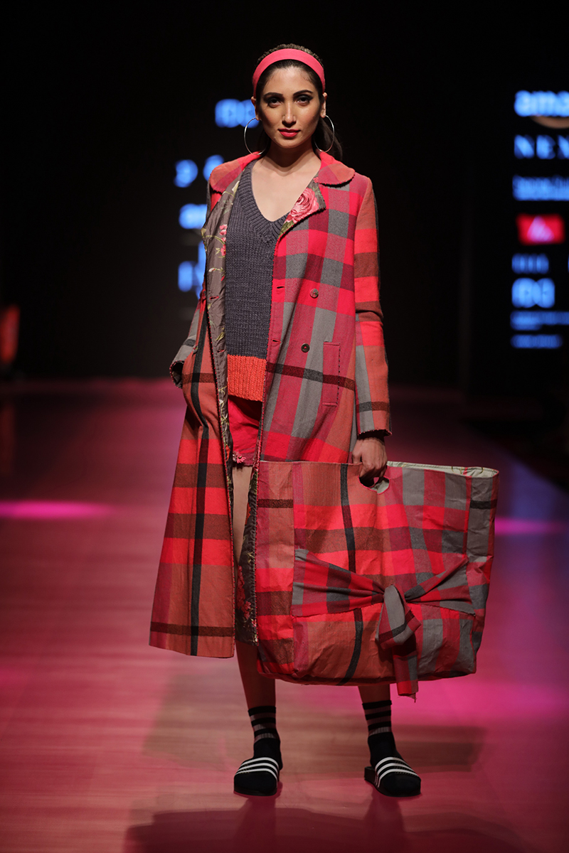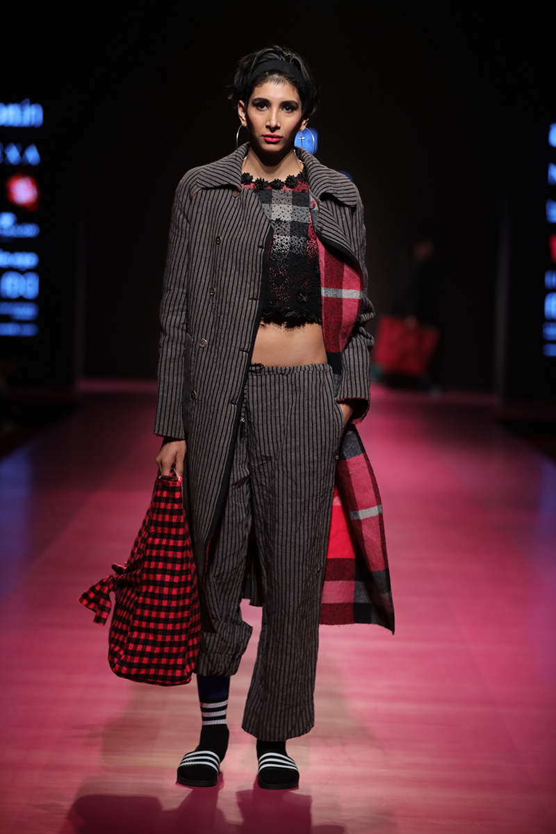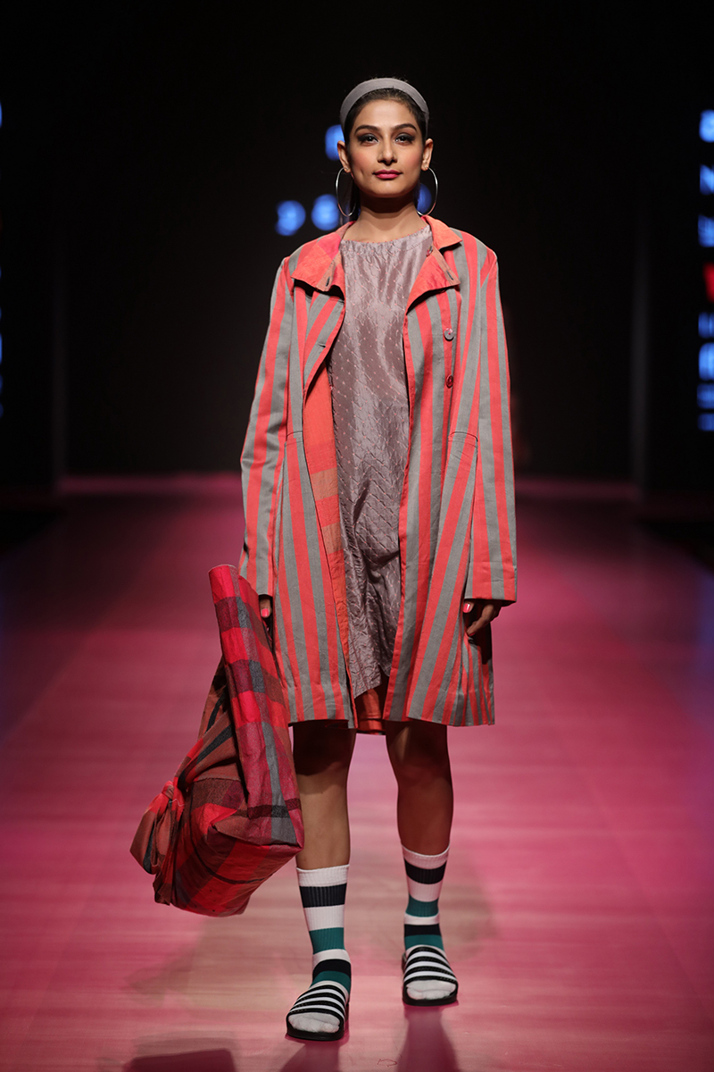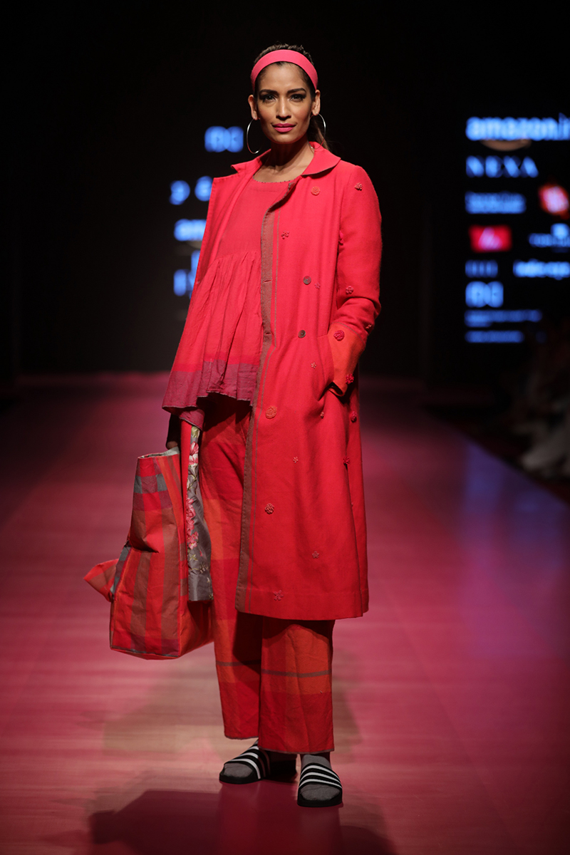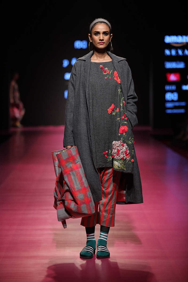 nAW 18 is an attempt to unite the modern with the traditional and international silhouettes through carefully hand crafted clothing using natural fabrics. The resulting designs are finely-detailed with a worn-in quality that makes them very wearable. The fabrics used are all handwoven wool, linens , silk and Khadi cottons woven in different parts of India. Block Printed florals and other bright colors are incorporated to add lightness and to compliment the geometry and seriousness of checks and stripes.n