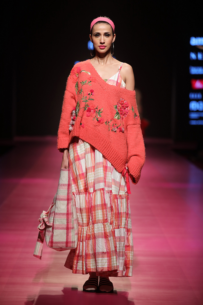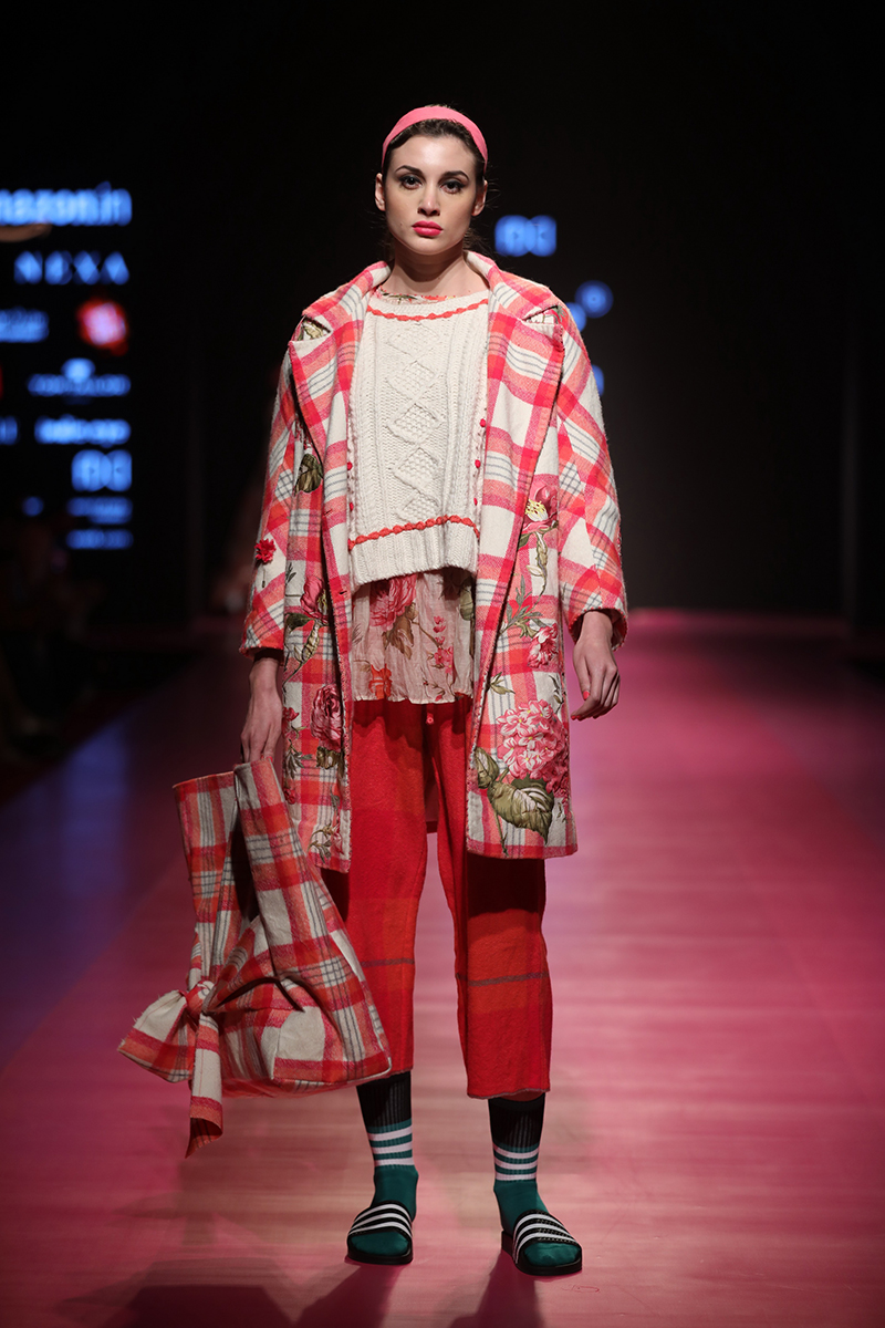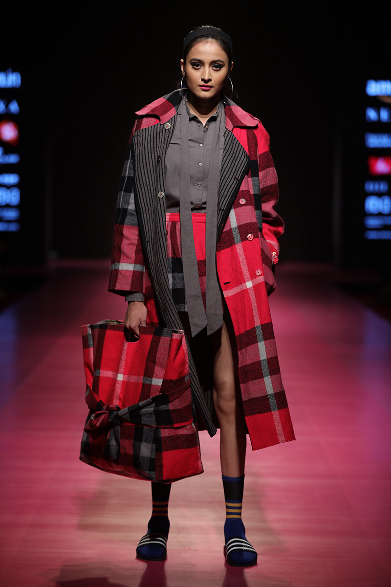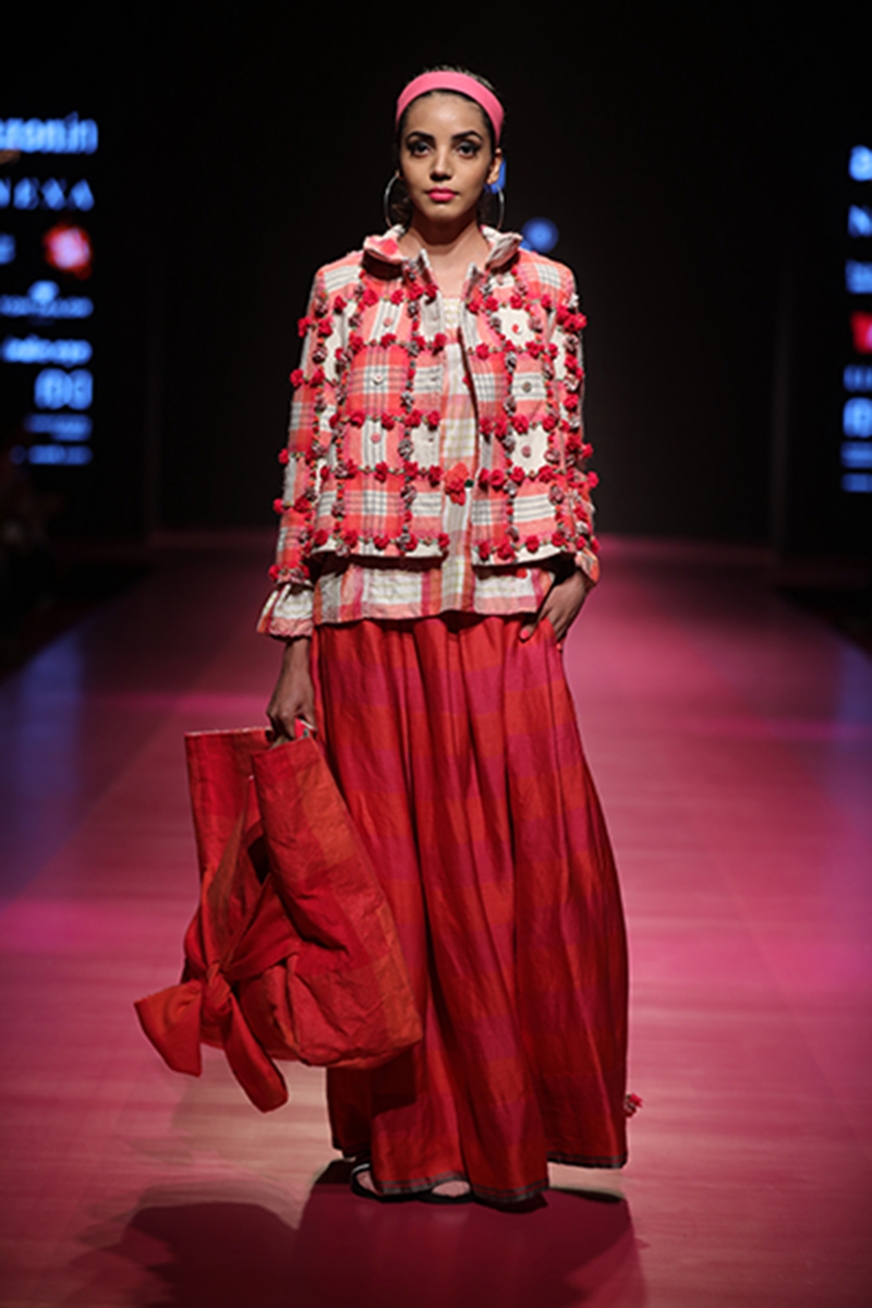 nAW 18 is an attempt to unite the modern with the traditional and international silhouettes through carefully hand crafted clothing using natural fabrics. The resulting designs are finely-detailed with a worn-in quality that makes them very wearable. The fabrics used are all handwoven wool, linens , silk and Khadi cottons woven in different parts of India. Block Printed florals and other bright colors are incorporated to add lightness and to compliment the geometry and seriousness of checks and stripes.n