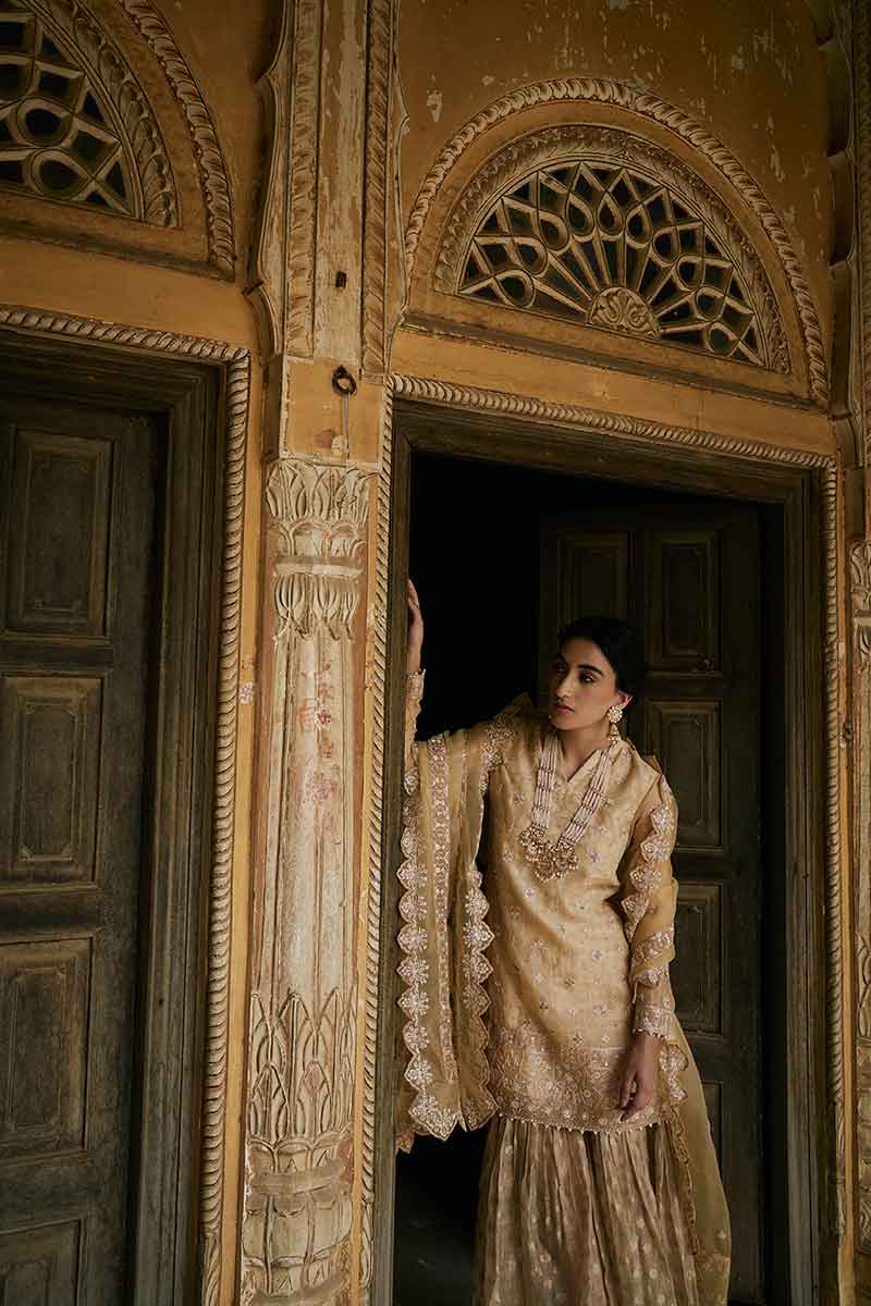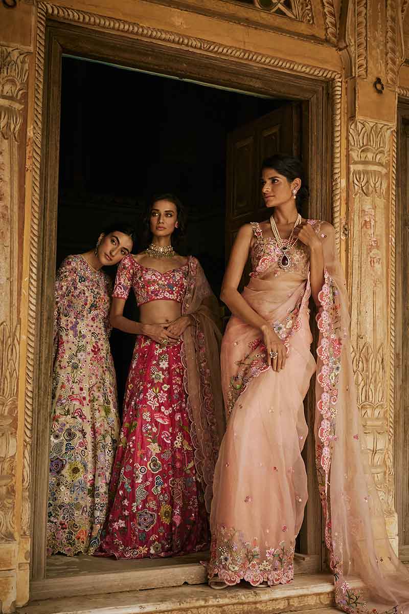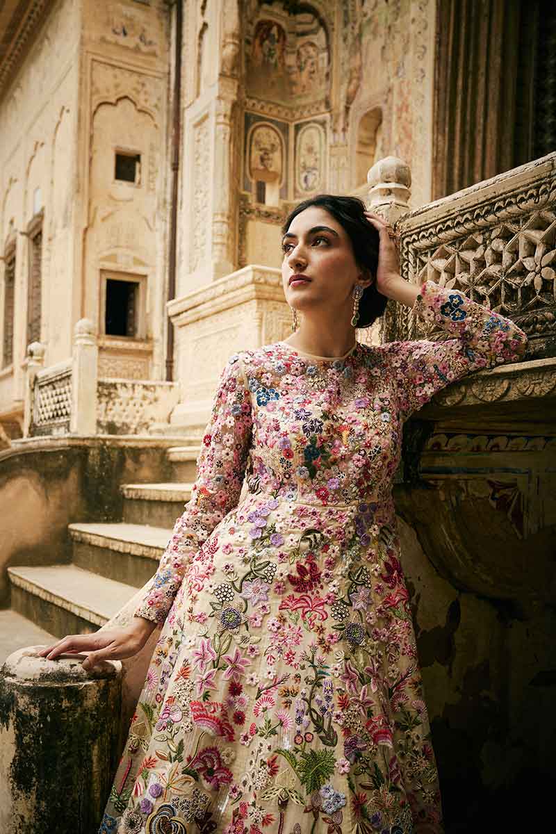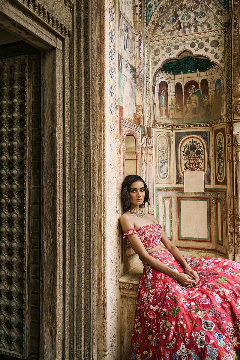 Creating this collection has been like creating a bouquet of flowers—with the beauty of old love and the lightness of new beginnings. Filmed in a century old haveli that was opened after, over eight decades of being shut. Much like intricate adornments on the walls of these homes, the garments envisage the love one pours into building their home. Taking months and years to paint their stories and reside amidst them so as to never forget. Or perhaps leave one day, and move on—with a mere montage of memories—leaving behind the weight of heritage. Kamkhab borrows from the limitlessness of craft, the volume of skill that contributes to its immortality. And the strong passion that enables it to be brought to realisation.