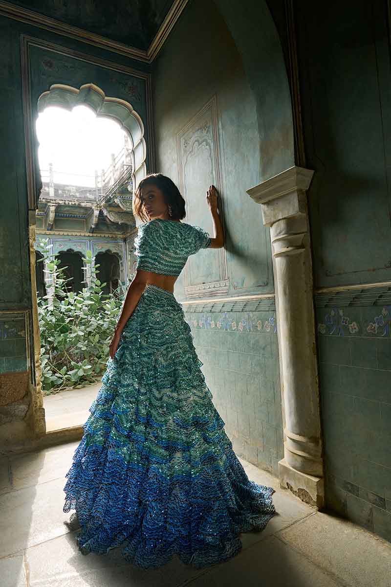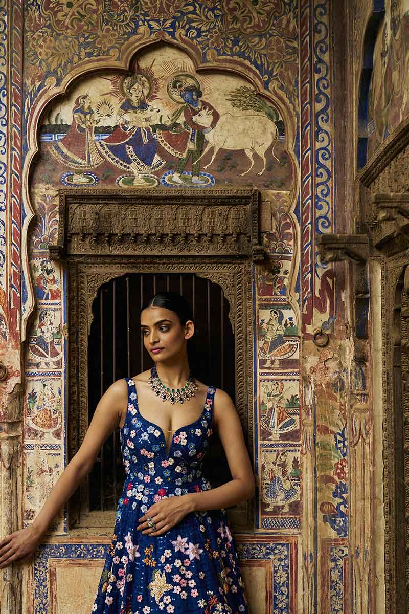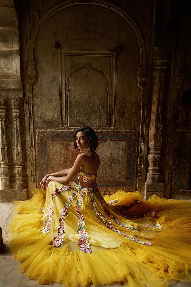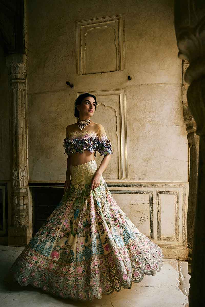 Creating this collection has been like creating a bouquet of flowers—with the beauty of old love and the lightness of new beginnings. Filmed in a century old haveli that was opened after, over eight decades of being shut. Much like intricate adornments on the walls of these homes, the garments envisage the love one pours into building their home. Taking months and years to paint their stories and reside amidst them so as to never forget. Or perhaps leave one day, and move on—with a mere montage of memories—leaving behind the weight of heritage. Kamkhab borrows from the limitlessness of craft, the volume of skill that contributes to its immortality. And the strong passion that enables it to be brought to realisation.