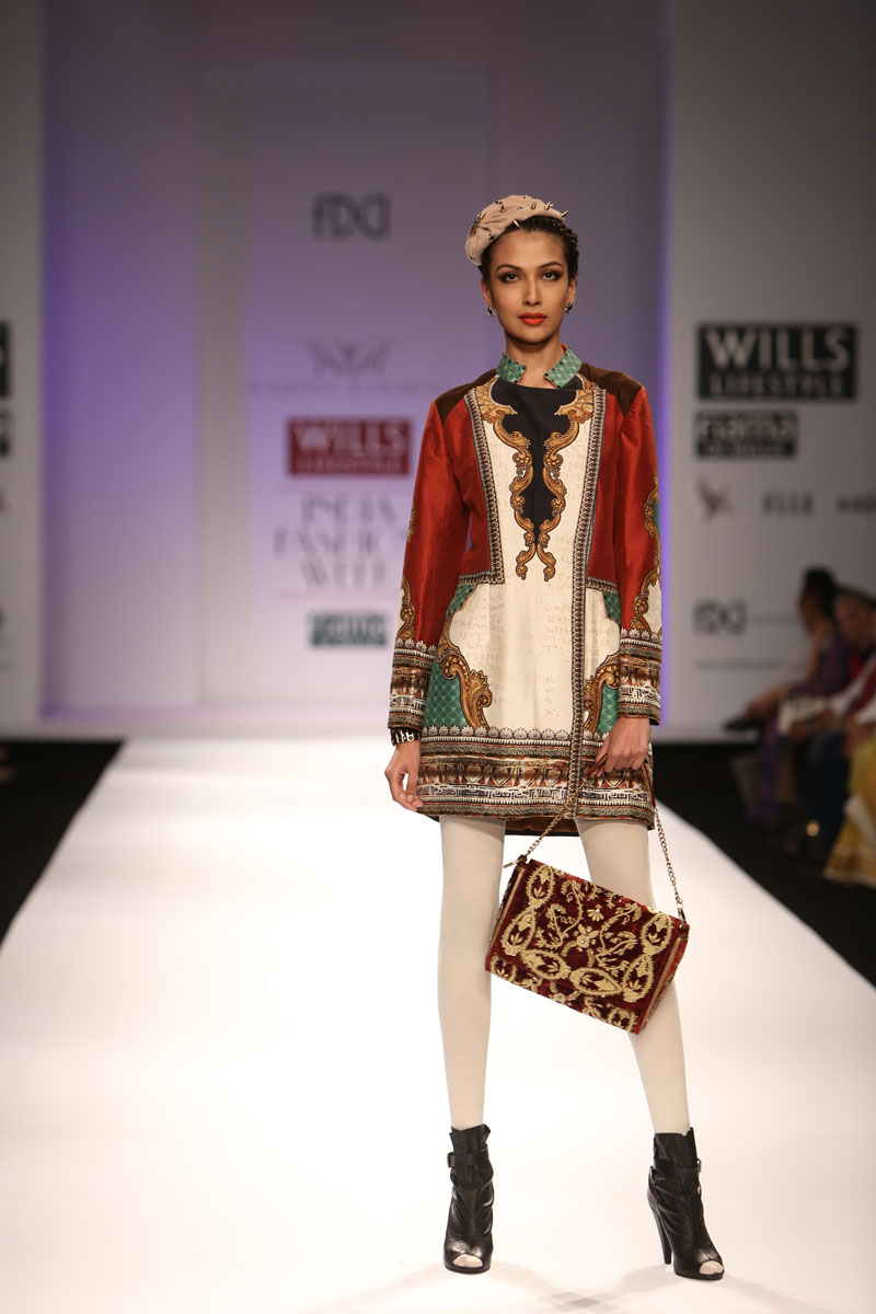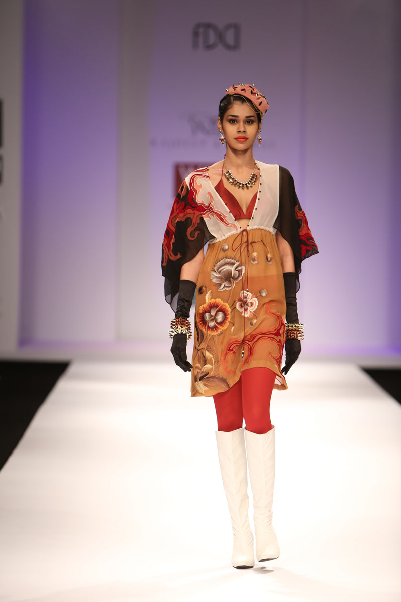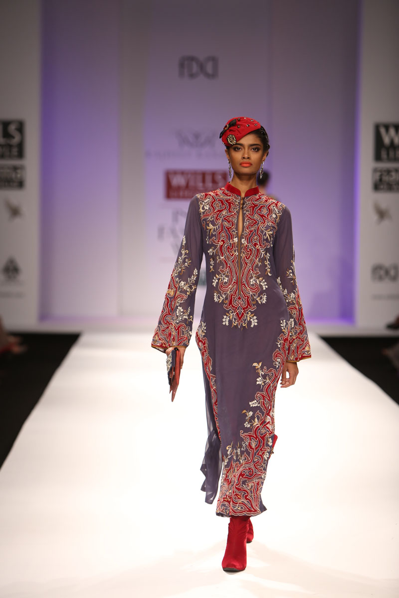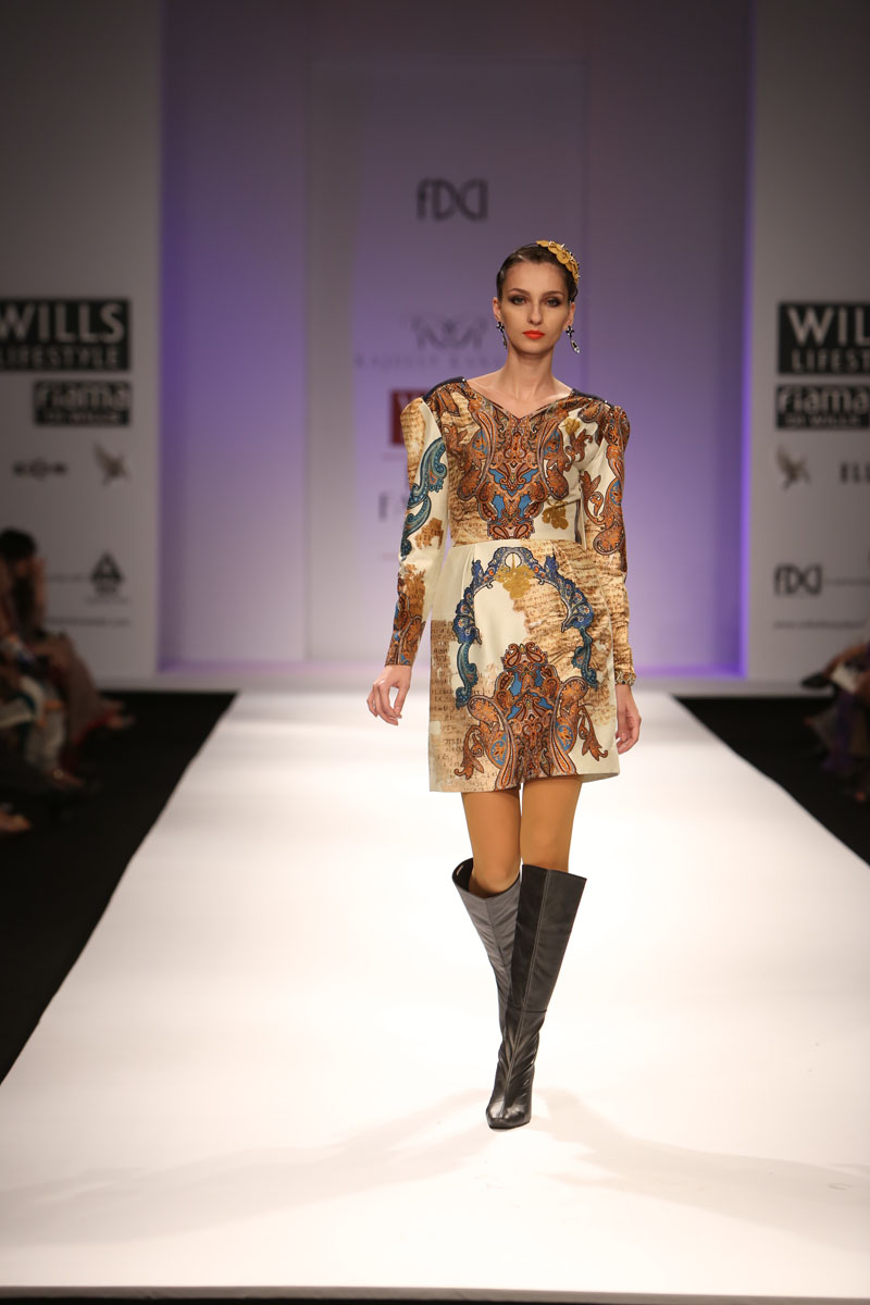 The ensembles are characterized strongly with their strenuous effort towards a dignified and elegant simplicity of construction; and are made distinct with prints in placements of intertwining fractions of parchments, paisleys and authentic medieval jewellery. These prints are further highlighted with low domes of beautiful Swarovski elements, the presence of fine, spiky metallic elements in relief on arm bands and shoulder moldings and combined with rich velvets, silk georgettes, silk satins and silk dupions.