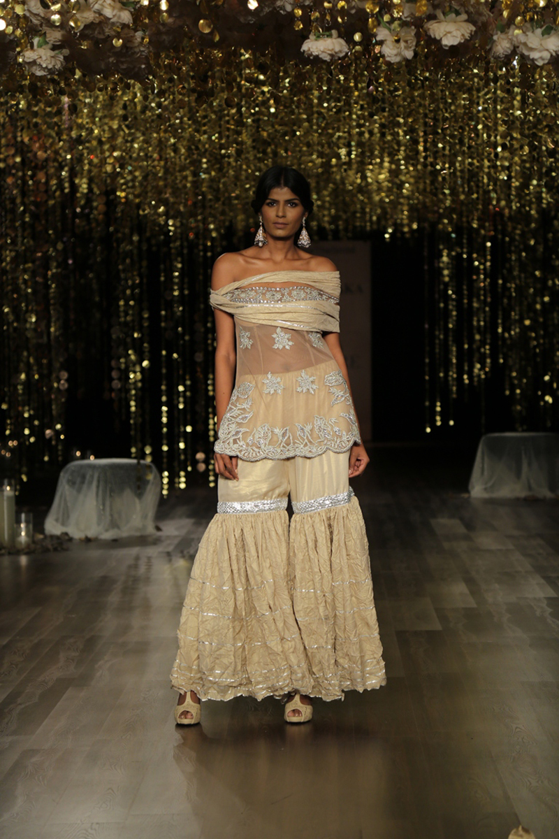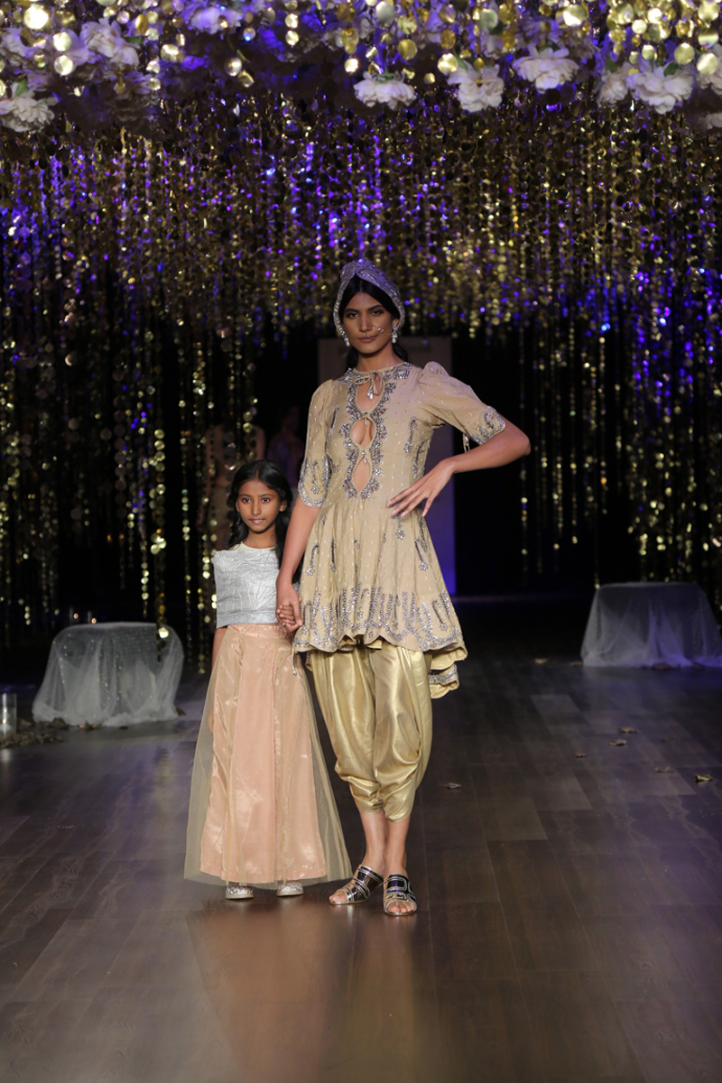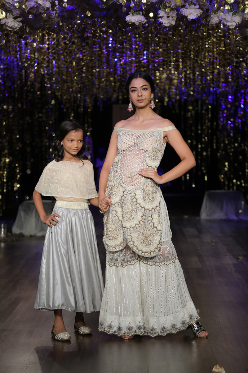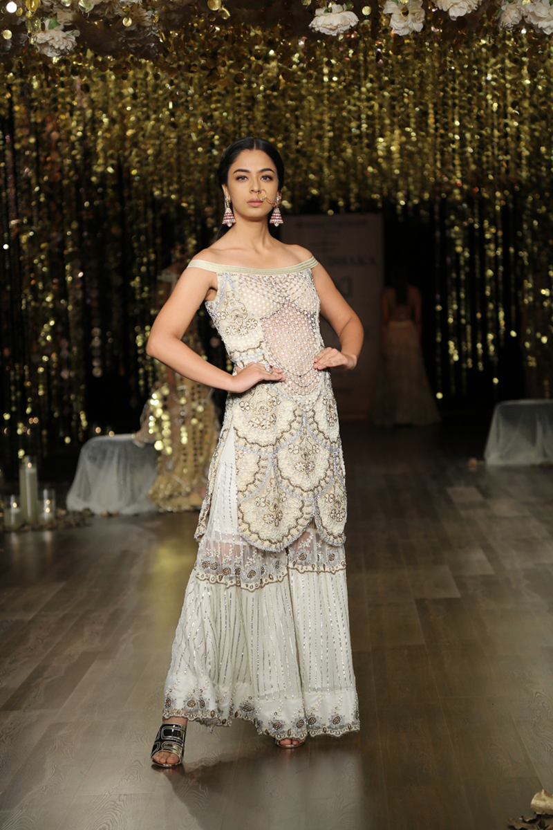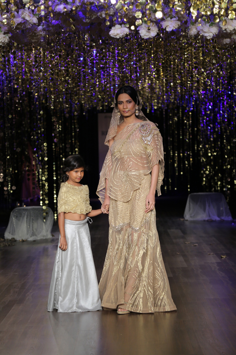 The collection showcases every womans love for jewellery, but on clothes. This season takes on strong metallics, mixing them together, blending and edging them with pearls. From dhoti to the sharara as a trouser, the designer has worked to refocus on the waist, shoulder and the hip. This show is also to support the girl child through the campaign. Through beads and baubles, necklines and hemlines, the collection is to remind every woman – Dont forget to smile. #HonorTheSmile