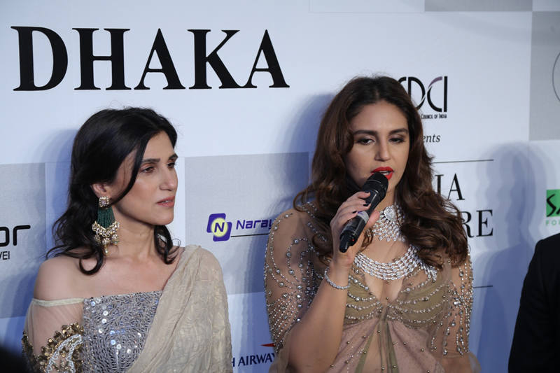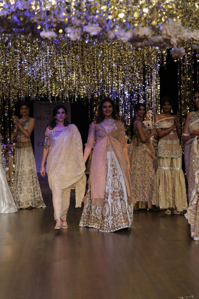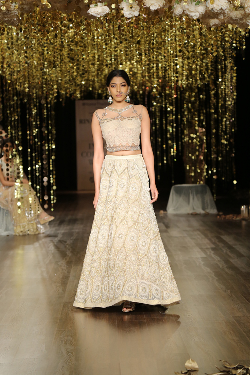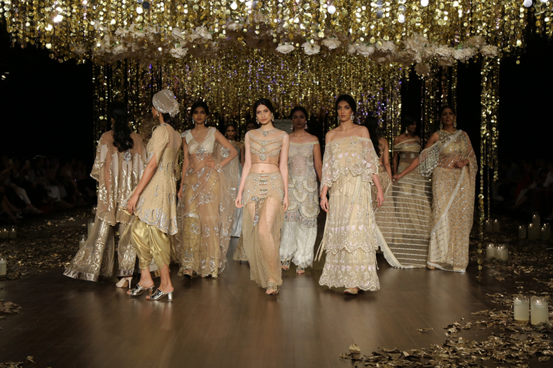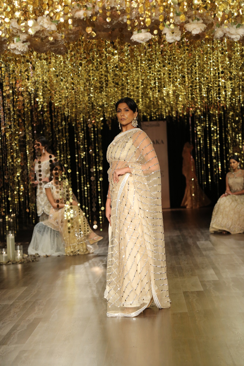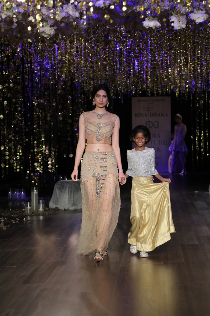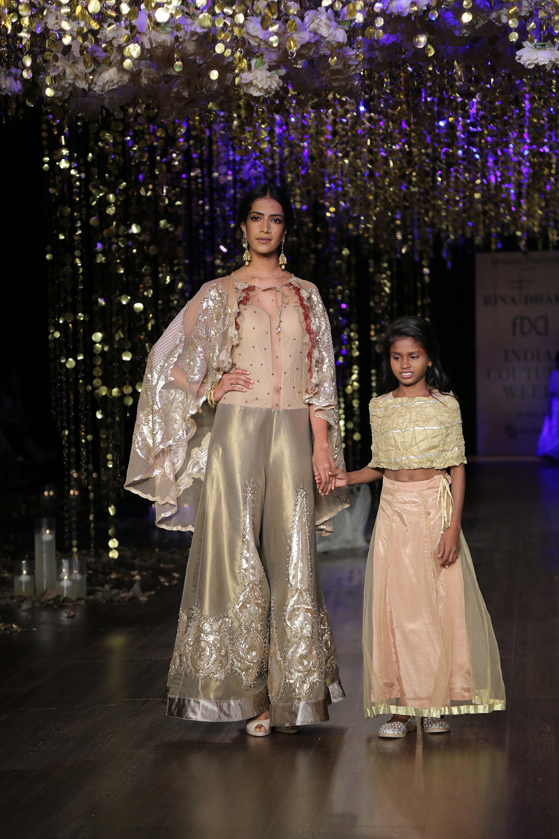 The collection showcases every womans love for jewellery, but on clothes. This season takes on strong metallics, mixing them together, blending and edging them with pearls. From dhoti to the sharara as a trouser, the designer has worked to refocus on the waist, shoulder and the hip. This show is also to support the girl child through the campaign. Through beads and baubles, necklines and hemlines, the collection is to remind every woman – Dont forget to smile. #HonorTheSmile