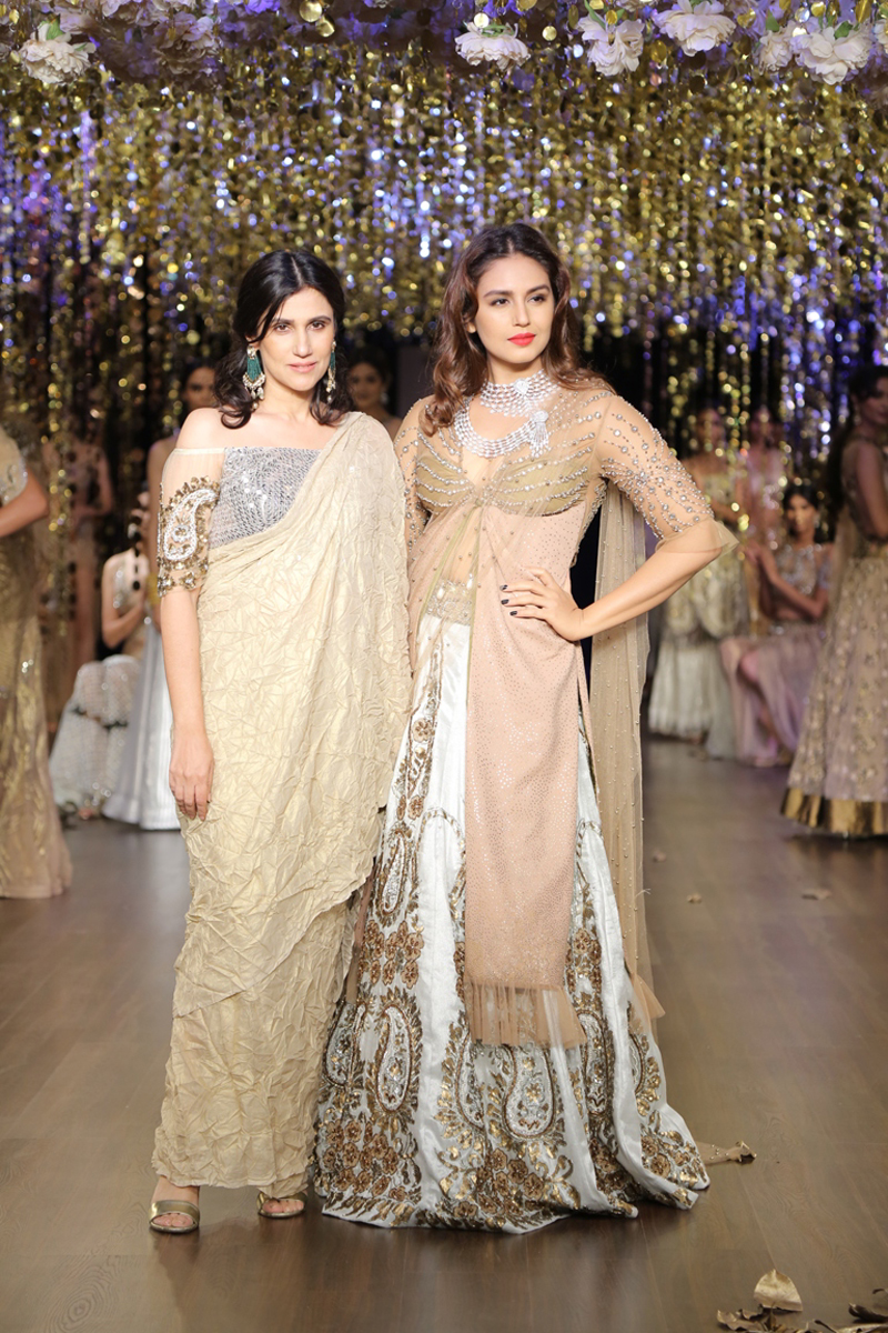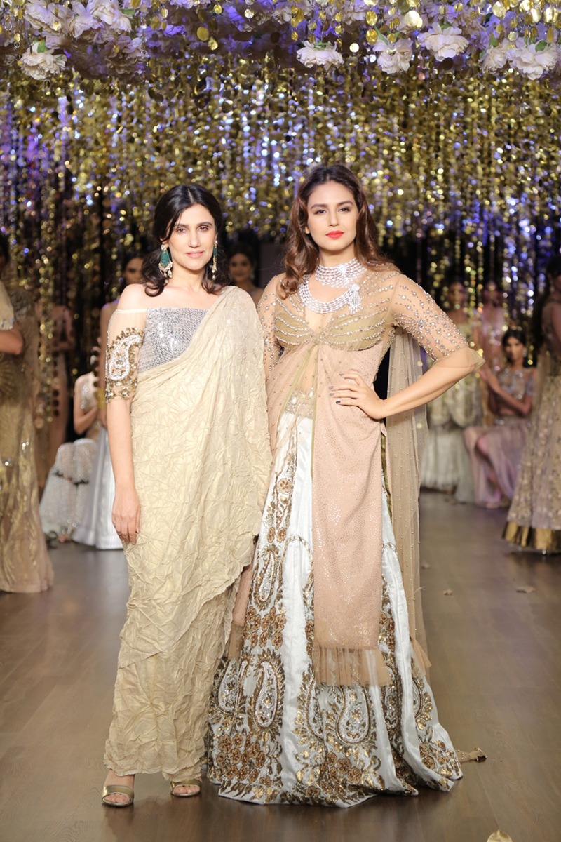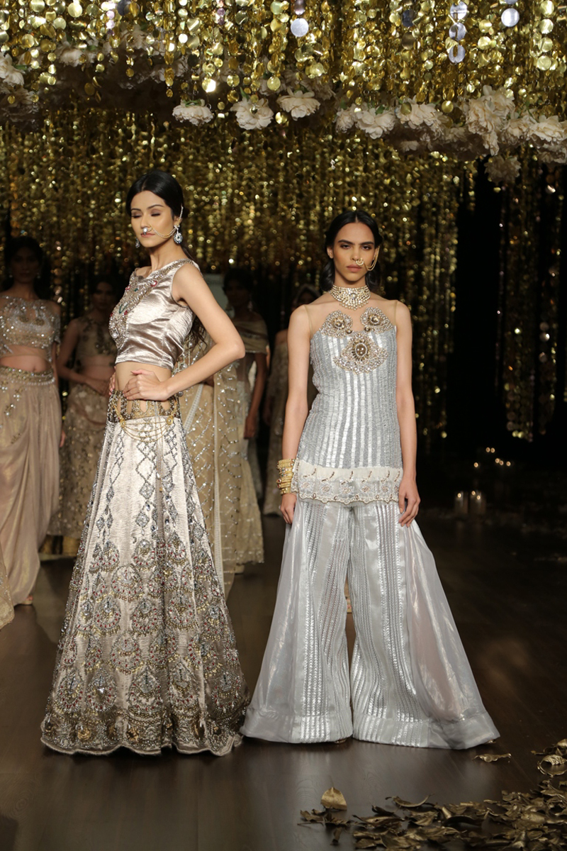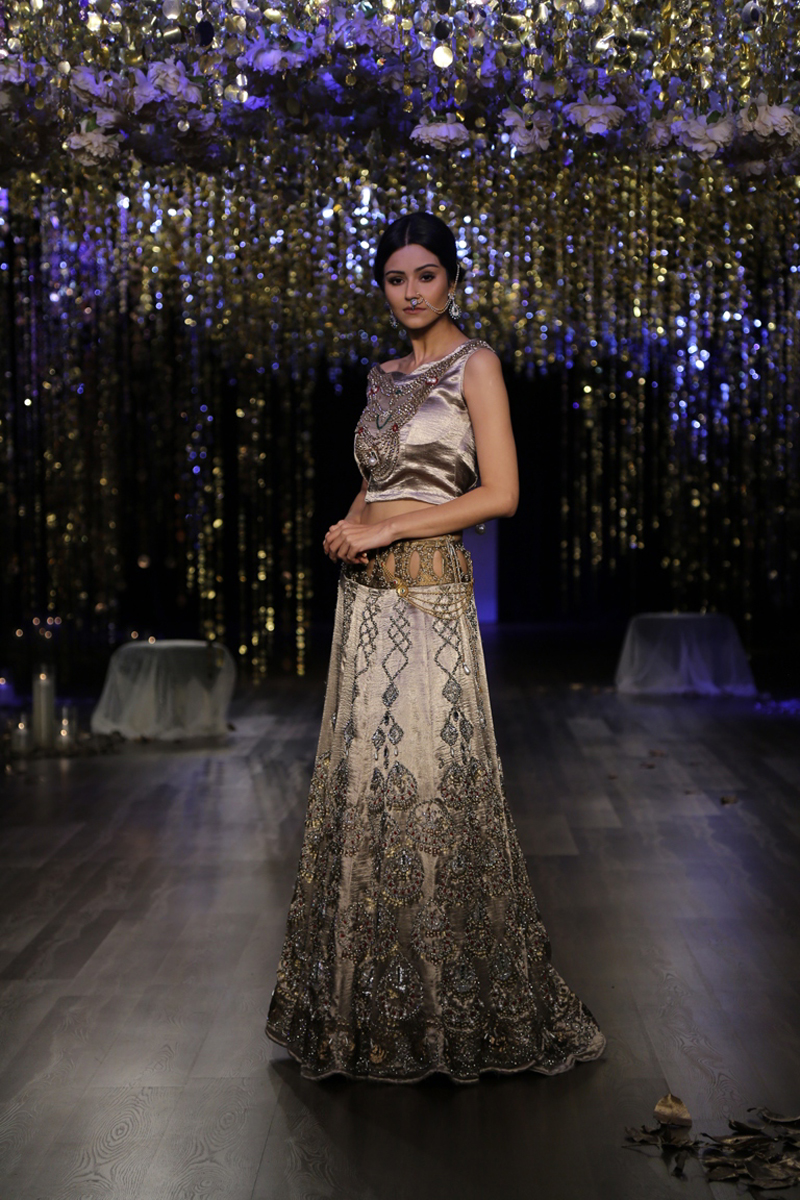 Her India Couture Week 2017 collection is a salute to the attires of the past as she continues to inspire the modern contemporary fashion world. The silhouettes are graceful in their softness and sensuality and the designs feature voluminous pieces, boldly parading the drama and opulence of royalty. Hues of golden, silver, pewter blended into the theme bring out the elegance of a regal time.