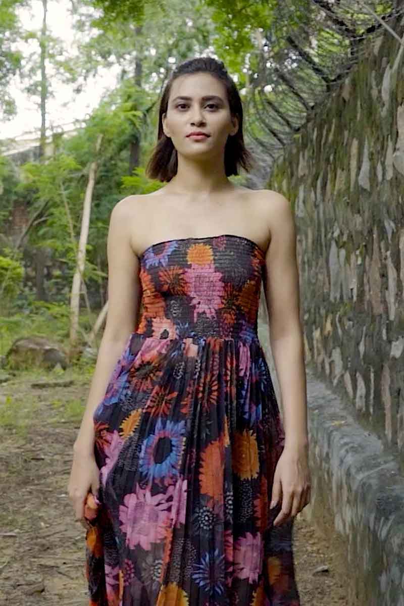 Particularly striking was the jumpsuit with a pleated detailing at the hem and belted with colourful, crafted touches. The strappy, swirling maxi and the off-shoulder version with a giant bow at the rear, will be perfect after dark options. The summery, floor length creations with cut-outs at the waist and the lavish embroidery at the hemline, would be an ideal semi formal choice. The plunging ‘V’ neckline midi, wrap blouse, will-powered, printed maxi, belted kaftan, bralette with sarong skirt and the voluminous maxi had a fun element. There was a marked play of sheer and solid along with an occasional emphasis on balloon sleeves, while a wrap skirt with drawstring was ideal easy wear.