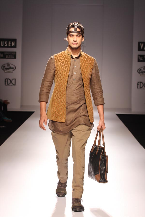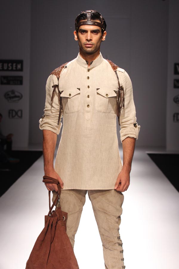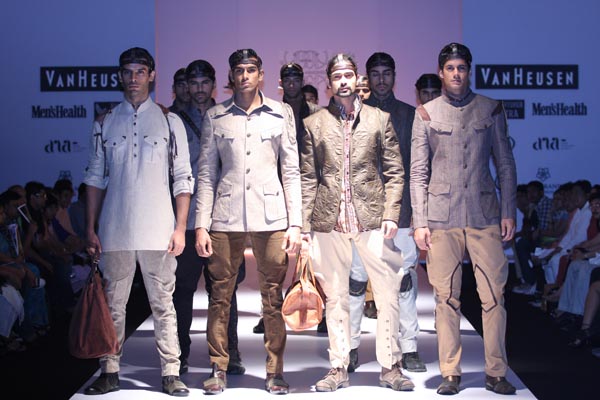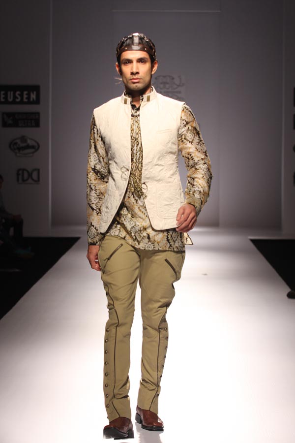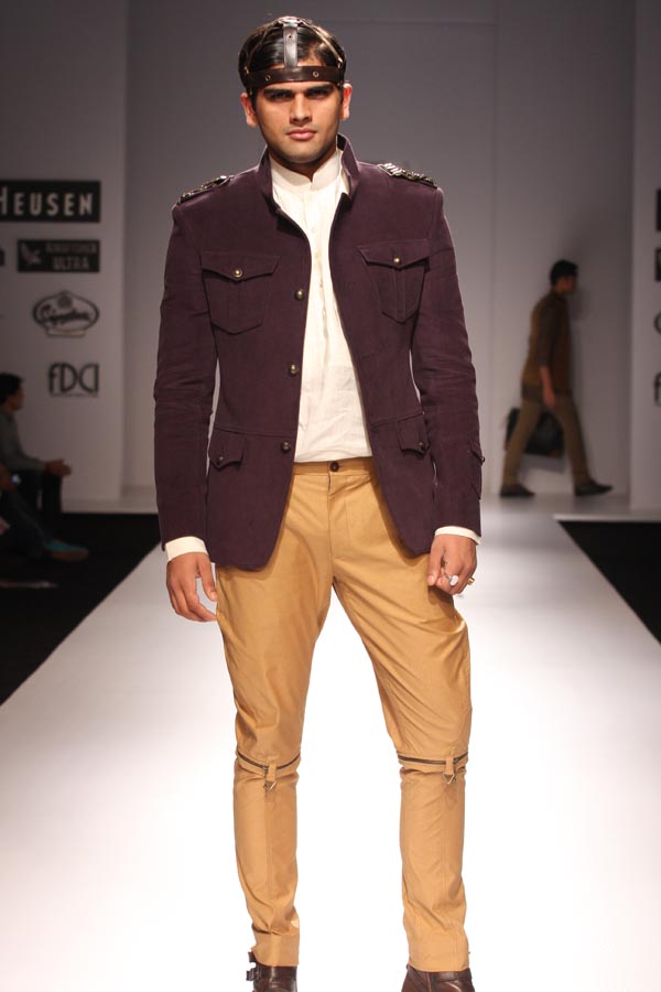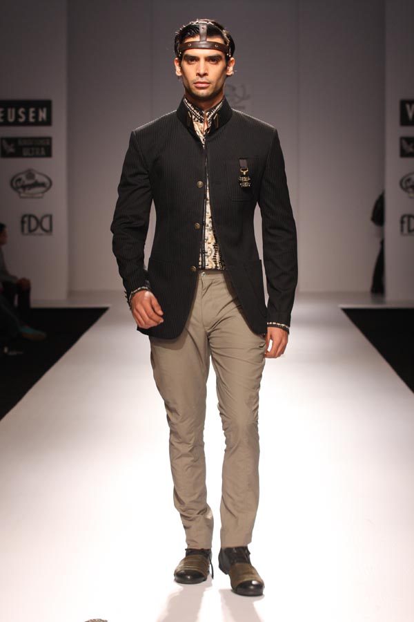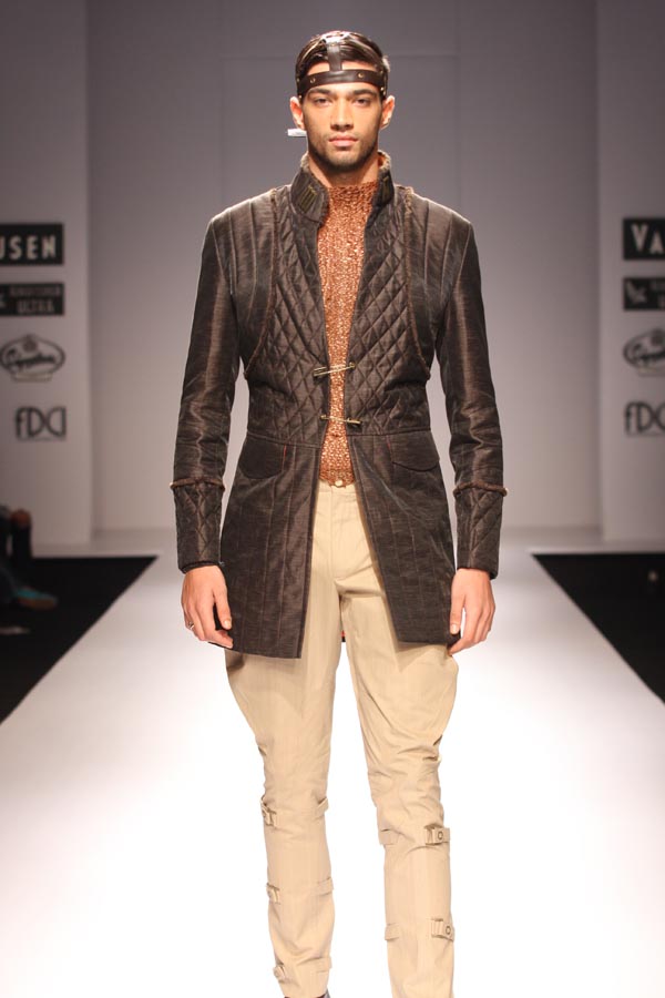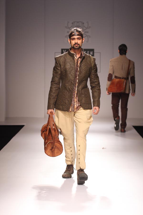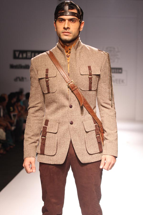 MAN HAS COMEnNow has come Man supreme nThe gates guarding the moonless night have fallen,nThe hill of sunrise rings with the call “Fear not”nAnd ushers in the dawn of a new life!nThe heavens thunder the song of victory:n”Man has Come ” n Rabindranath Tagoren nThe collection has a predominant military feel but is effortlessly stylish and cool. The silhouettes are masculine with a twist on urban tailoring where the jackets are dramatically stylized with high essence of metal accessories. The color palette revolves around a Vintage feel, starting from black to grey, brown to beige, army to sap green with flashes of Egyptian blue and white. n nBuyer ContactnN: Rohit KamranM: +91 9829449988, 9214449988nT: +91 141 4022288, 6455888nE: kamra.r@gmail.comn nPress ContactnN: Rohit KamranM: +91 9829449988, 9214449988nT: +91 141 4022288, 6455888