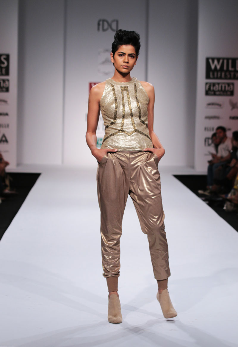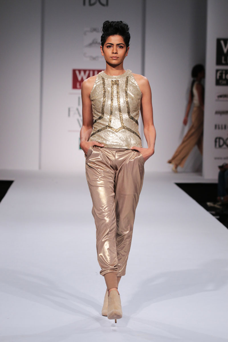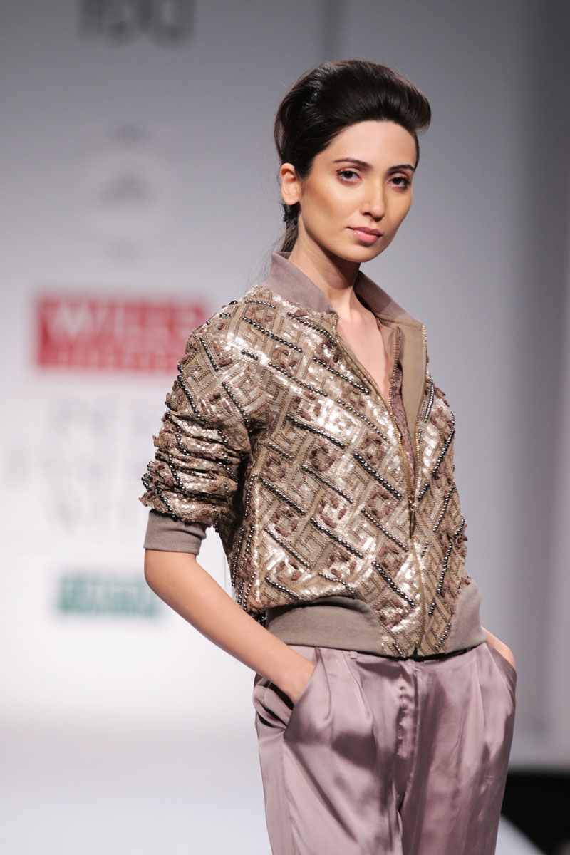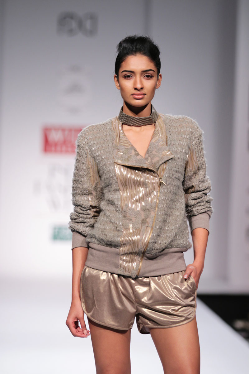 nSAAJ today not only capitalizes Ankitas creative traits to conjure masterpieces of great elegance and grandeur, but also SAAJ teams exceptional & immense tact and insight to steer the company on to a path of growth and successnThe AW 14-15 collection is based on a sporty vibe that doesn’t tone down the “glam”. The colour palette ranges from ivory to gold metallics and is characterised by clean straight geometrical patterns to compliment the design philosophy as a whole.n