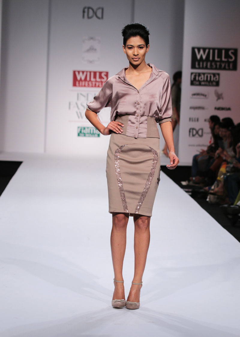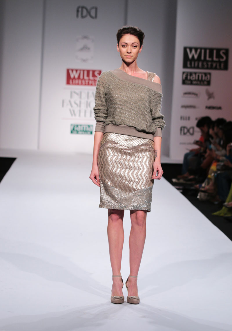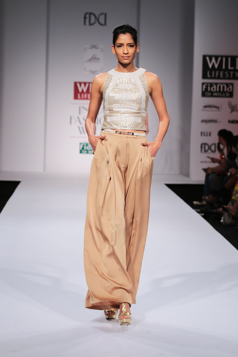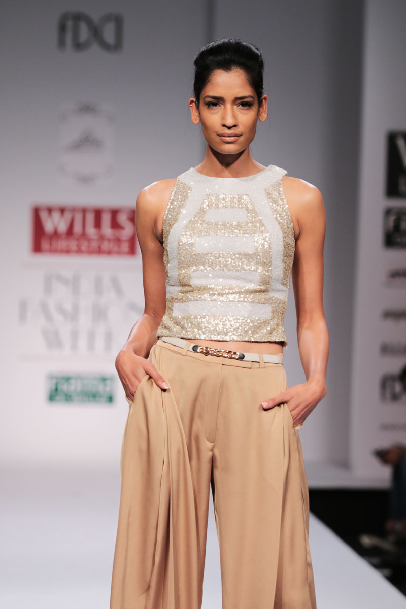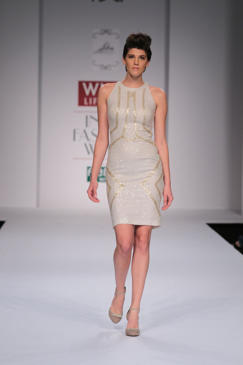 nSAAJ today not only capitalizes Ankitas creative traits to conjure masterpieces of great elegance and grandeur, but also SAAJ teams exceptional & immense tact and insight to steer the company on to a path of growth and successnThe AW 14-15 collection is based on a sporty vibe that doesn’t tone down the “glam”. The colour palette ranges from ivory to gold metallics and is characterised by clean straight geometrical patterns to compliment the design philosophy as a whole.n