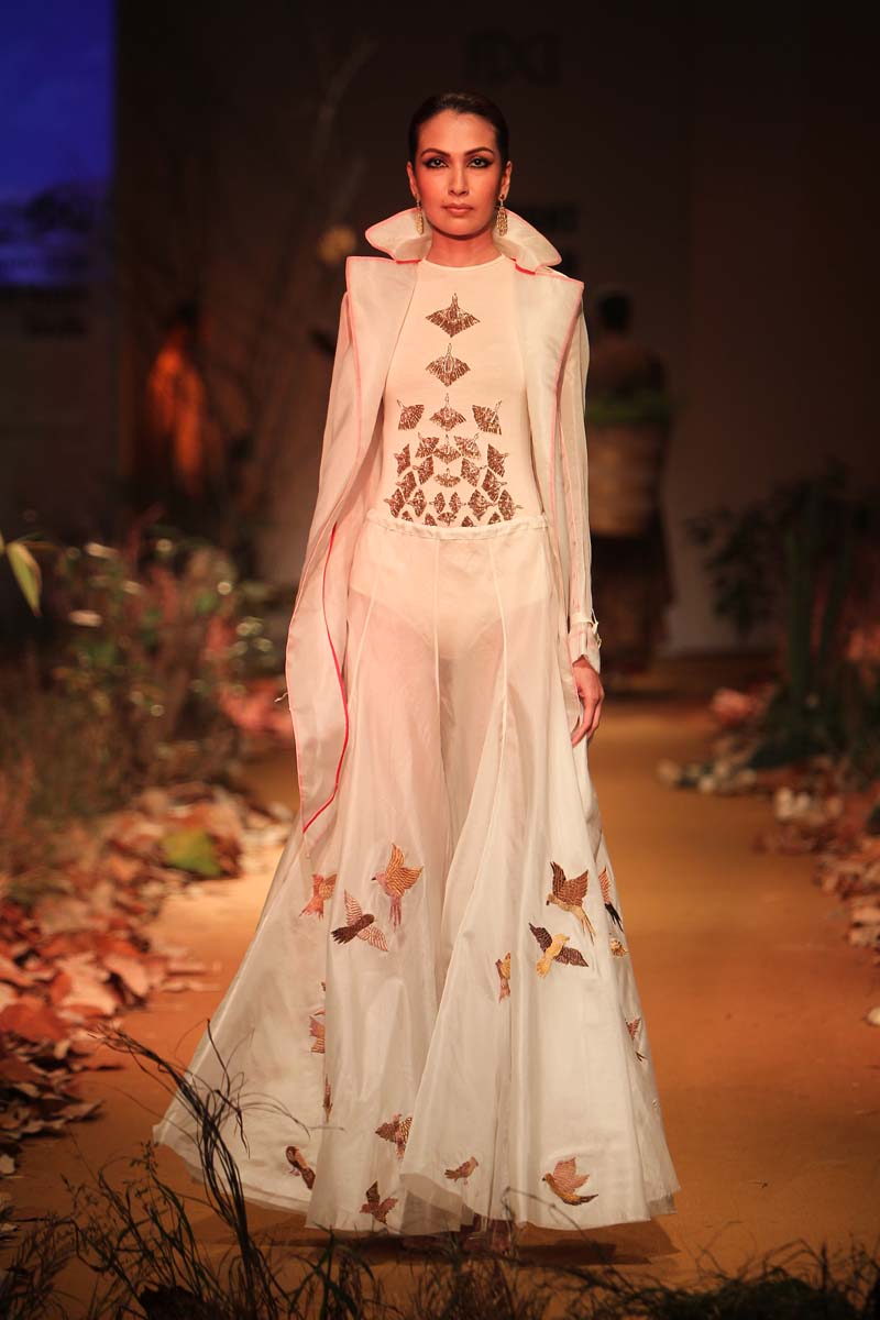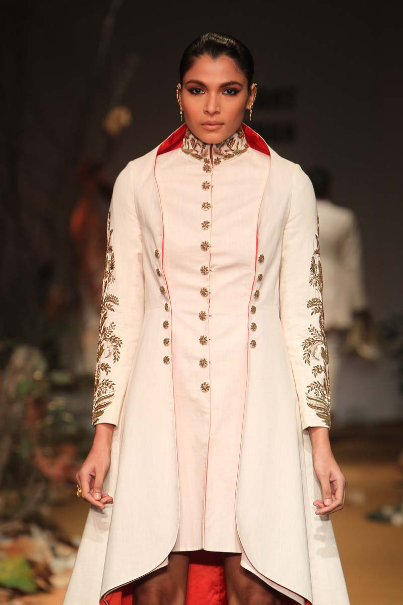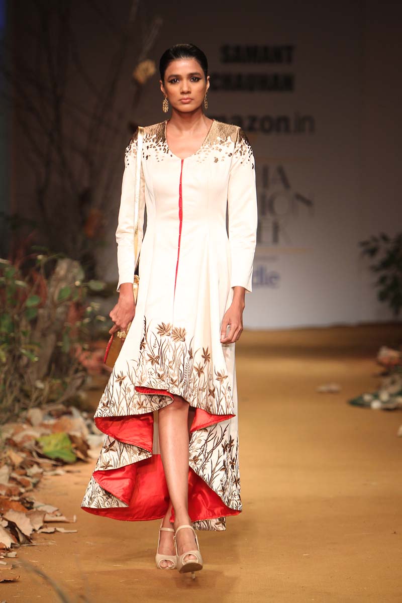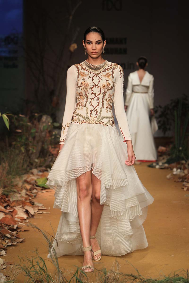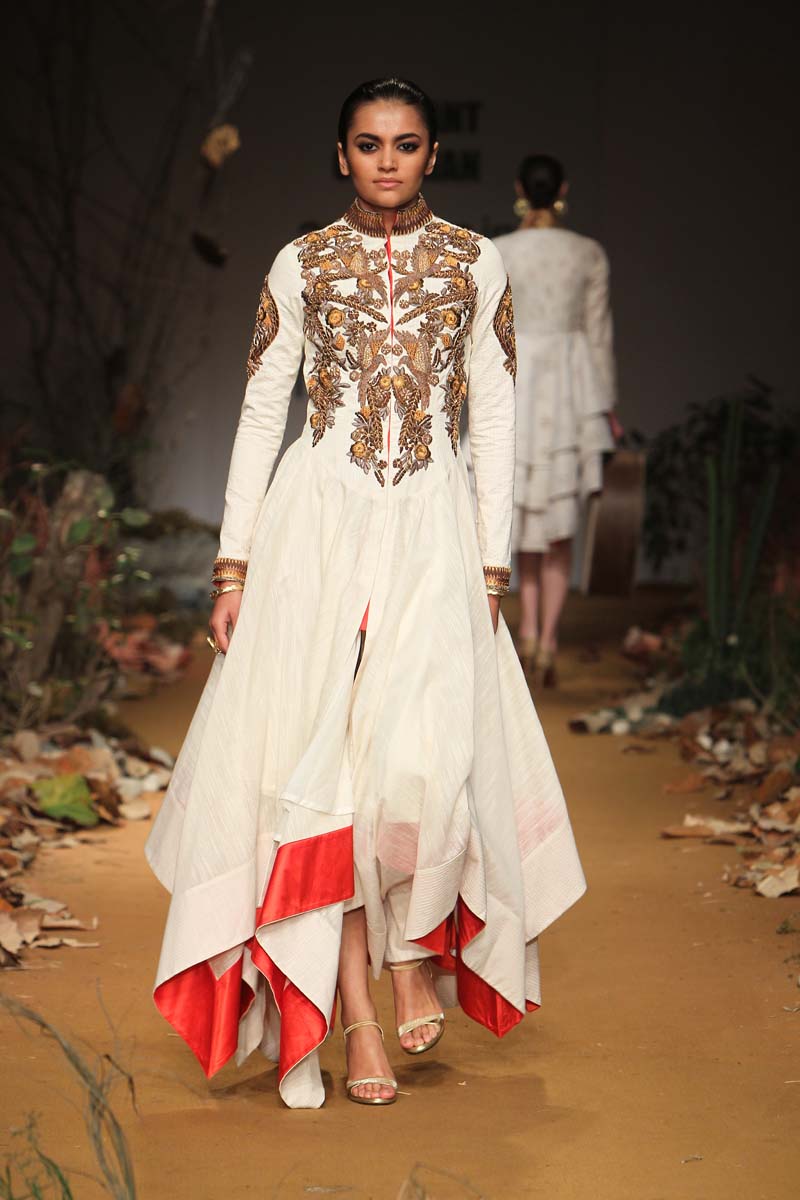 Samant Chauhan, a NIFT alumni, having won four major awards at his graduating show, made a mark with his first show at the Singapore Fashion week with his collection for men and followed it with another collection named “Kamasutra” at India fashion week. Here he got the media and buyers very interested in his textiles and was invited to participate in the London Fashion weeks, which he has been a part ever since. He is ready to showcase his spring’09 collection at a show in Paris at the world famous Carousel Du Louvre.n nKnown for his textures that are created with the use of unusual silk yarns and the embellishments kept to minimal, Chauhan has made a new tryst into fashion with his latest collection for women with his “autumn wedding”.He has always worked with the silk and textiles that are hand woven and hand knitted, 100 per cent eco-friendly textiles.Today the label Samant Chauhan is stocked in several stores across the globe along with the leading multi designer stores in India.n n”Rajputana represents the rich heritage and culture with a new twist every season. I aim at adding new flavor in every new collection without losing the charm of the previous ones. Rajputana is a result of my imagination with the unceasing research being done.”n n “A rich use of my core fabric, Bhagalpur Tussar silk in new innovative textures combined with embroideries can be seen. My collection is a blend of flowy and bohemian silhouettes . Moreover, the richness in the collection is preserved with the use of zardozi handwork embroideries.”n nTo depict the tradition of worshipping female energy, the Autumn Winter 2015 Collection represents purity and divine energy, also representing sixteen forms of “kumara” which are sandhya, sarasvati, Tridhamurti, kalika, subhaga, Uma, Malini, kubjika, Kaalasandarbha, Aparajita, Rudrani, Bhairavi, Mahalakshmi , Pithanayika Kshetragya and Ambika. The A/W 15 slow ” current invites the designer to take the time to see things… in details and to indulge in the desire for well made, high quality products whose studied design and expert crafting are the signature of opulent good taste, slow luxury. High and low tech, charm and artsy savvy, velvets – sit next to faded silk fabric, suede, shiny zari aspects with touches of gold for thread and accessories, pearls and unique prints. Spotlights on wooden sole shoe – even with very elegant silhouettes. Long dresses, with add of silk. A deep color range hint on whites adds a Statement this season, depicting purity, the silk coats and layered look, with plush wool hint.” n nA color range of Deep And tarnished jewel or metal tones, luminous marble white, with its burnished luster. n n