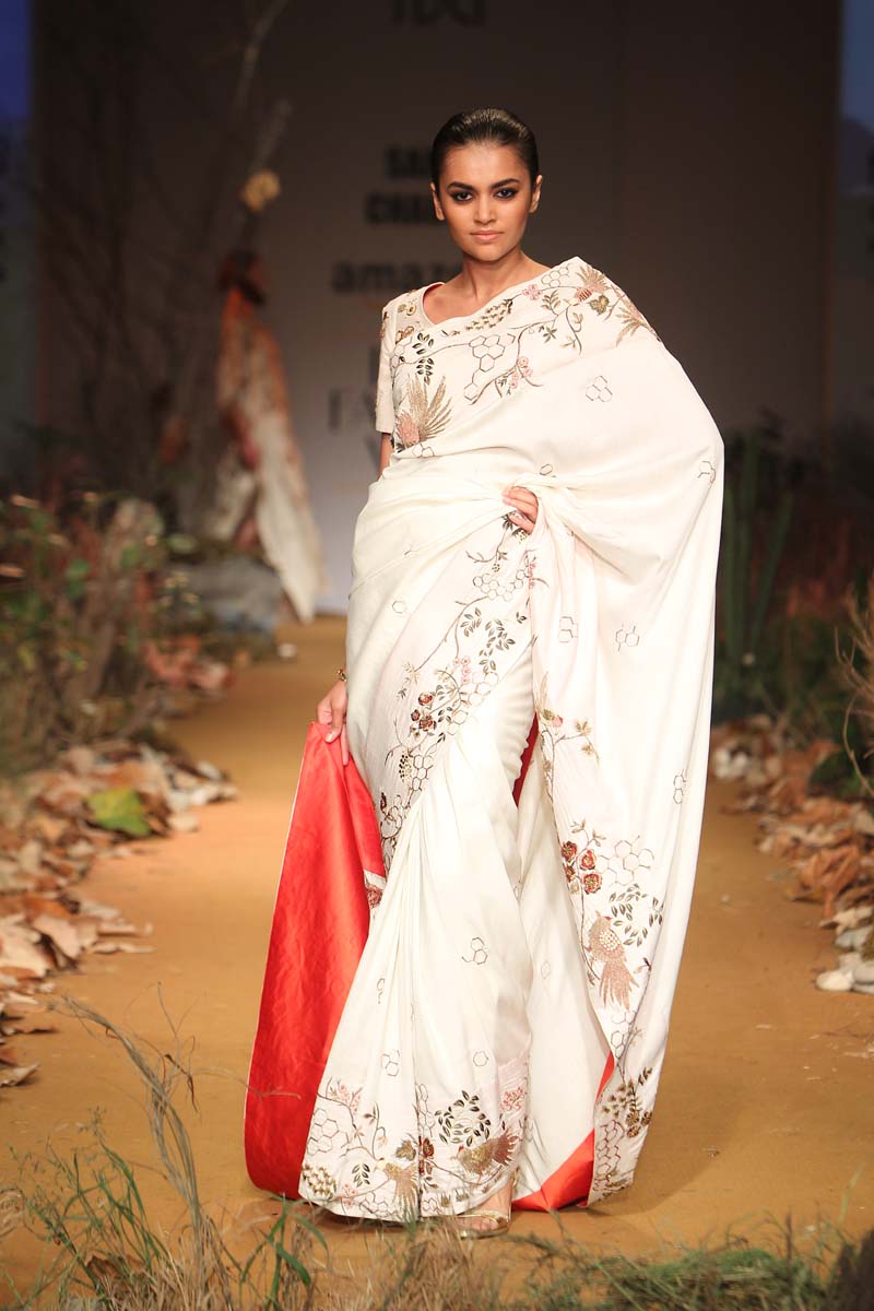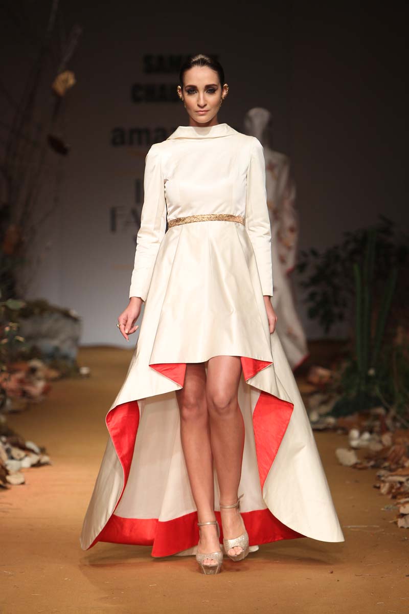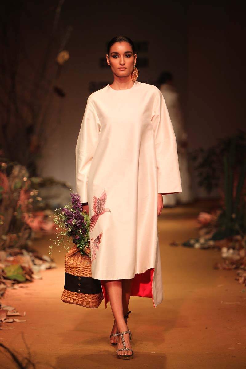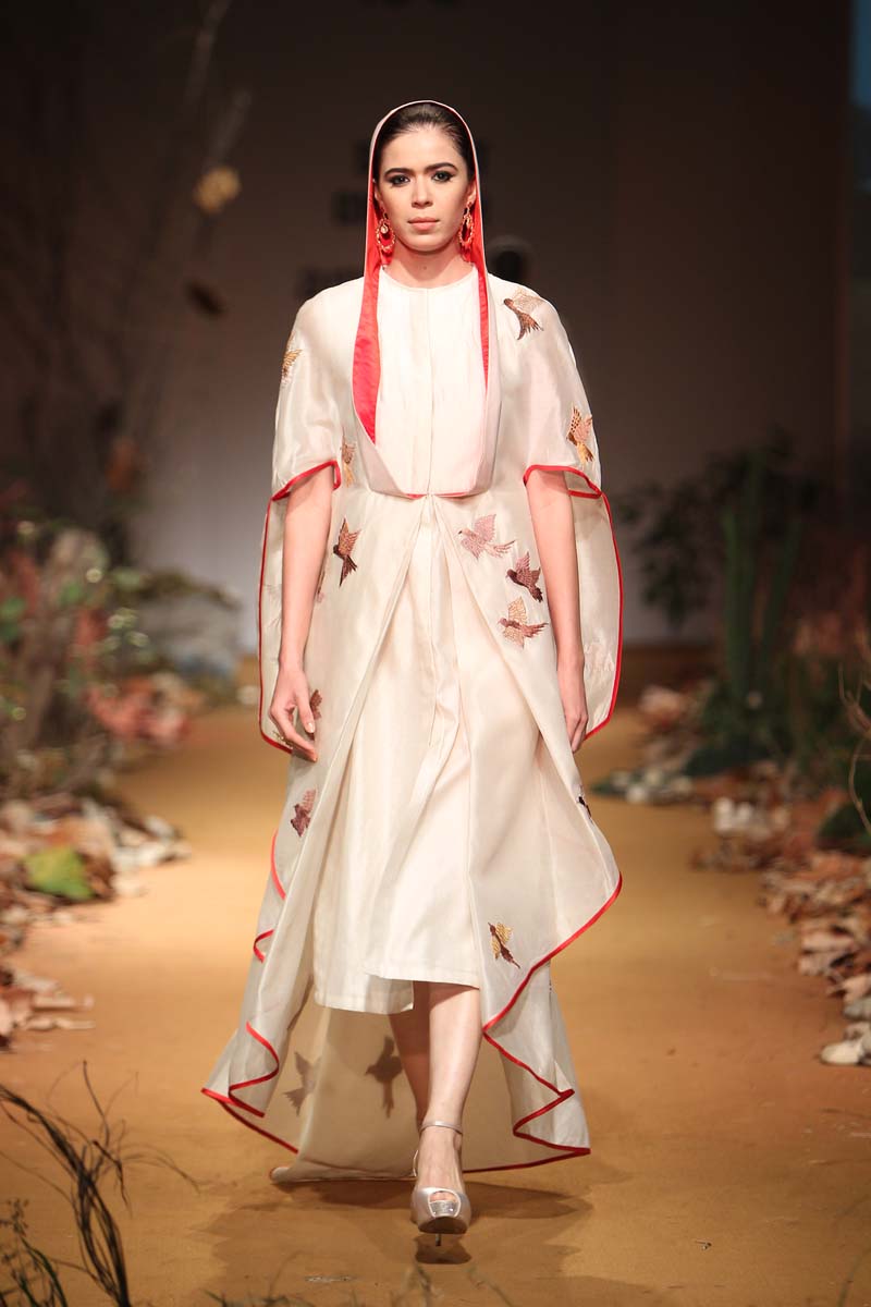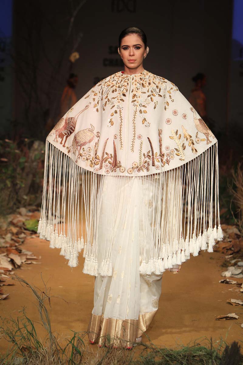 Samant Chauhan, a NIFT alumni, having won four major awards at his graduating show, made a mark with his first show at the Singapore Fashion week with his collection for men and followed it with another collection named “Kamasutra” at India fashion week. Here he got the media and buyers very interested in his textiles and was invited to participate in the London Fashion weeks, which he has been a part ever since. He is ready to showcase his spring’09 collection at a show in Paris at the world famous Carousel Du Louvre.n nKnown for his textures that are created with the use of unusual silk yarns and the embellishments kept to minimal, Chauhan has made a new tryst into fashion with his latest collection for women with his “autumn wedding”.He has always worked with the silk and textiles that are hand woven and hand knitted, 100 per cent eco-friendly textiles.Today the label Samant Chauhan is stocked in several stores across the globe along with the leading multi designer stores in India.n n”Rajputana represents the rich heritage and culture with a new twist every season. I aim at adding new flavor in every new collection without losing the charm of the previous ones. Rajputana is a result of my imagination with the unceasing research being done.”n n “A rich use of my core fabric, Bhagalpur Tussar silk in new innovative textures combined with embroideries can be seen. My collection is a blend of flowy and bohemian silhouettes . Moreover, the richness in the collection is preserved with the use of zardozi handwork embroideries.”n nTo depict the tradition of worshipping female energy, the Autumn Winter 2015 Collection represents purity and divine energy, also representing sixteen forms of “kumara” which are sandhya, sarasvati, Tridhamurti, kalika, subhaga, Uma, Malini, kubjika, Kaalasandarbha, Aparajita, Rudrani, Bhairavi, Mahalakshmi , Pithanayika Kshetragya and Ambika. The A/W 15 slow ” current invites the designer to take the time to see things… in details and to indulge in the desire for well made, high quality products whose studied design and expert crafting are the signature of opulent good taste, slow luxury. High and low tech, charm and artsy savvy, velvets – sit next to faded silk fabric, suede, shiny zari aspects with touches of gold for thread and accessories, pearls and unique prints. Spotlights on wooden sole shoe – even with very elegant silhouettes. Long dresses, with add of silk. A deep color range hint on whites adds a Statement this season, depicting purity, the silk coats and layered look, with plush wool hint.” n nA color range of Deep And tarnished jewel or metal tones, luminous marble white, with its burnished luster. n n