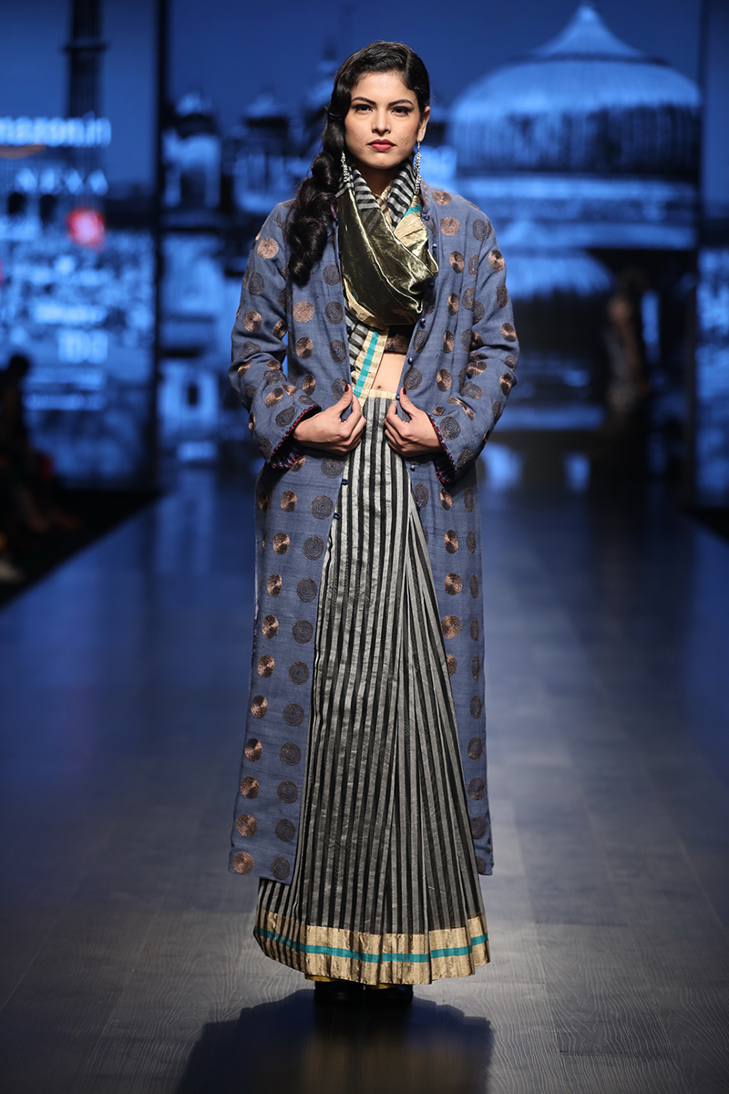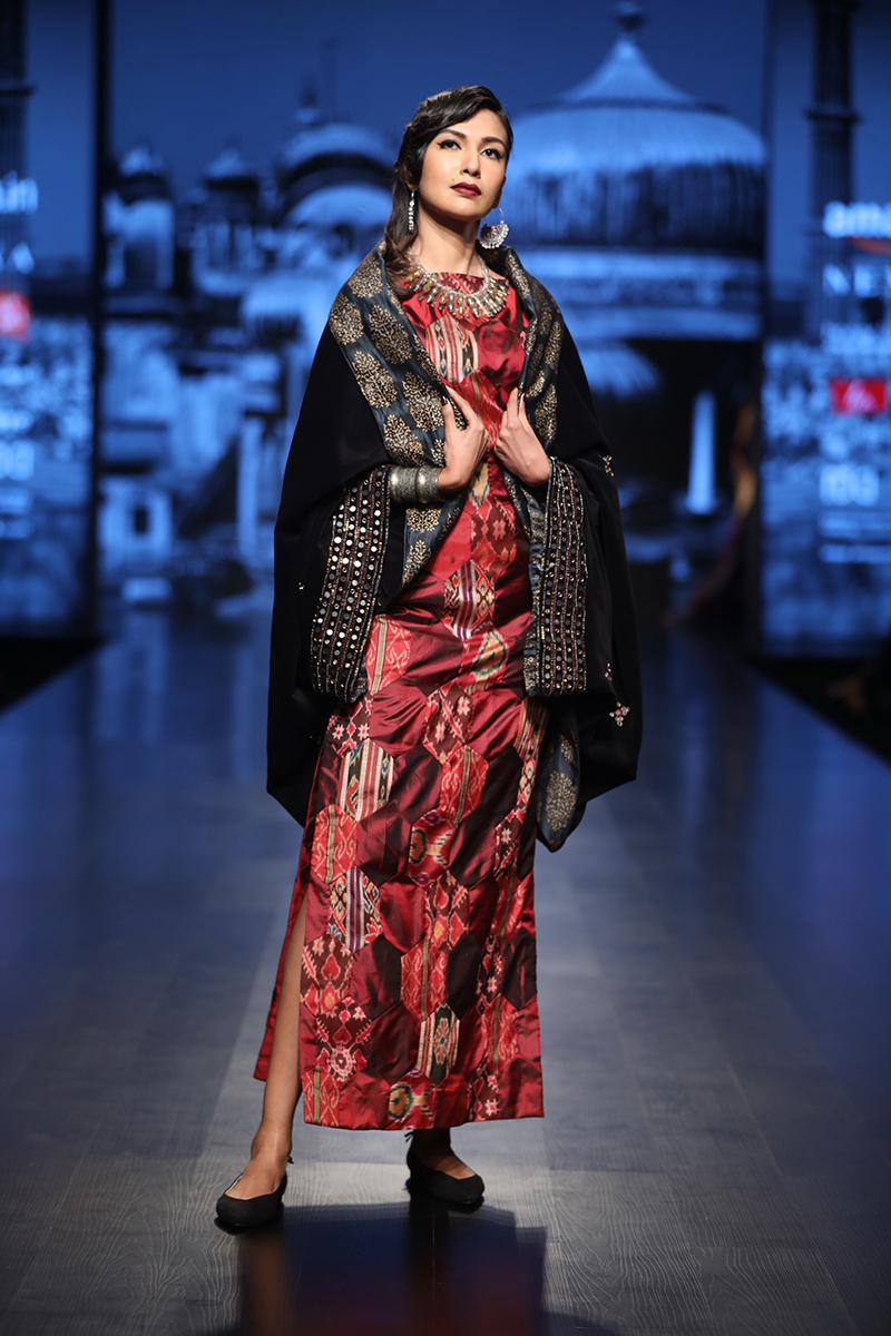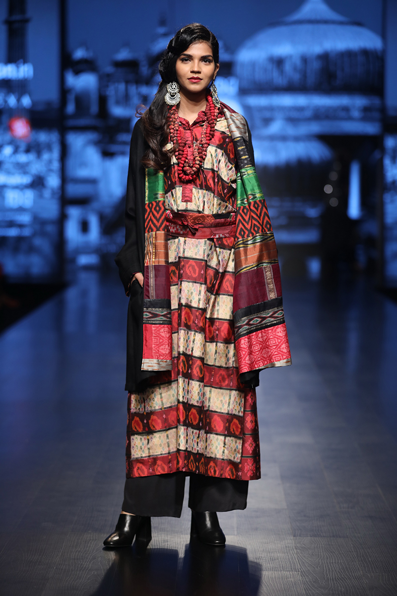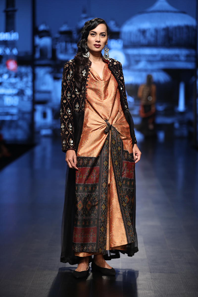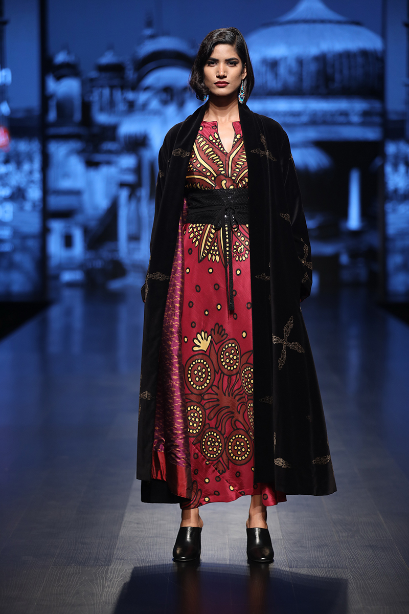 nCosmic Fragments — A sustainable collection based on the elements in nature symbols and prints that reflect life. This collection has been to return to balance, to find solace in artisanal work done by hand, printing, embroidery and weaving with an awareness of each other abilities and the natural interdependence that we have with each other and nature. This consciousness of our lives and the need to build a diverse harmonious world is the call of the day. Multicultural values and the strengths derived from this have become important aspects for global growth and sustenance. It juxtaposes contrasts between traditional textiles like Ikats and cotton Khadi and Eri Silk in rich earth color with embroidered velvet and iridescent georgettes to create a cotemporary repertoire for the modern woman.n