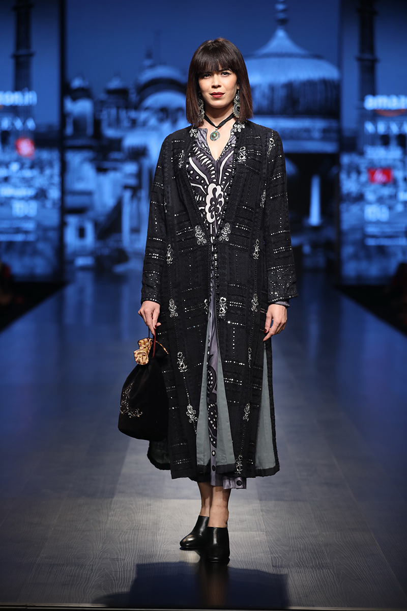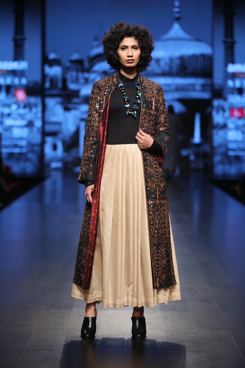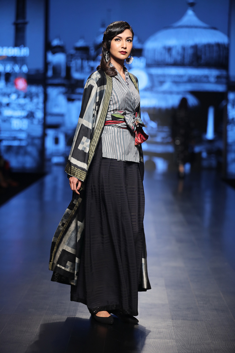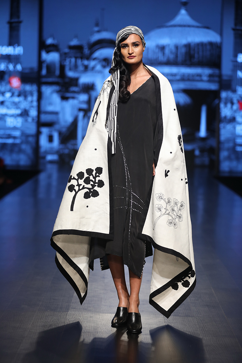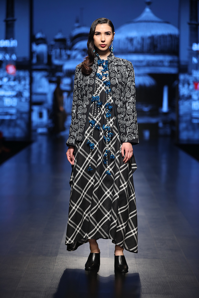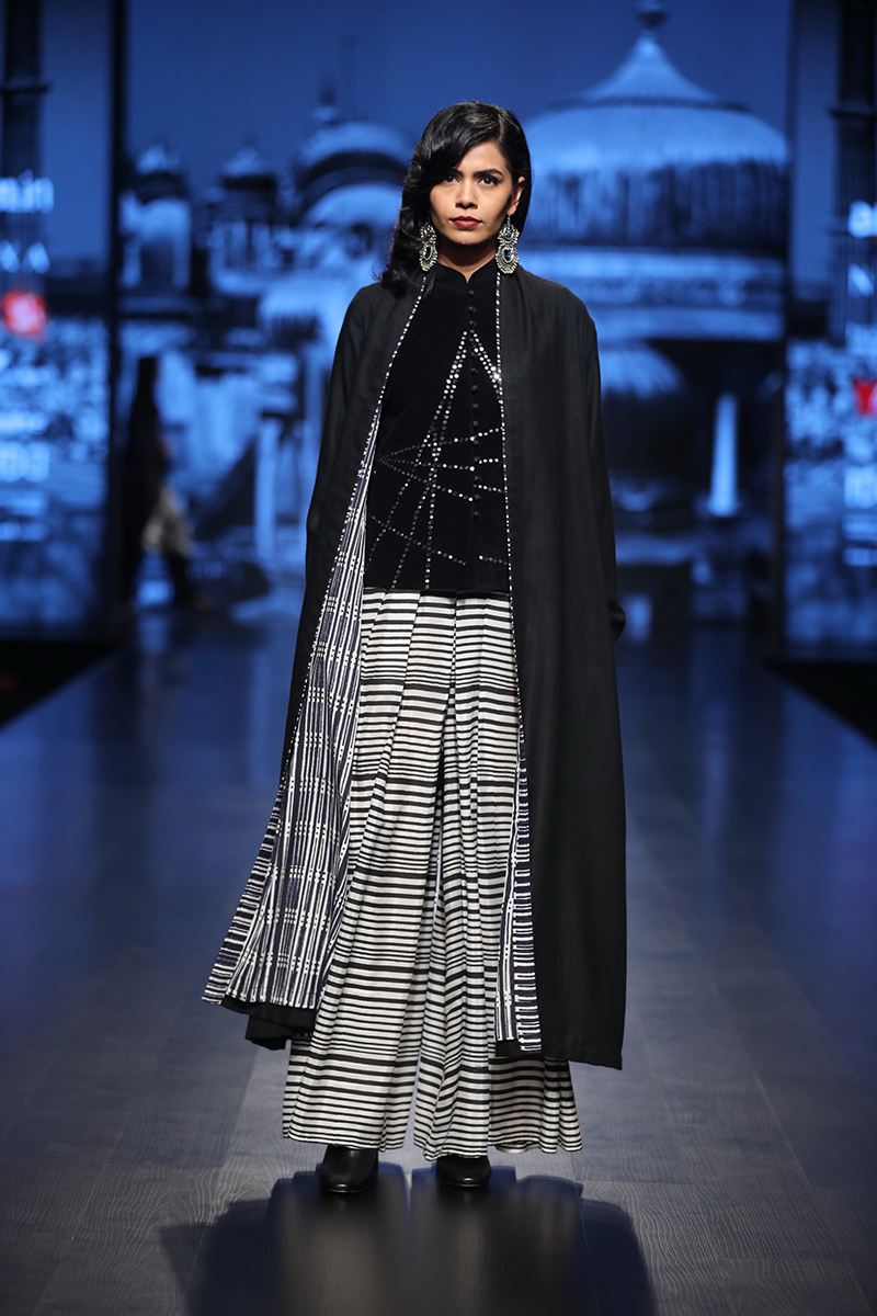nCosmic Fragments — A sustainable collection based on the elements in nature symbols and prints that reflect life. This collection has been to return to balance, to find solace in artisanal work done by hand, printing, embroidery and weaving with an awareness of each other abilities and the natural interdependence that we have with each other and nature. This consciousness of our lives and the need to build a diverse harmonious world is the call of the day. Multicultural values and the strengths derived from this have become important aspects for global growth and sustenance. It juxtaposes contrasts between traditional textiles like Ikats and cotton Khadi and Eri Silk in rich earth color with embroidered velvet and iridescent georgettes to create a cotemporary repertoire for the modern woman.n