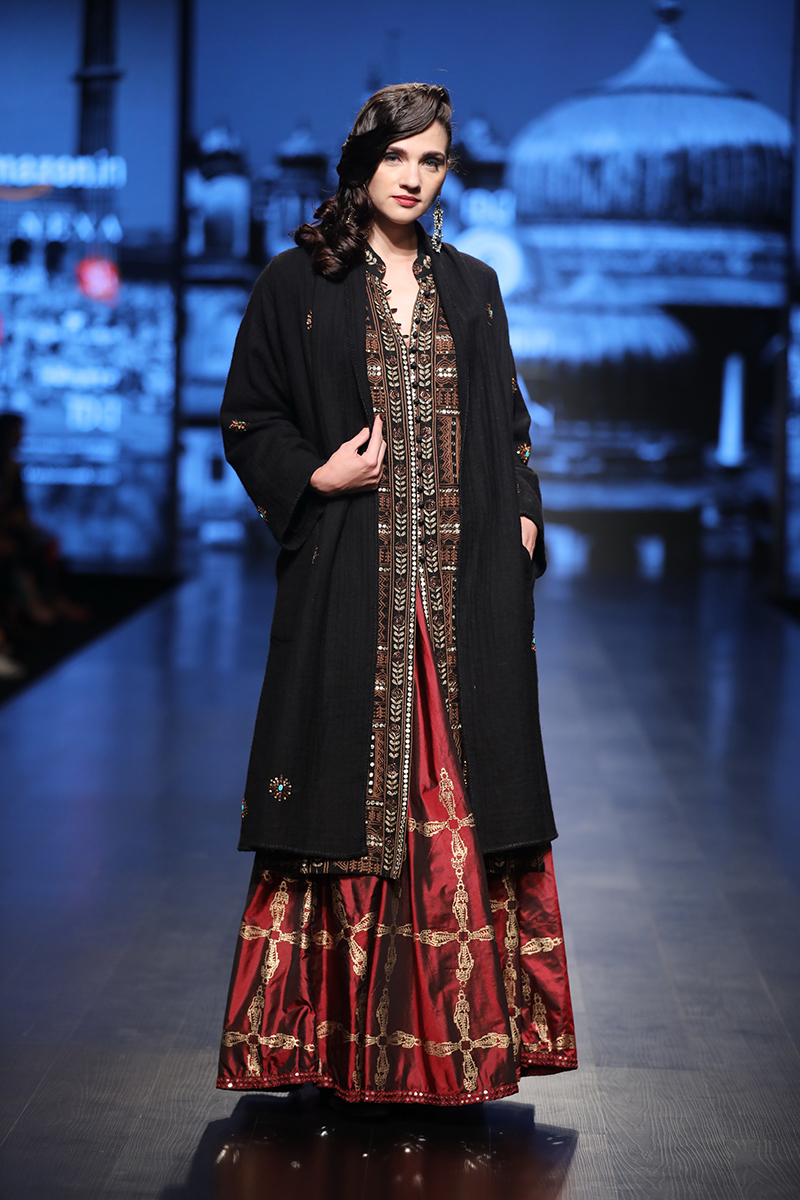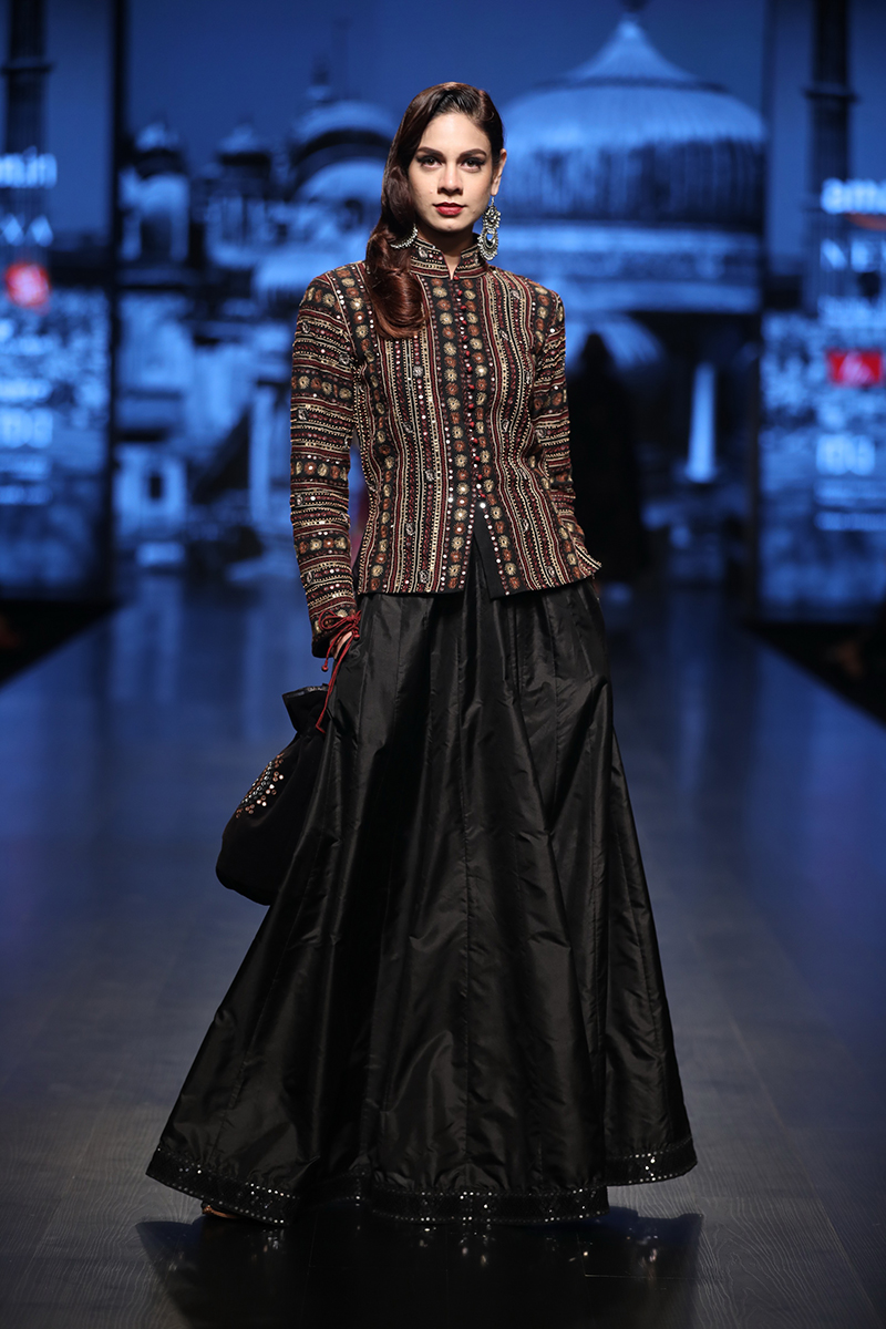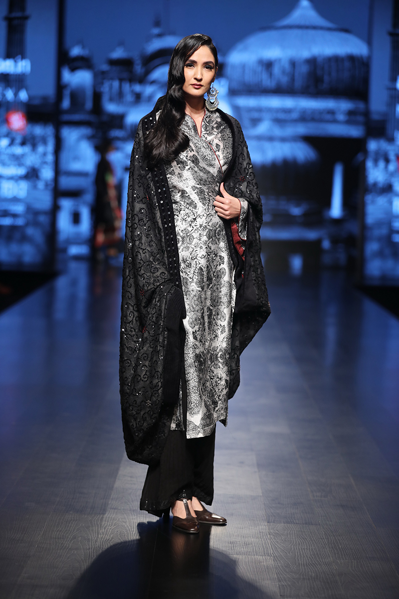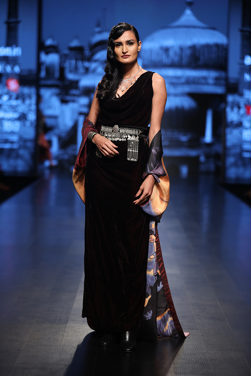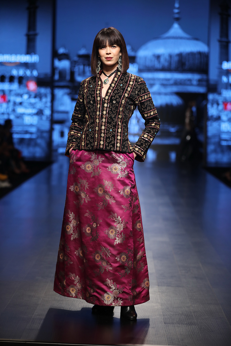 nCosmic Fragments — A sustainable collection based on the elements in nature symbols and prints that reflect life. This collection has been to return to balance, to find solace in artisanal work done by hand, printing, embroidery and weaving with an awareness of each other abilities and the natural interdependence that we have with each other and nature. This consciousness of our lives and the need to build a diverse harmonious world is the call of the day. Multicultural values and the strengths derived from this have become important aspects for global growth and sustenance. It juxtaposes contrasts between traditional textiles like Ikats and cotton Khadi and Eri Silk in rich earth color with embroidered velvet and iridescent georgettes to create a cotemporary repertoire for the modern woman.n