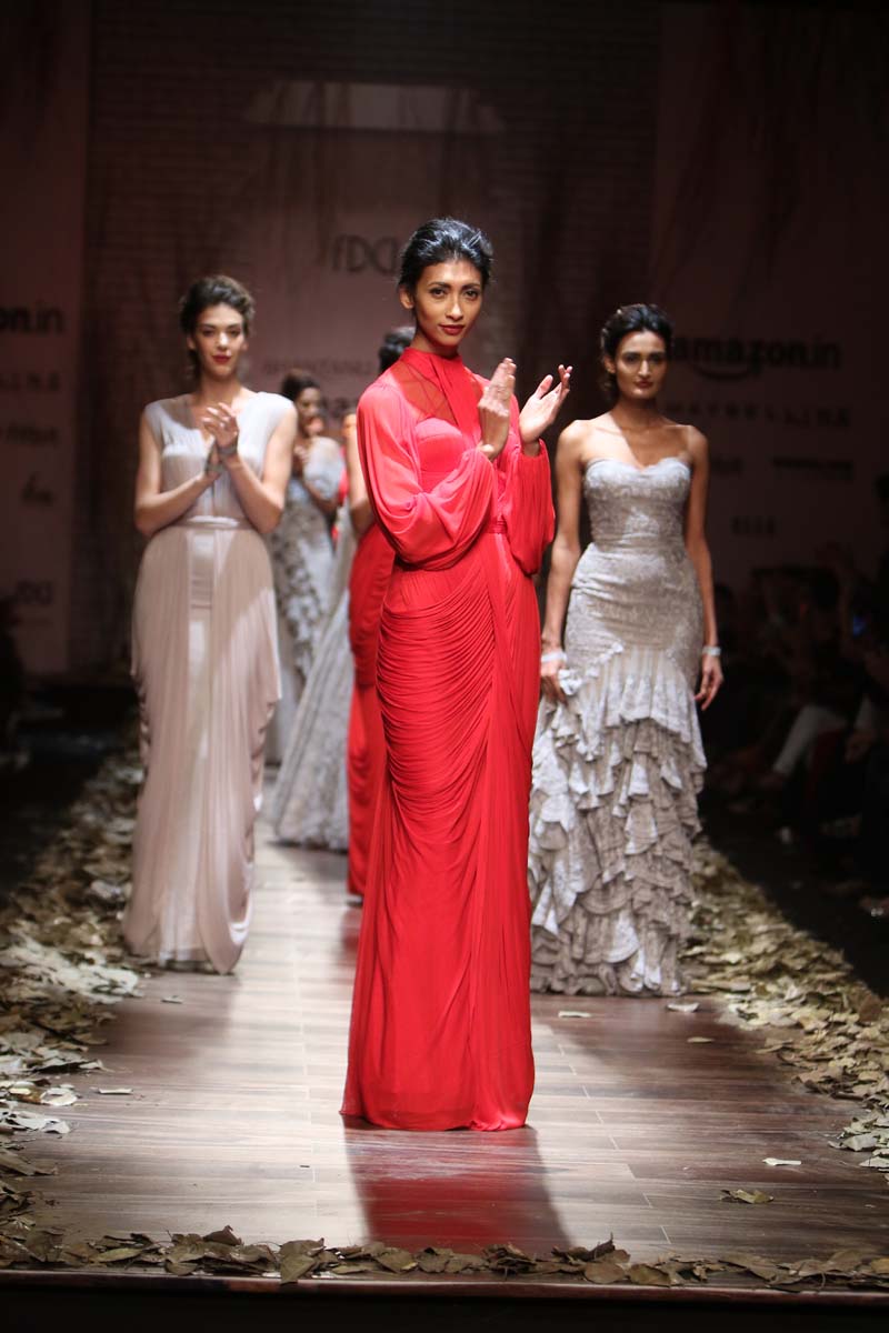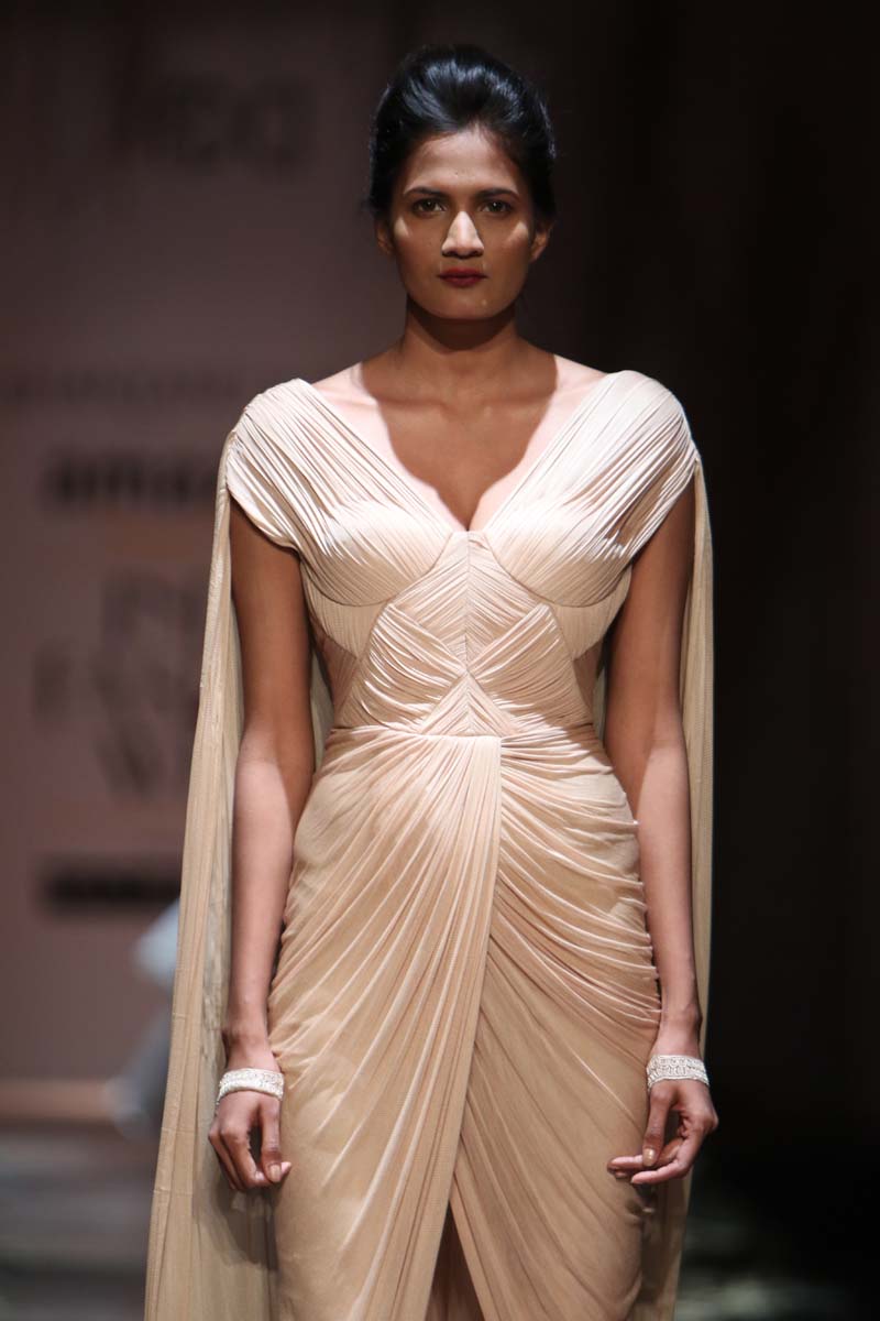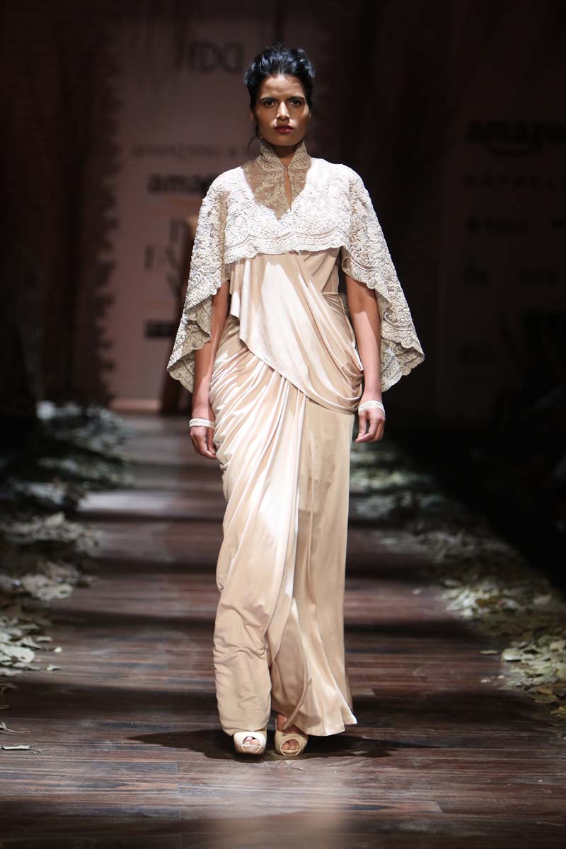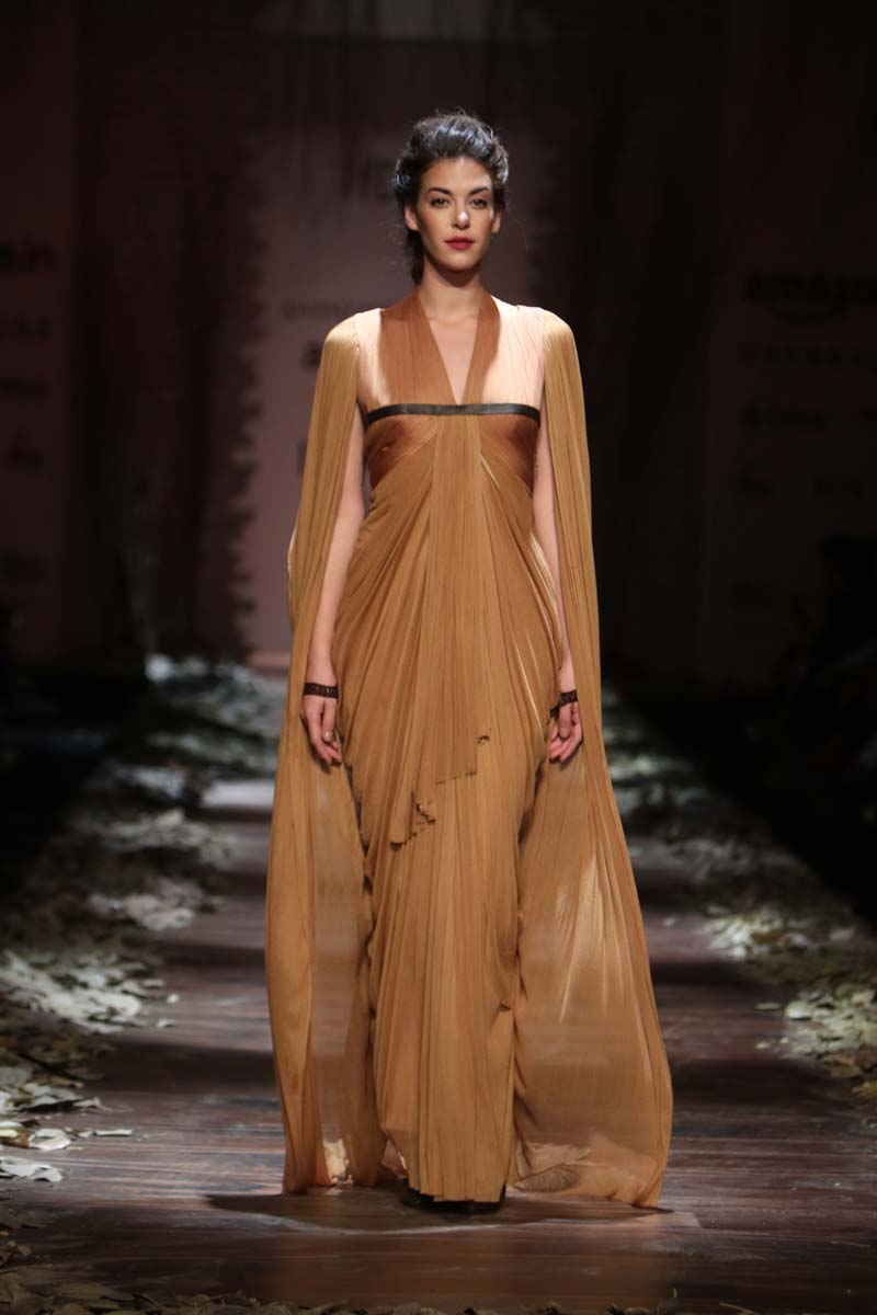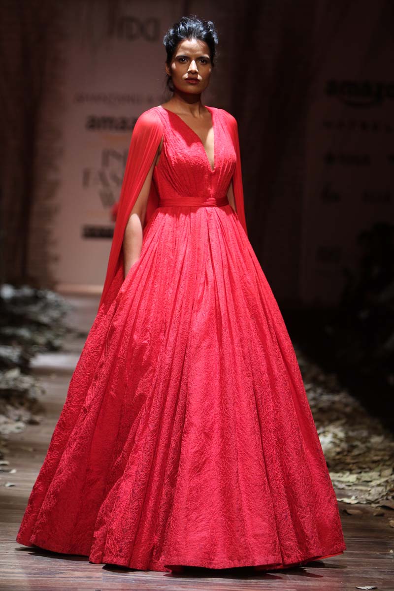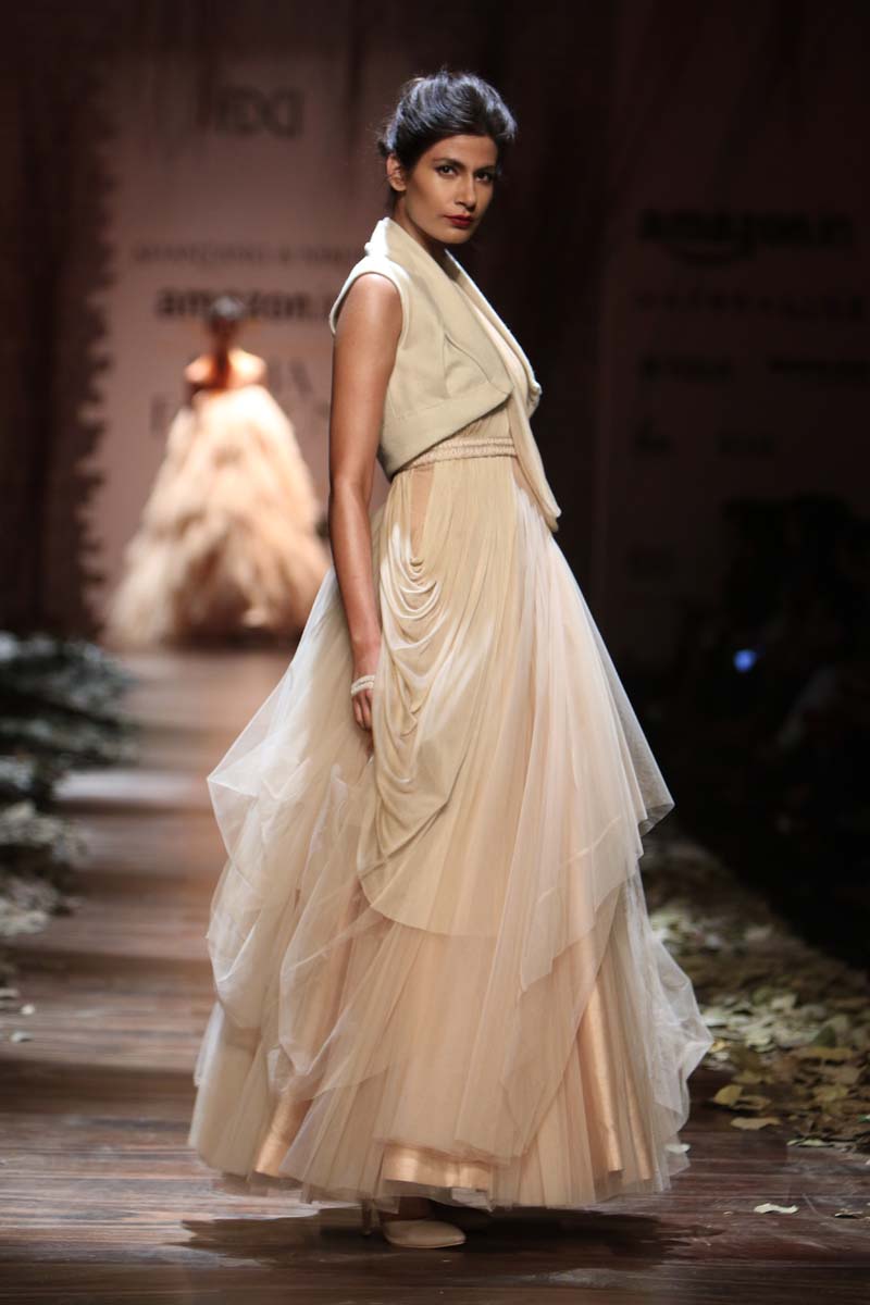 Always known to play contemporary in different shades of emotions, This season Shantanu & nikhil takes you through the unseen depths of mysticism and eerie opulence of a soul, once adorned by the most desired and entrancing woman of her time, a surreal portrayal of the undying luxury, the very essence of our muse. Capturing this essence through signature drapes and fluid fabrics teamed with the rich hues of reds and tonal beiges, ornate with delicate tonal textures, Shantanu & Nikhil present to you “The Last Walk”.