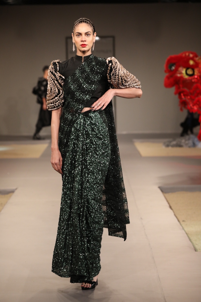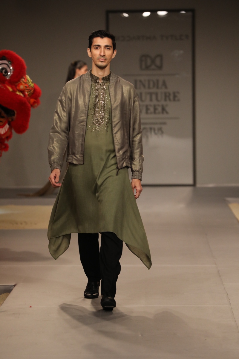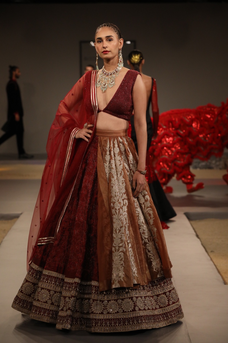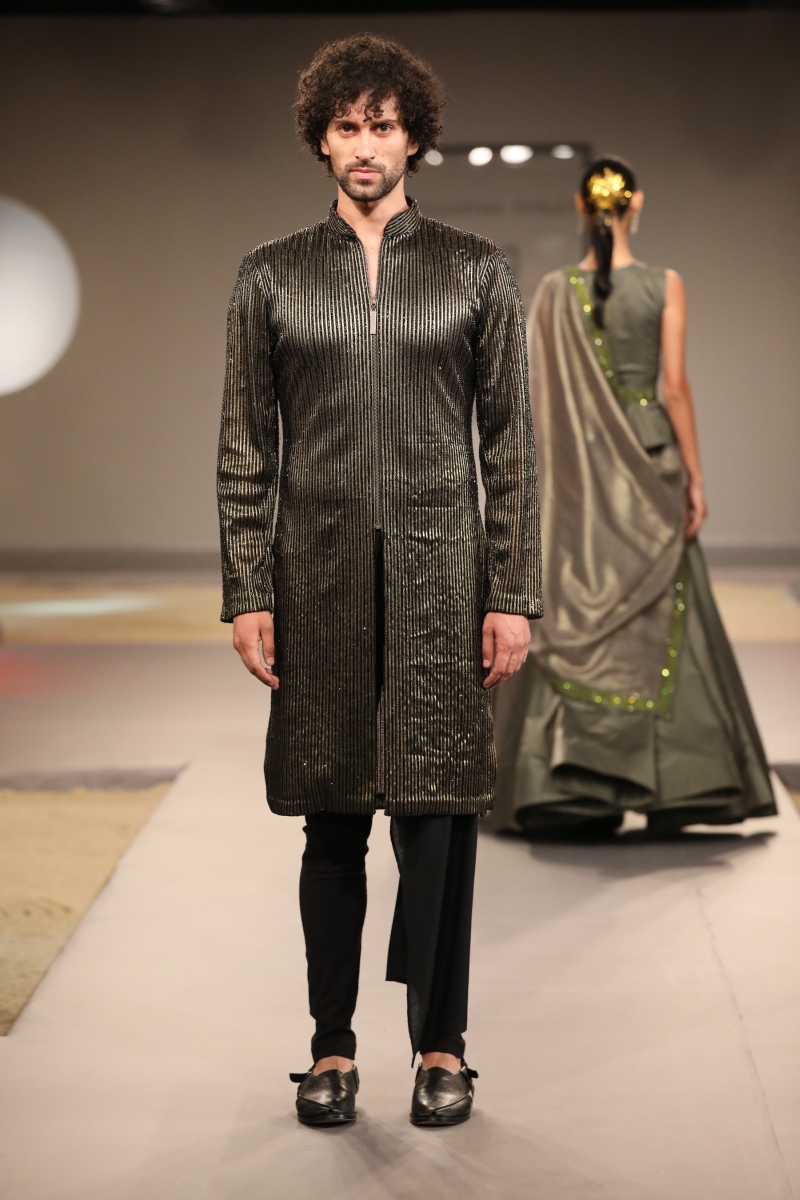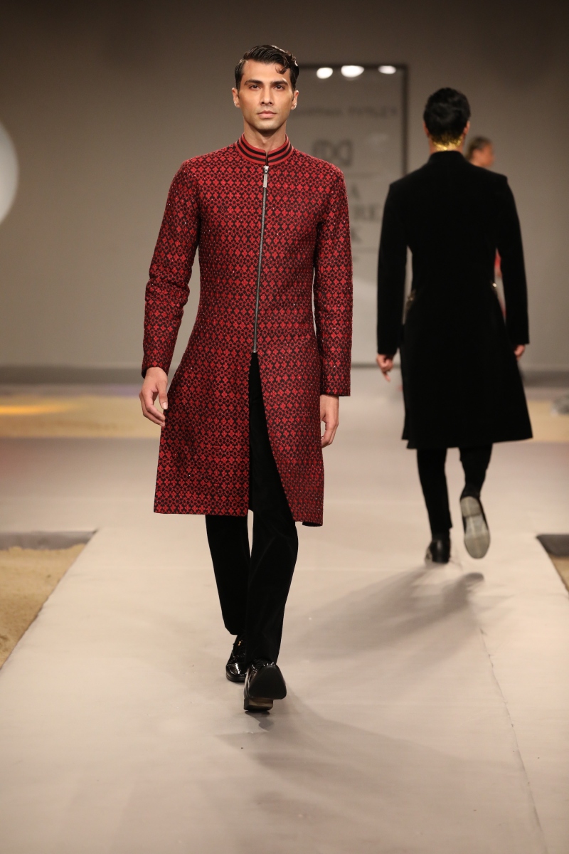 The color palette this season has drawn inspiration from the jewel tones such as maroon, navy, olive, charcoal and our staple black. Sticking to the brands ethos, we will be layering our Indian looks with parkas, trenches, bombers and jumpers to give a casual, young, fresh look to couture. The surfacing this season comprises top-stitch, sequin overlay, quilting and heavy crystal embellishments in the form of patchwork.