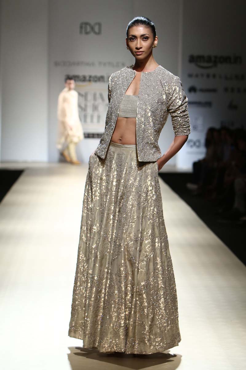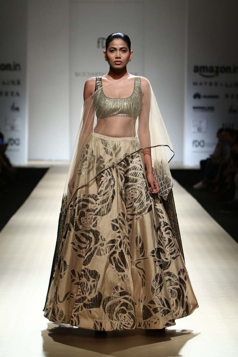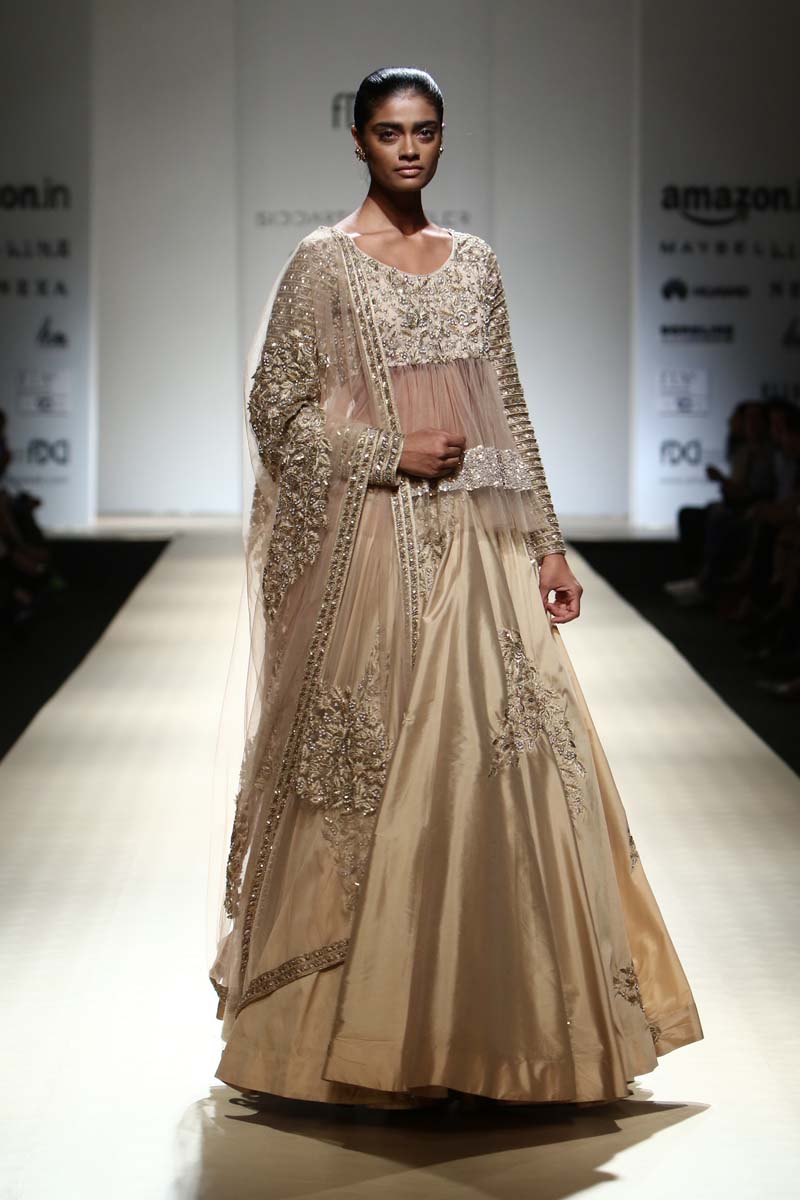 For SS17 our Couture collection is inspired by the Voyniche manuscript. Its heavy embroidered yet light in weight. Silhouettes are for the modern Indian bride for example the Lehnga are teamed up with Jacket.