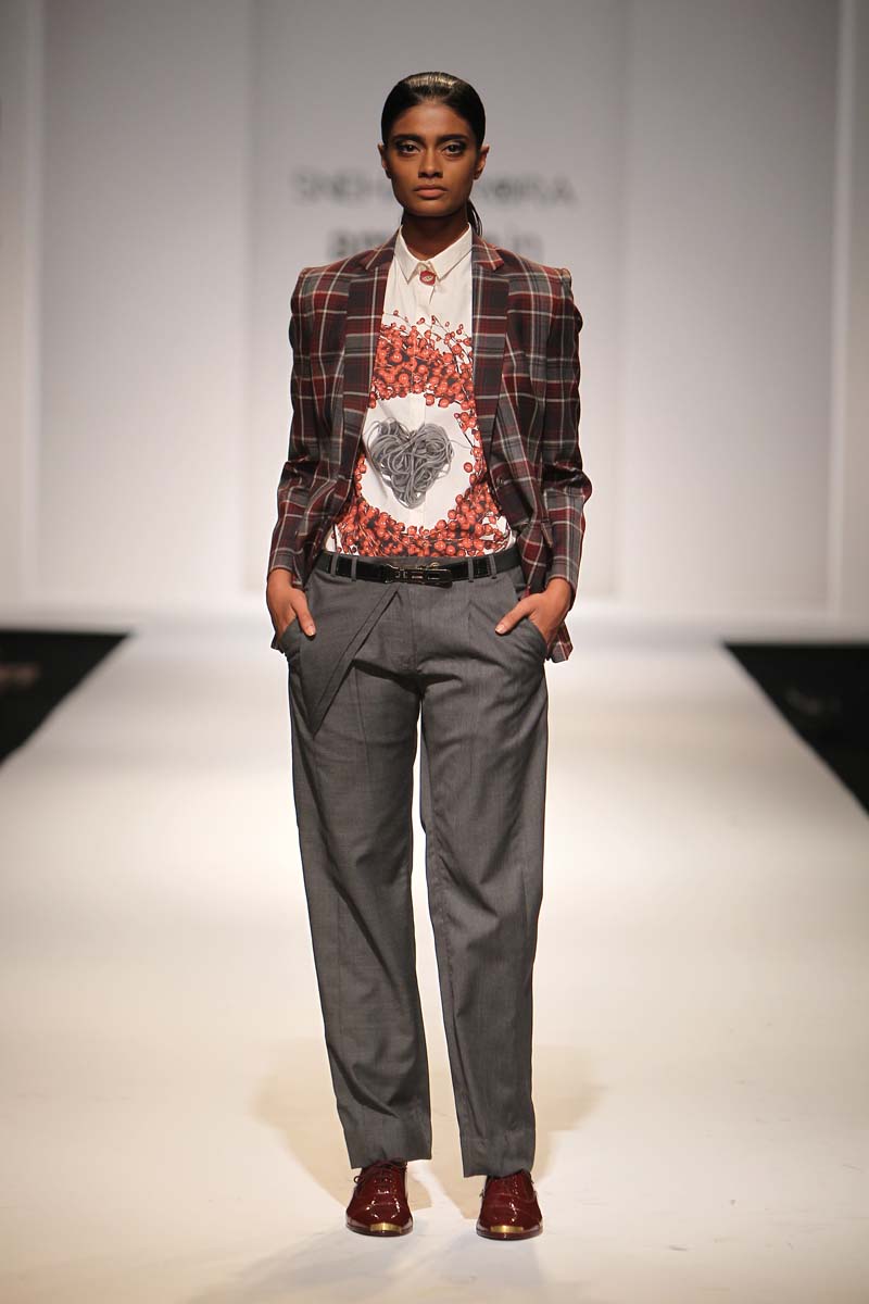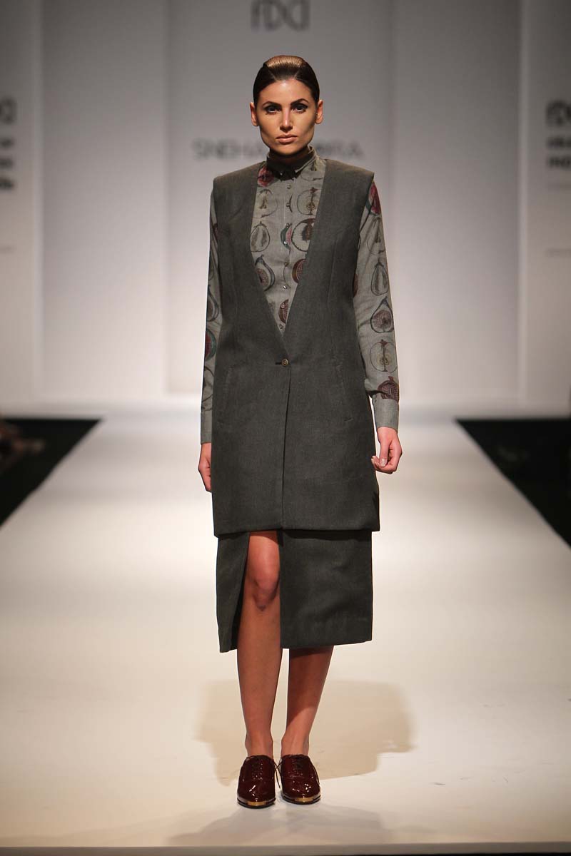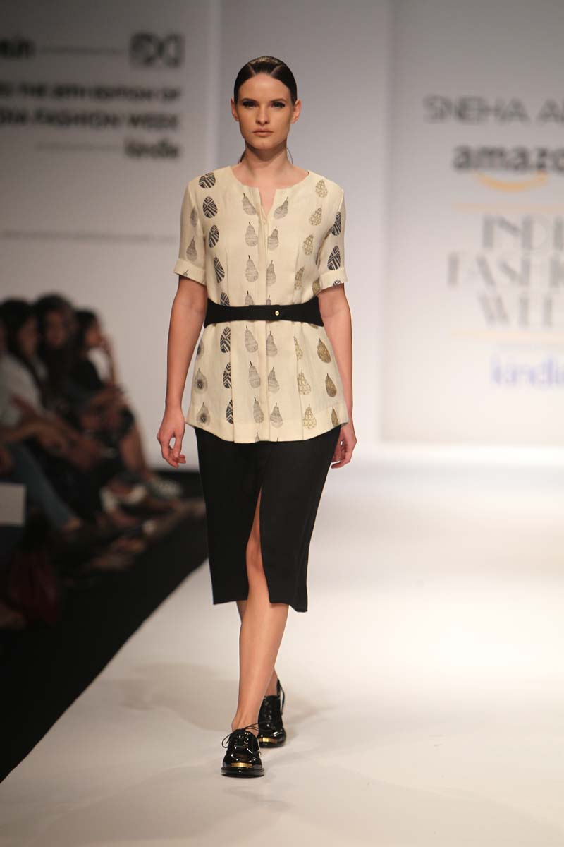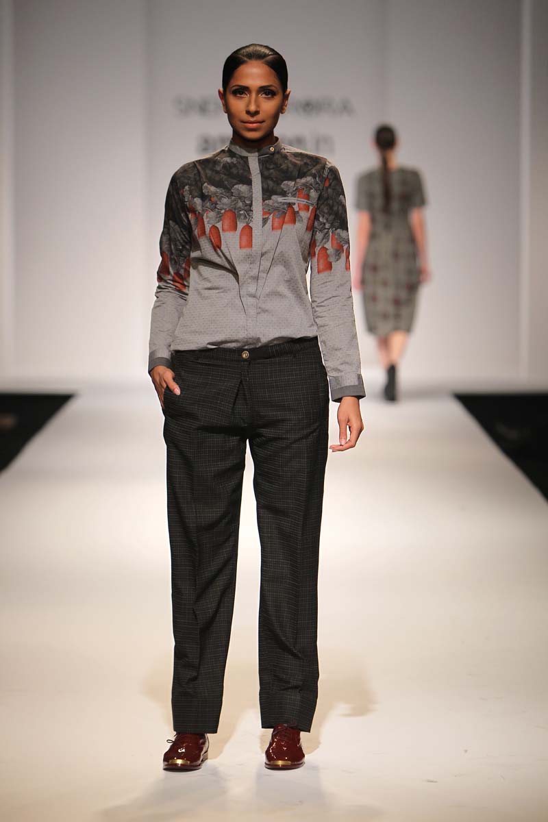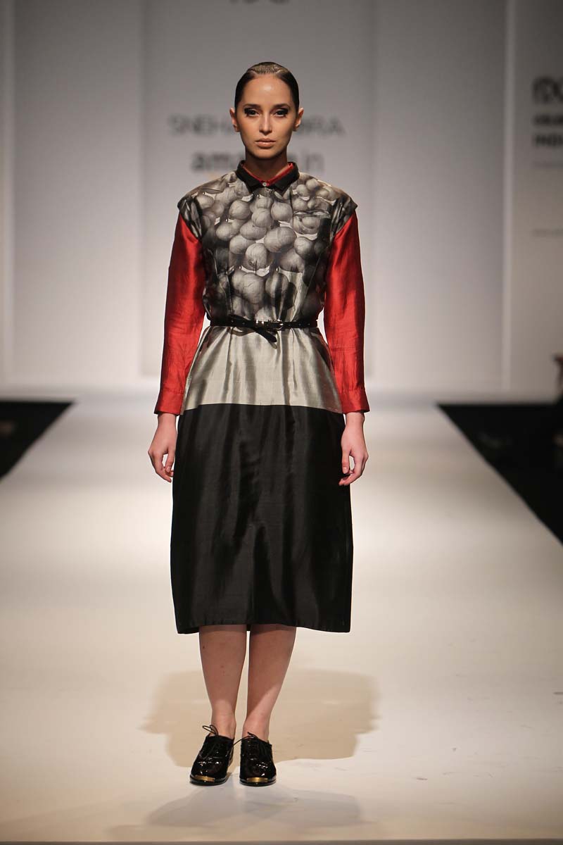 An alumnus of NIFT, Sneha Arora started her eponymous label in 2011 for the love of story-telling through design. The label recites a ladylike twist to masculine silhouettes. Staying true to their obsession for androgyny, the label addresses their clothes to young inspiring, self-dependent women. A combination of classic bodies with avante-garde detailing, structure with a flow, and modernity with a vintage twist, she loves combining contrasting elements to create love forever pieces.n n’APPETITE’- AW15 talks about food for thought…with prints ranging from the ‘mistress of spices’ to ‘knowing your onions’ the collection curbs your hunger for food and thought. So this autumn winter its time for some ‘EAT PLAY and LOVE’ cause if you STAY HUNGRY you’ll have to STAY FOOLISH.n n nBuyers Contact:nSneha AroranM: +91 9830372601nE: snehaarora08@gmail.comn nMedia Contact:nSneha AroranM: +91 9830372601