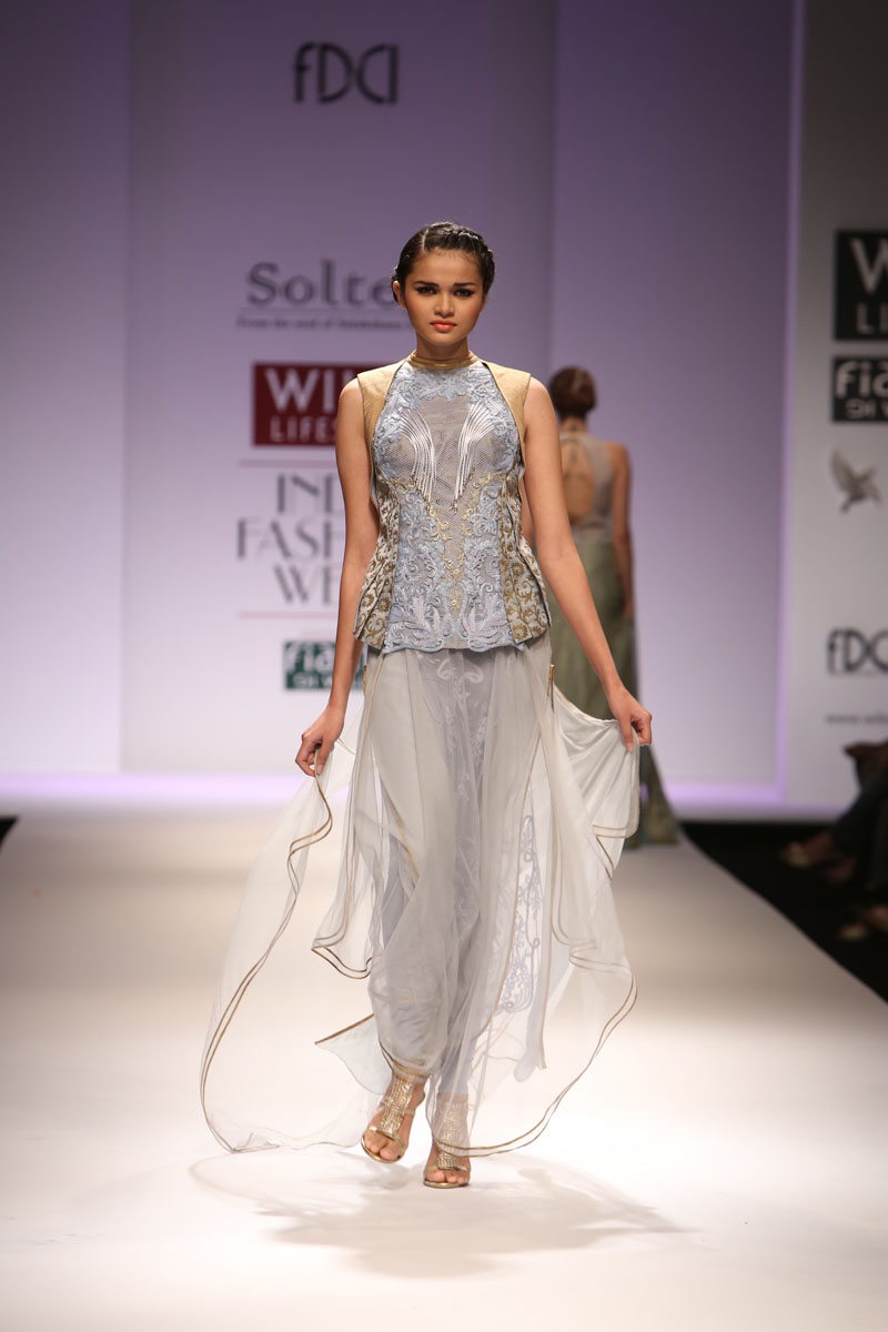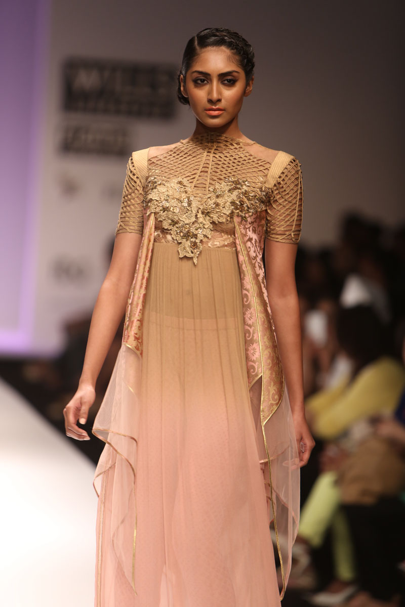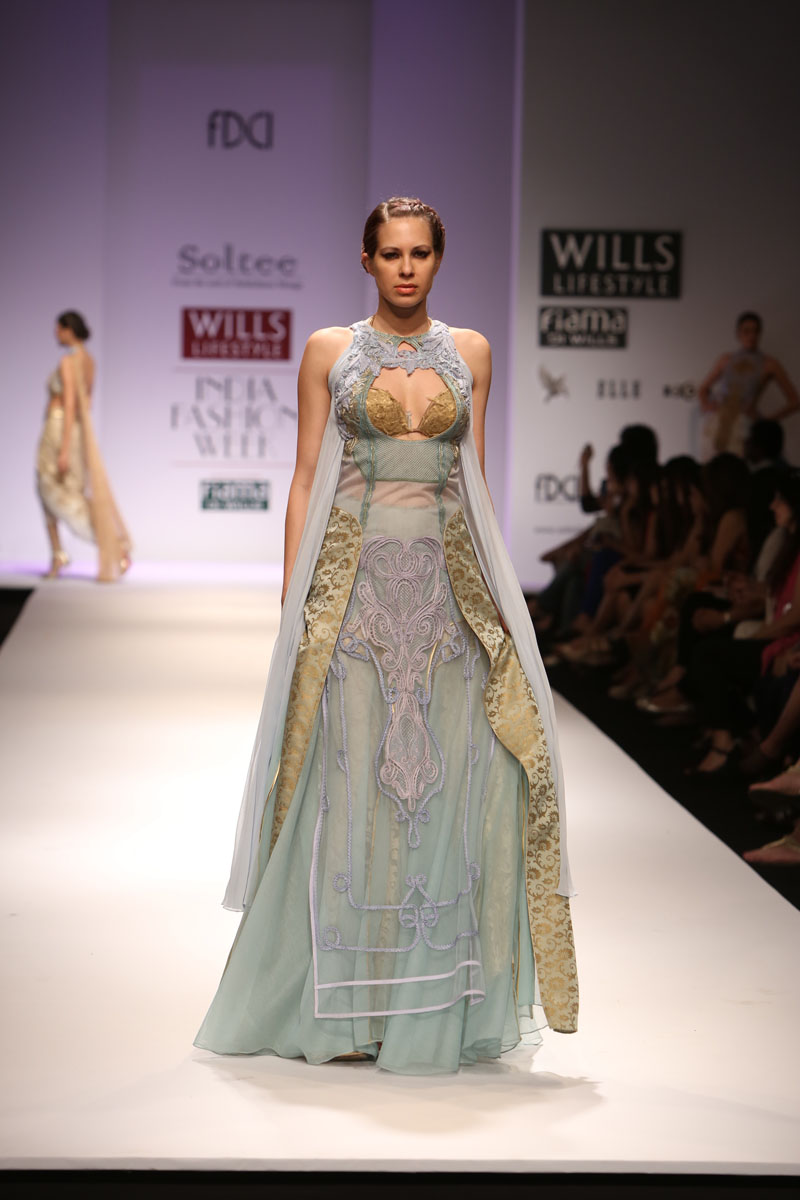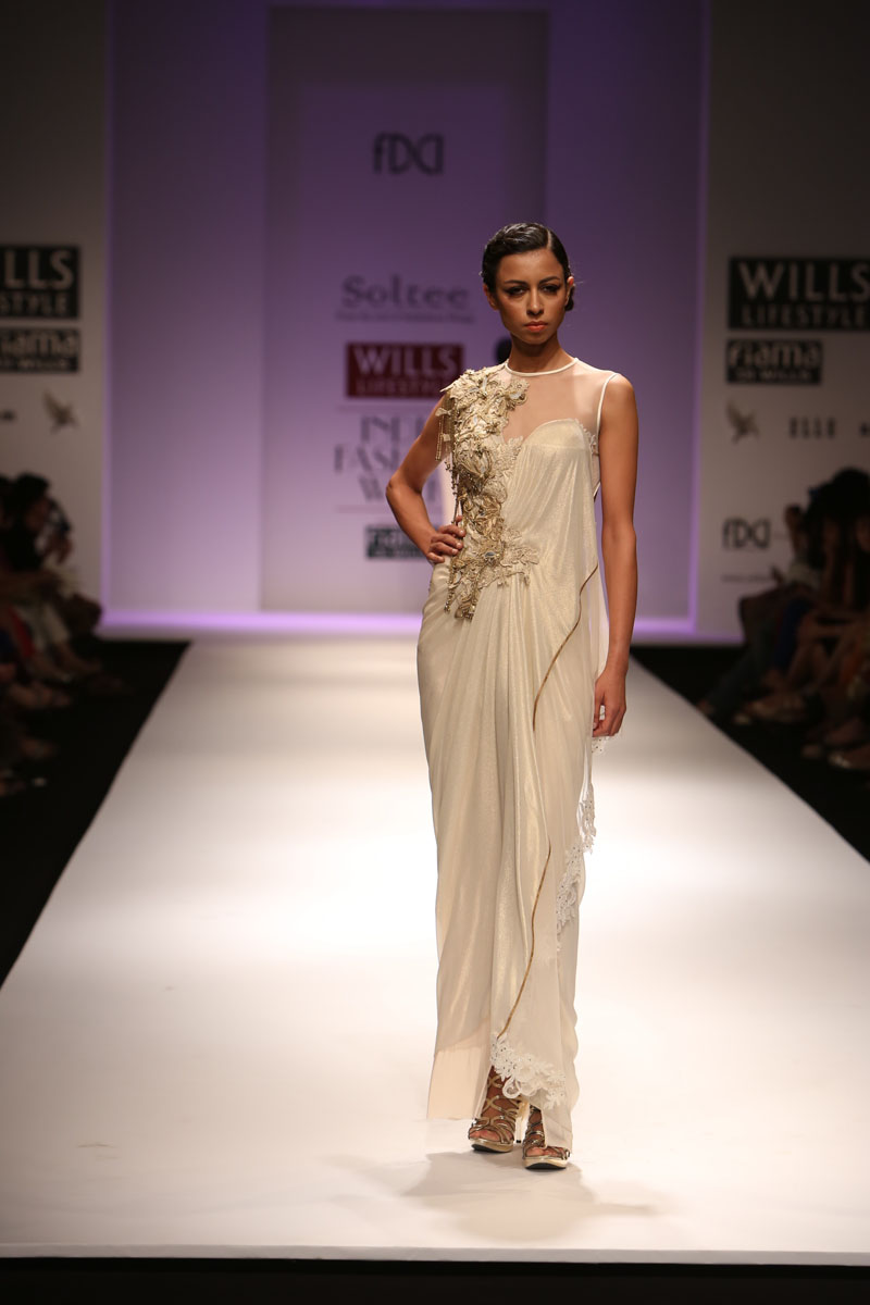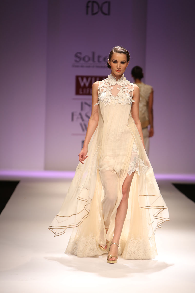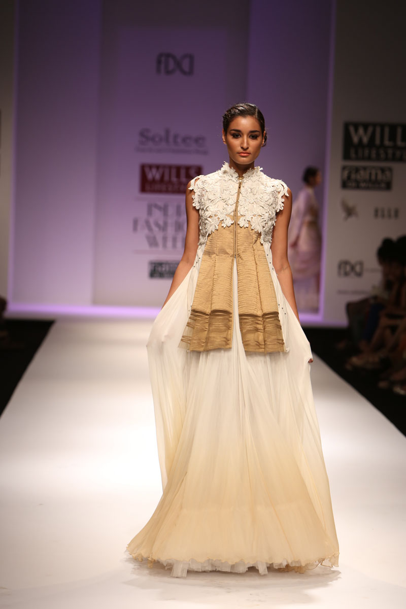 Her AW13 collection delves into hidden memories of its rich heritage to retrieve its profound opulence. Its a collection with a modern feel, perfect for an elegant International and Indian Woman. It has an expression of profound and intense creativity. There’s a lot of interplay between transparency and opacity …….fluidity and rigidity. Collection carries an A-symmetric and multilayered patterns with sharp cut sand straight edgy slits. There is an influence from architectural patterns and drapes supporting the same.