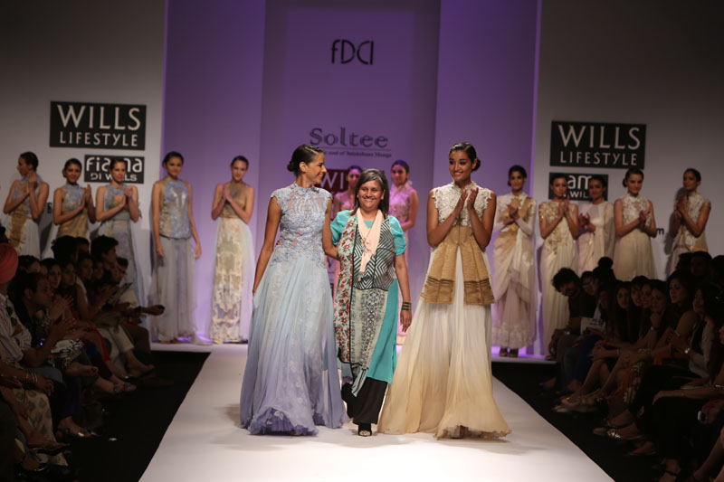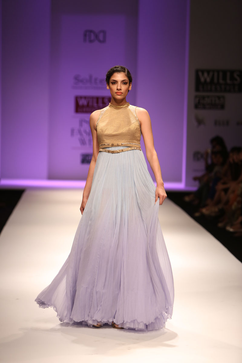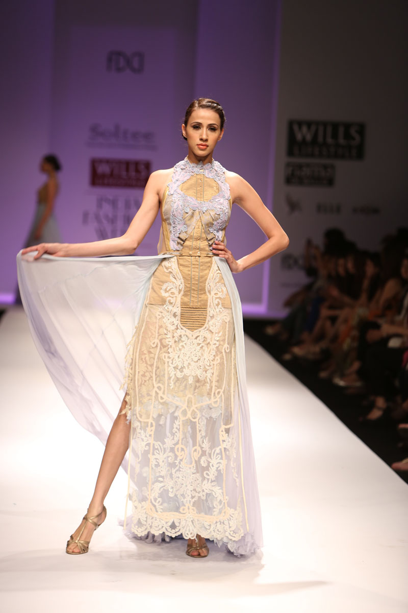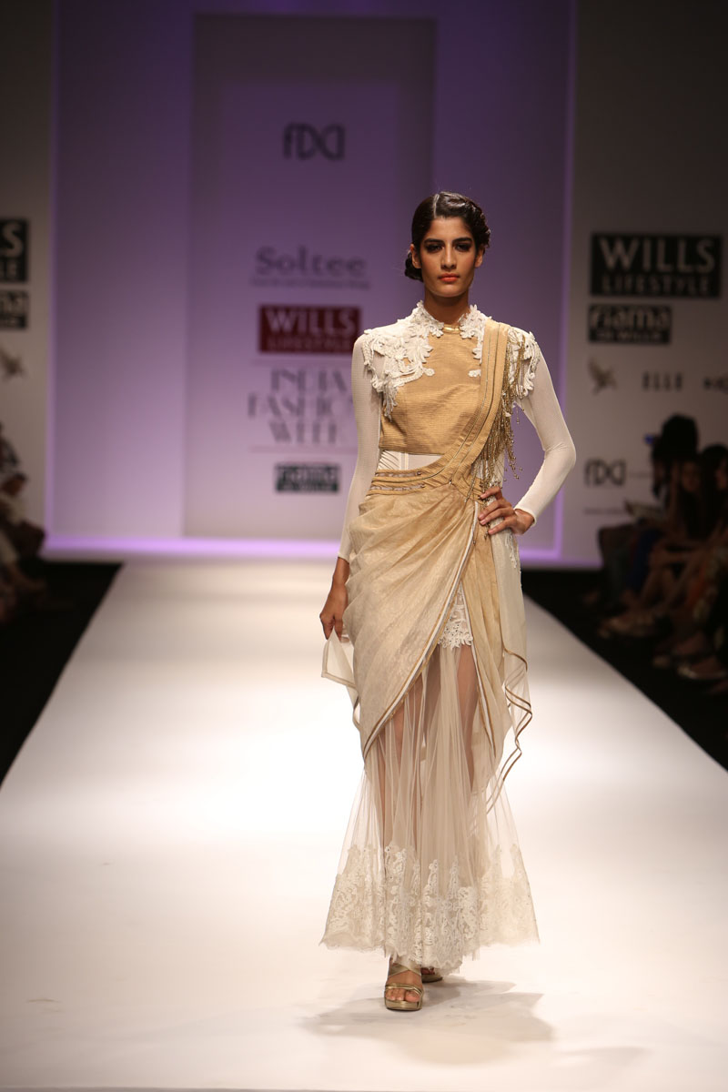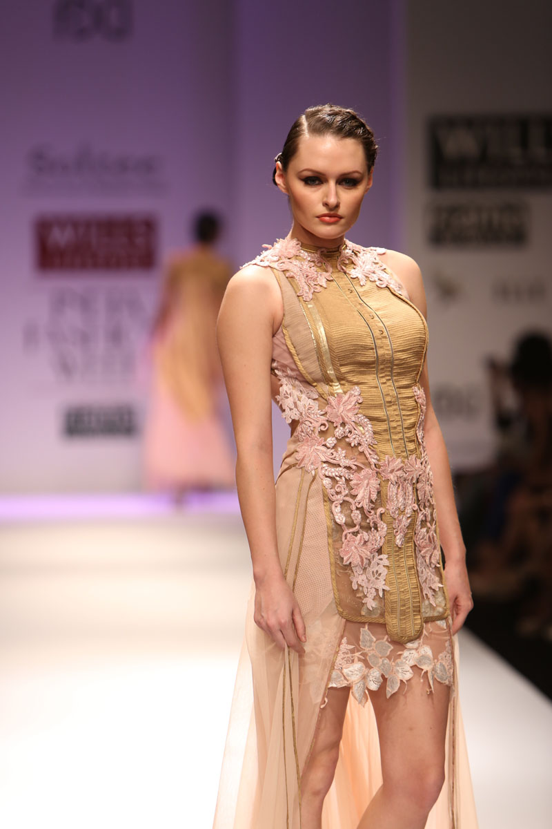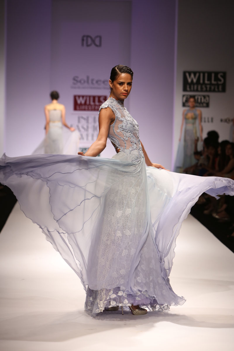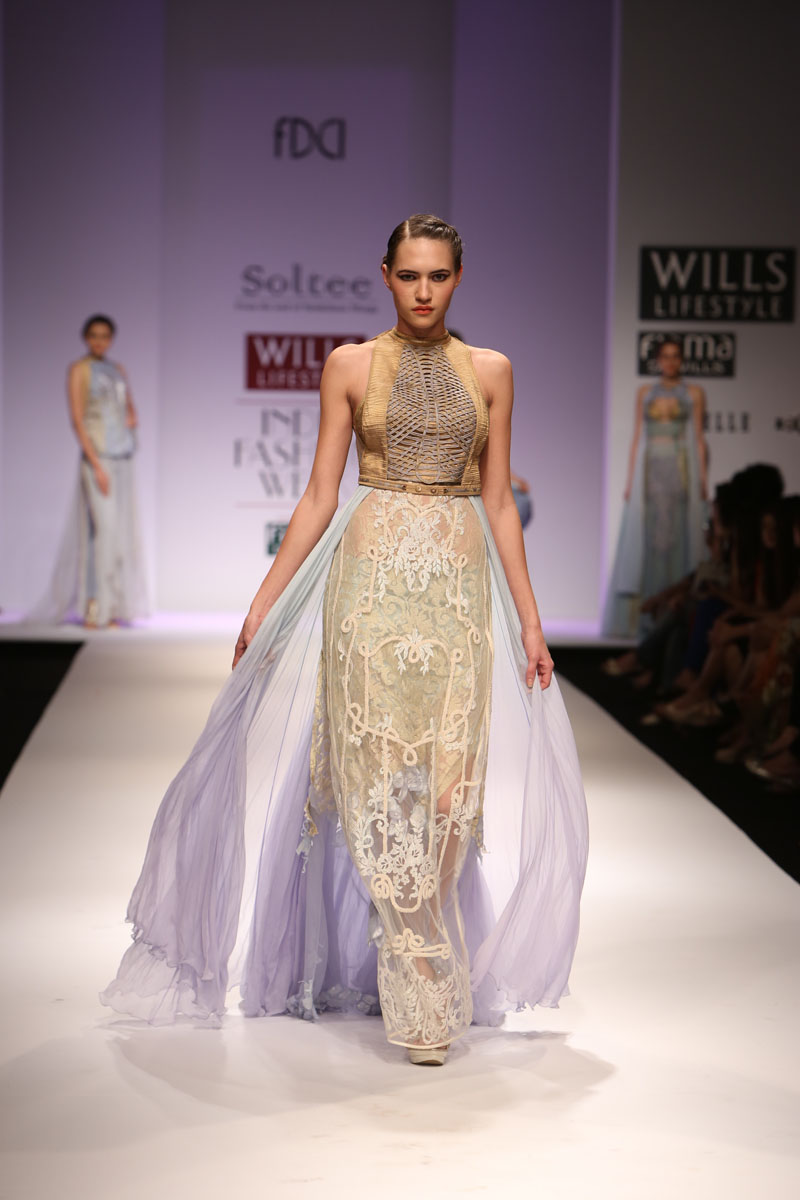 Her AW13 collection delves into hidden memories of its rich heritage to retrieve its profound opulence. Its a collection with a modern feel, perfect for an elegant International and Indian Woman. It has an expression of profound and intense creativity. There’s a lot of interplay between transparency and opacity …….fluidity and rigidity. Collection carries an A-symmetric and multilayered patterns with sharp cut sand straight edgy slits. There is an influence from architectural patterns and drapes supporting the same.