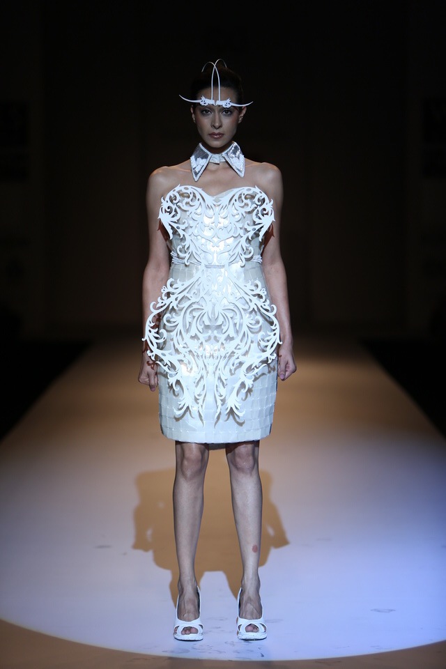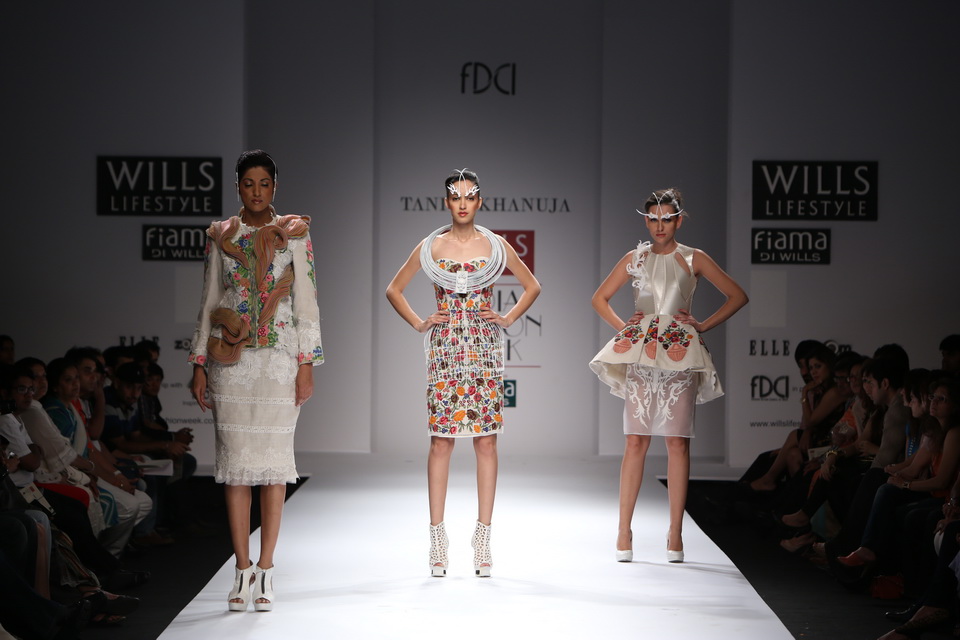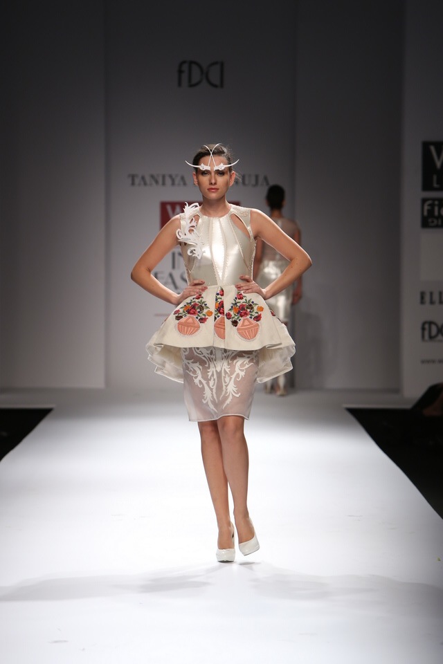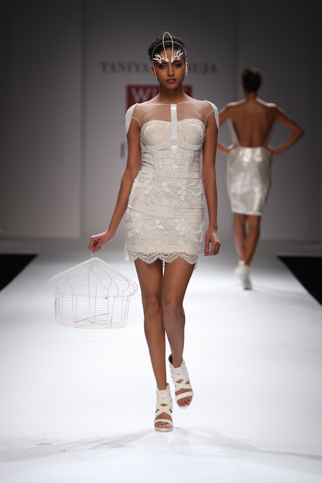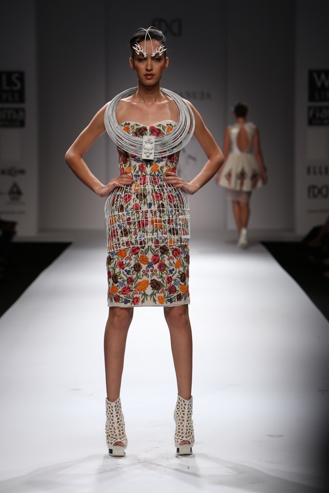 Her SS 13 collection is titled ‘Flight of the wingless soul’. From bold laser-cut geometrical patterns to fine pearl finish sequin sheets, this collection rules the land of white. A limitless, divine bird, from which colour breaks forth has consented to be tenderly caged in these dresses for mortal eyes that may rejoice in its benign brilliance.