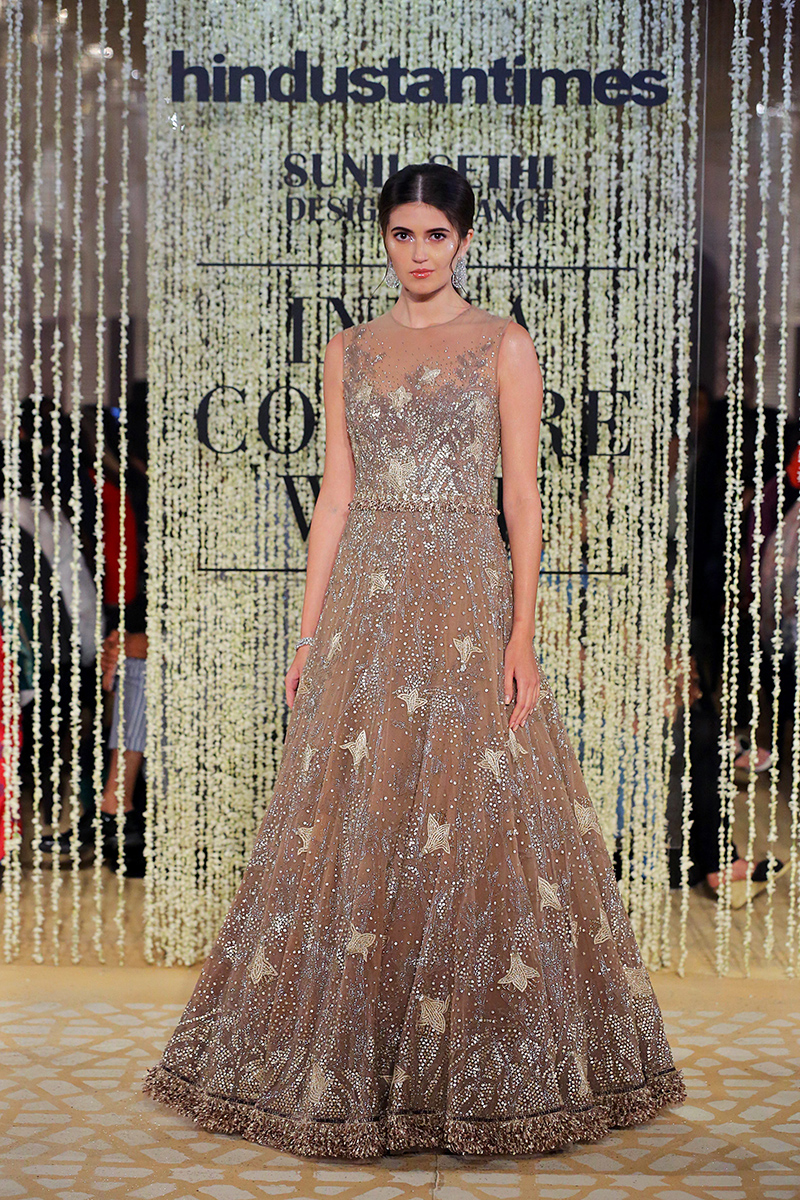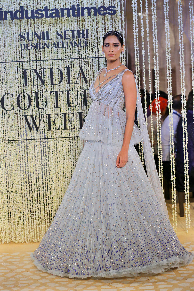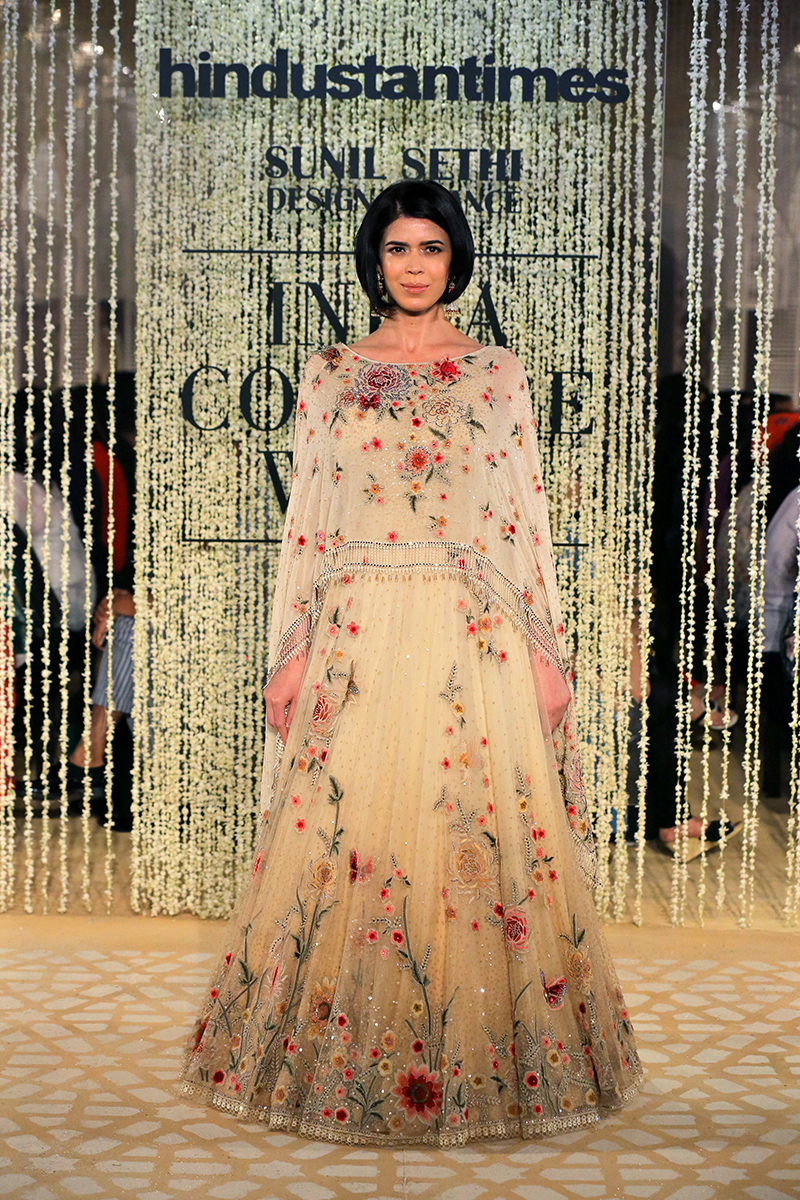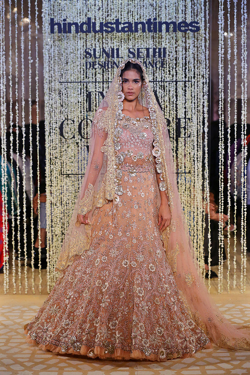This year, his collection is titled as, “In Elysium : An Ethereal Lightness of Being”. In shimmering florals and weightless drapes, the mythical paradise of Elysium is recreated through the decadent lightness of Tarun Tahiliani Couture & Bridal Wear 18-19. Evoking images of paradise and angelic gardens, where gods and goddesses wander, gossamer panels are rendered in an ethereal lightness of being. Delicate gossamer-wrapped silhouettes are lifted in their Elysian inspiration through the intricate craftsmanship of an atelier in pursuit of lightness.