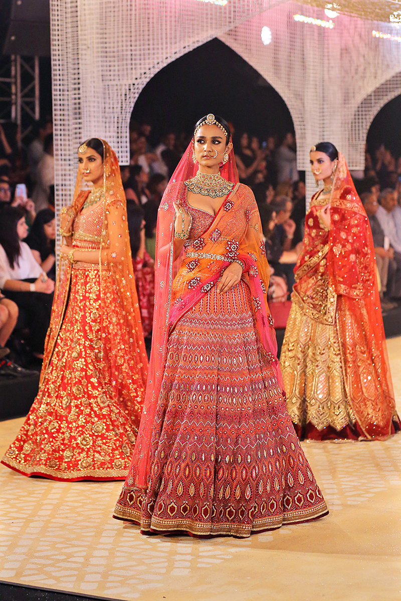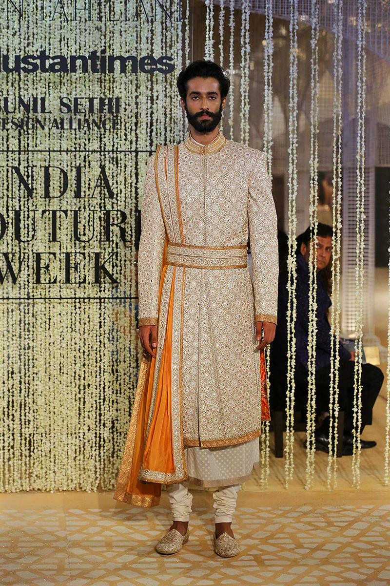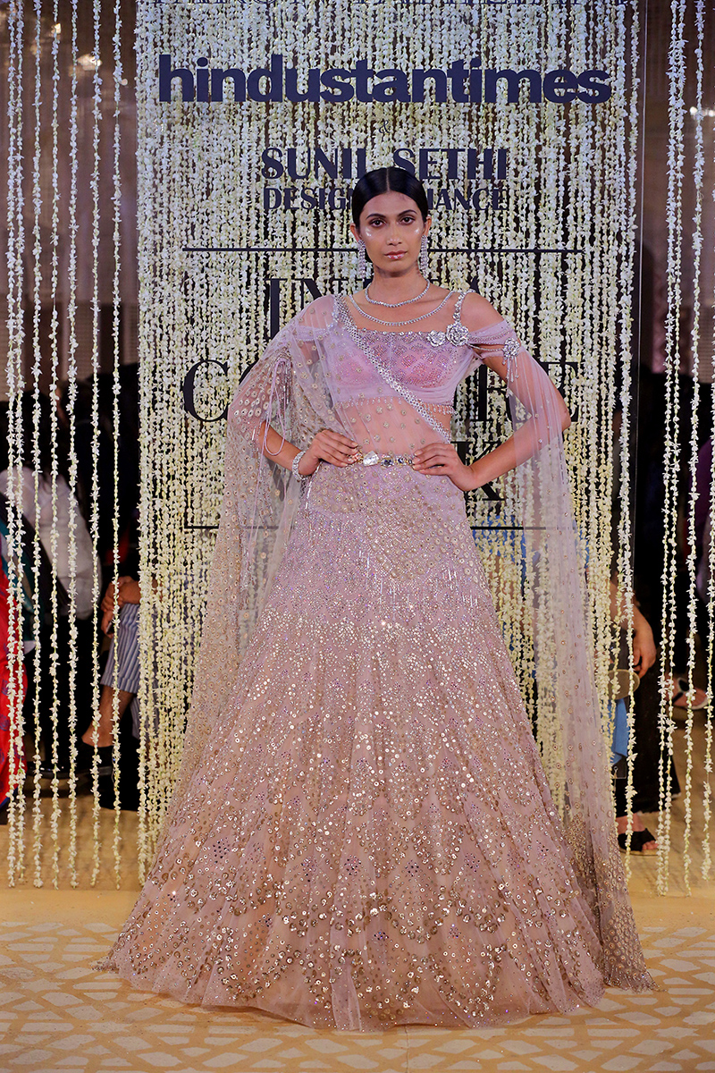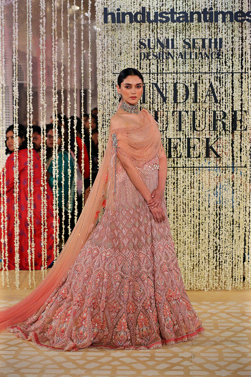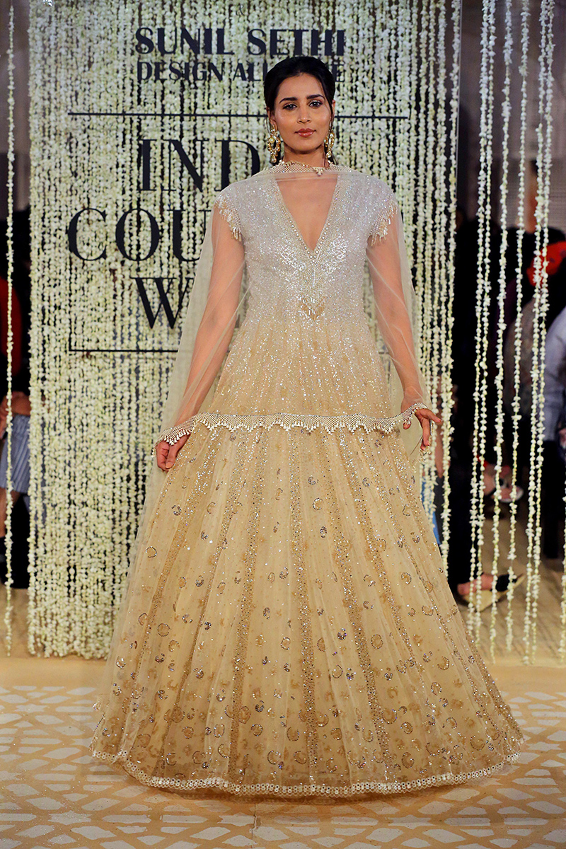 This year, his collection is titled as, “In Elysium : An Ethereal Lightness of Being”. In shimmering florals and weightless drapes, the mythical paradise of Elysium is recreated through the decadent lightness of Tarun Tahiliani Couture & Bridal Wear 18-19. Evoking images of paradise and angelic gardens, where gods and goddesses wander, gossamer panels are rendered in an ethereal lightness of being. Delicate gossamer-wrapped silhouettes are lifted in their Elysian inspiration through the intricate craftsmanship of an atelier in pursuit of lightness.