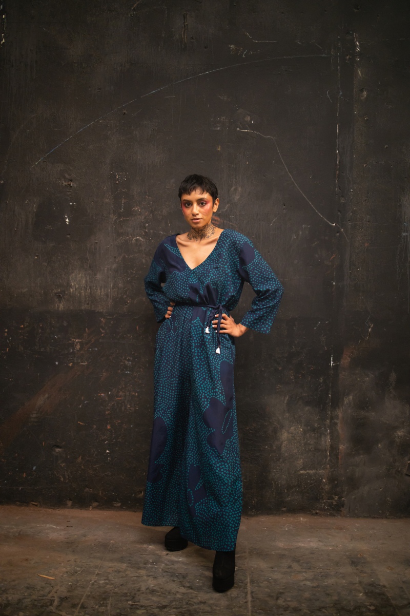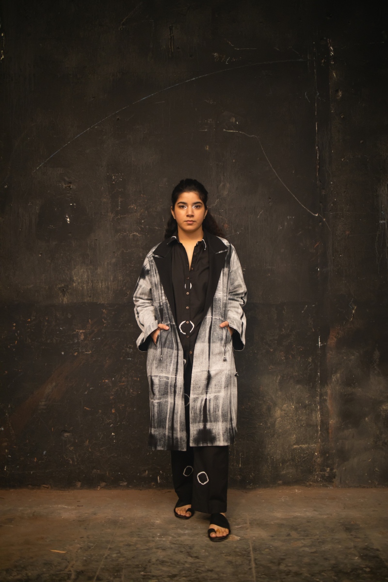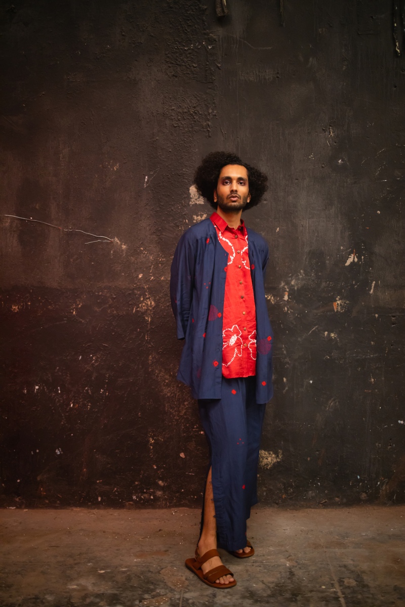 The brown, sheer, organza tunic with cubic Bandhani motifs will surely cause a fashion tussle between HIM and HER, as it was an ideal gender-neutral option. Gender fluidity was apparent for the button less jacket, shirt with placement print and soft robe with a slit skirt in red and indigo. The long-sleeved, belted maxi, black and white trench coat and the 50/50 print for the ink blue blouse and pant, as well as the fuchsia, printed jumpsuit, will move effortlessly through wardrobes.
