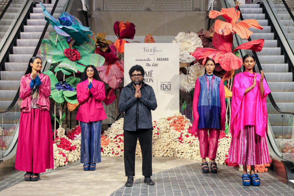 The opening show of the LFW X FDCI by Anavila Mishra and Gaurav Jai Gupta along with in house designers from The Kunj displayed the prowess of the sari, which is now not restricted by pleats and palla but has found a new disposition—jackets, Obi belts and knots. By Asmita Aggarwal Imagine being surrounded by art, culture and heritage, at the first glance at the roof of The Kunj, by the Ministry of Textiles, you are smitten by saris Ikkat, Pathani, Kota Dorias, Mekhla Chaddars, Narayan Peths, Sambalpuri to Maheshwaris, draped in Origami, by the inimitable Ankon Mitra, as you glance up. The waft of mogras on your wrist, and the cobbled ramp complete with wicker flowers, could there be a more befitting opening for the FDCI X LFW? After all, India is a nation known for its hand work, intricacy, and design thinking. The carved wooden pillars Chettinad style strike you, with their austerity on all three floors. Though everyone’s favourite undoubtedly was Suhail Bhan a Kashmiri Pandit, who has been perfecting the art of Bharatnatyam, setting the flow with his dexterous presentation. “I started learning dance when I was 12, learning from Justin, an American! I practise two hours daily, and teach also. Some are surprised to see men dancing, but they look so beautiful, it is an altogether different energy. Today there was more improvisation, as we danced for 20 minutes. Dance is about grace, control, and expressions, as well as how you involve the audience in your journey. I sing also, learnt for a year, it helps in dance,” says Suhail. Live music by classical singer Deveshi Sahgal began the opening show by Anavila Mishra, muslins and her unabashed love for whites. But what’s new is the sari is no longer being worn with palla and pleats, but jackets. “Sarmast”, references the Deccan, from the state of Wajd, thus the ode to handwoven linen, but it was a joy to see the Kerala Kasavu sari rubbed shoulders with pant suits on the notes of Aaoge Jab Tum by the inimitable Ustad Rashid Khan, an eternal fav. Saris came with Obi belts, trench coats, roomy Japanese jackets, telling us there are many ways to wear them. Blush pink looks fab in handloom cotton, as Kimono-style jackets revved up saris, lace bows in the hair completed the look. The show had “The Edit” by seven in-house designers of The Kunj curated by DC Handlooms Amrit Raj. “The look that we presented was entirely woven from waste like all our products, we showed styles on a male model, but all four garments are unisex. The kurta is a kurta dress, then a two-way top, jacket was reversible. The Kunj has been a great place for us to meet customers, and design for them accordingly, generating this level of work with artisans. We upcycle other people’s waste, this is my first experiment with B 2 C, it’ll help develop a deeper relationship with the customer,” says Bhavya Goenka of the label Iro Iro. Pedal looms we have used, natural dyes, extra weft technique to weave waste, Rohingya refugees have embroidered on linen. Interestingly, the belt has arrived and so has the long jacket, the broader the better, the Kutchi mirror work jackets, Ikkats in maroons, traditional saris draped almost sinuously around the body, pleats misplaced and palla disappearing, gave a peek into how innovatively the sari has metamorphosed.