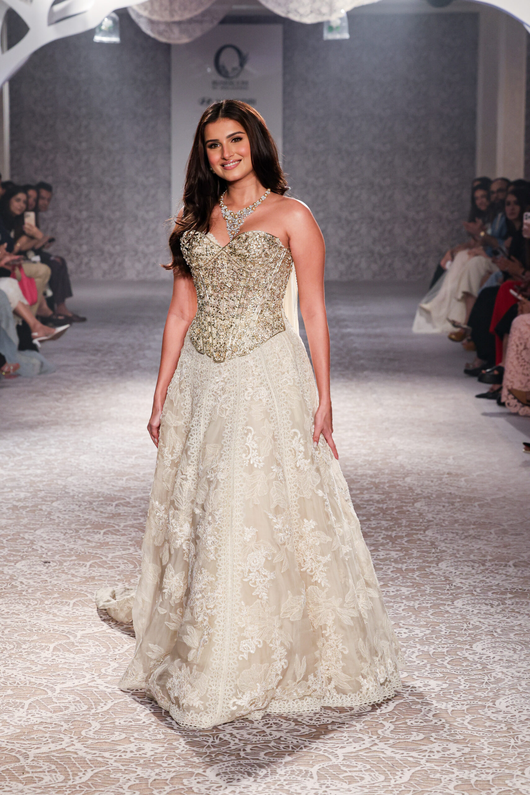 It was a set that kept the mood light and frothy—white, lace, dimly lit, as velvety carpets channeled luxe along with silver candle stands gracefully placed. An army of eager cameramen, pouts, sea of kitten heels, Herve Leger style bodycon dresses, off the catwalk (there in), gave competition to the dainty lehengas armed with sporty jackets, capes, gilets, and a whole lot of quiet glitter that Isha Jajodia gave us for ICW 2025. Bonus: there isn’t one way to wear a lehenga, and yes you can add a little drama with lace trails and charming pearls dancing on lehengas.